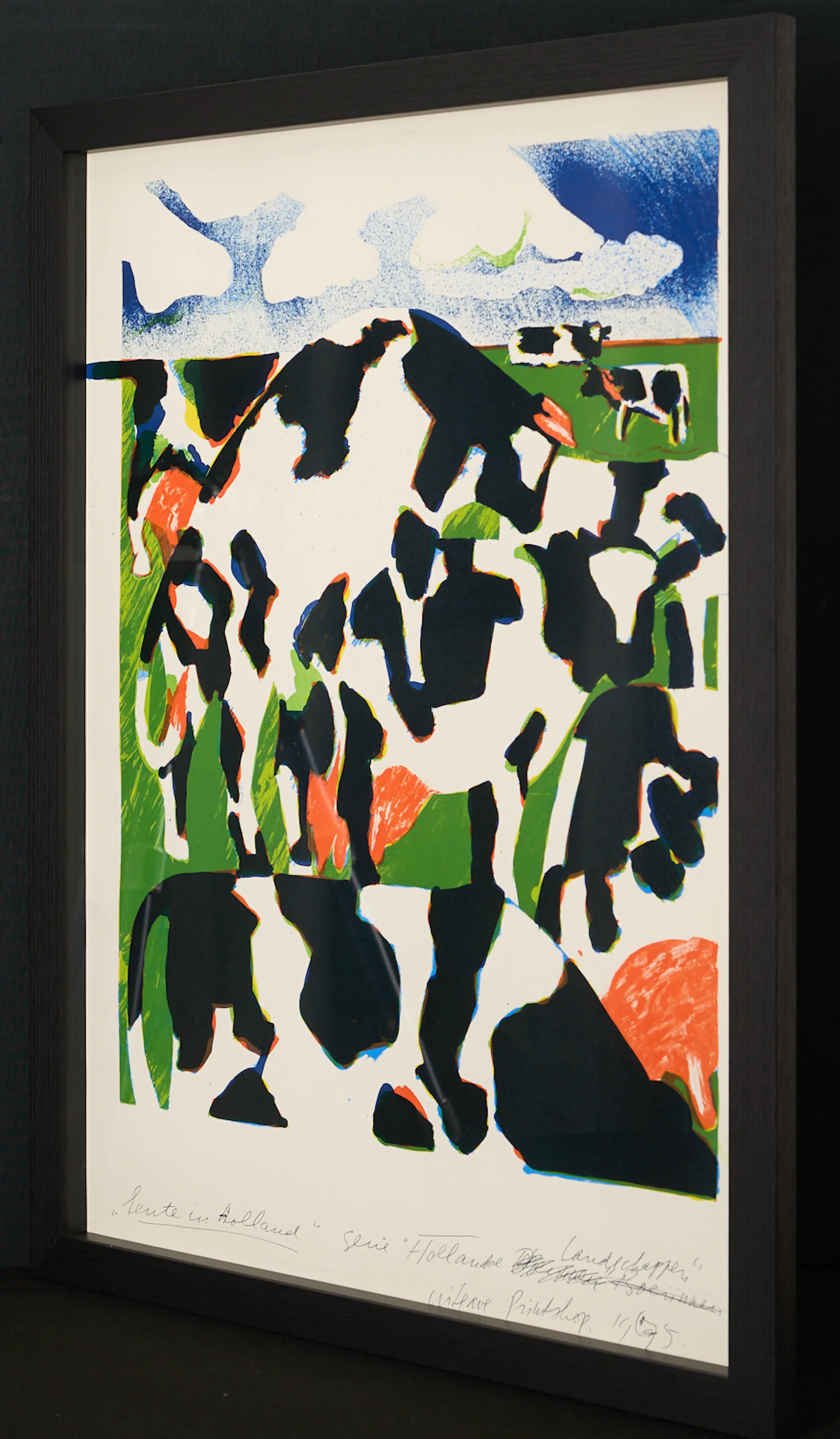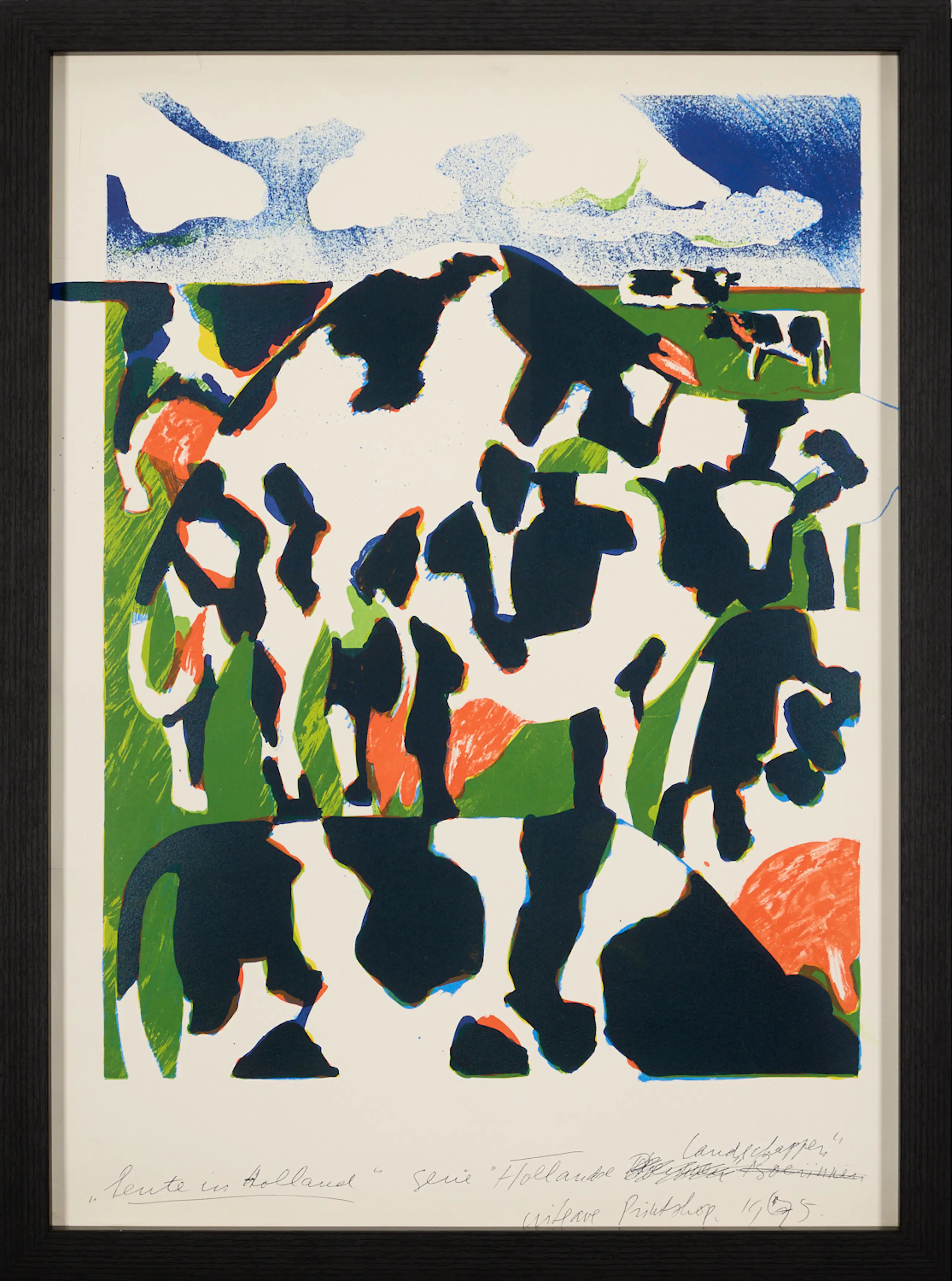 Die Lithografie zeigt eine farbenfrohe, energiegeladene Darstellung grasender Kühe in einer typisch niederländischen Landschaft. Frische Grüntöne, kontrastreiche Schwarz-Weiß-Flächen sowie expressive Akzente in Rot und Blau verleihen der Komposition eine dynamische Lebendigkeit und ein unverkennbares Frühlingsgefühl. Die spielerische Struktur und der rhythmische Bildaufbau machen dieses Blatt zu einem ikonischen Beispiel für Cremers unverwechselbare Bildsprache.