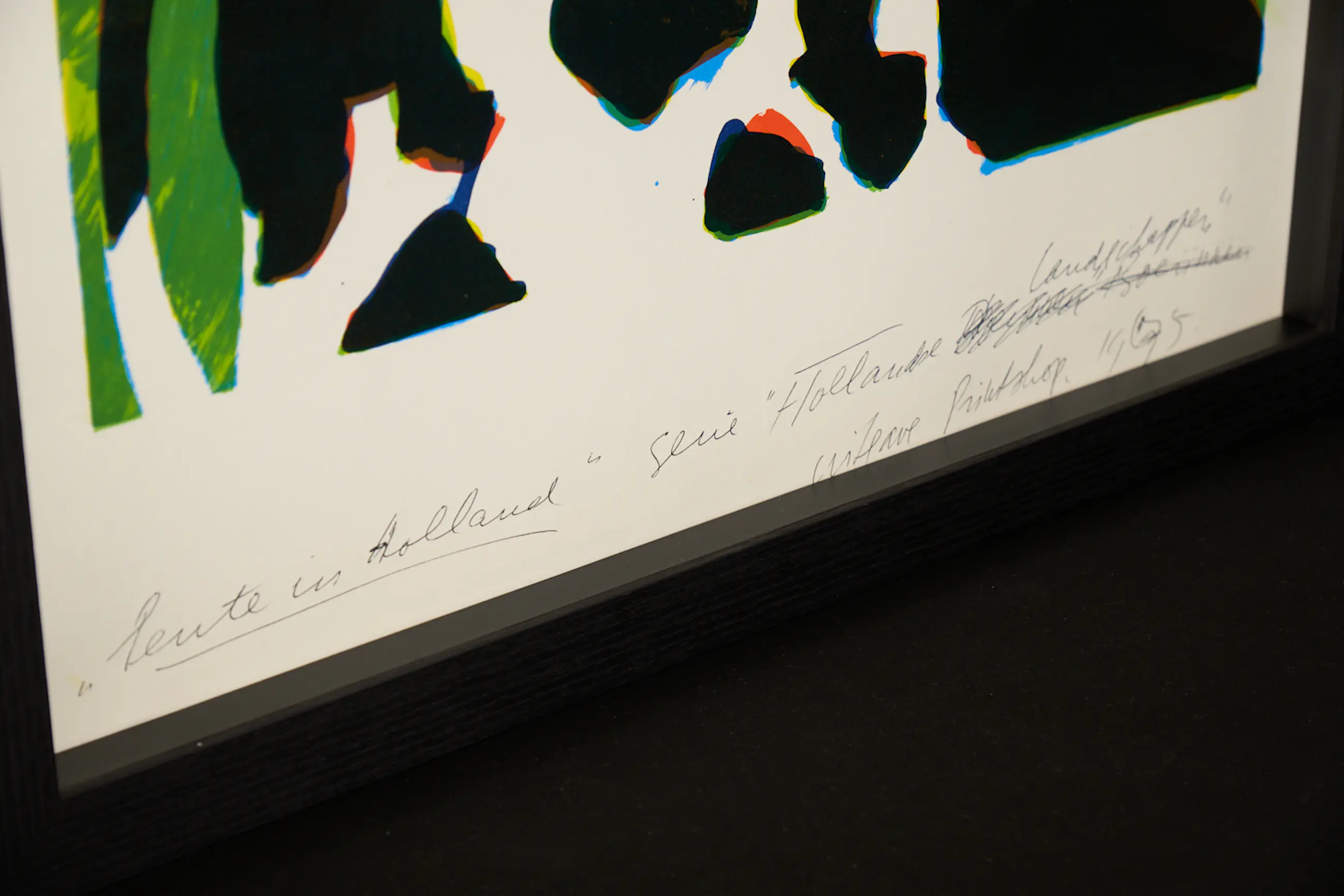 Auf der Vorderseite sind in Bleistift der Titel, der Herausgeber und die Datierung vermerkt: „Lente in Holland“, Serie „Hollandse Landschappen“, Uitgave Printshop 1975.