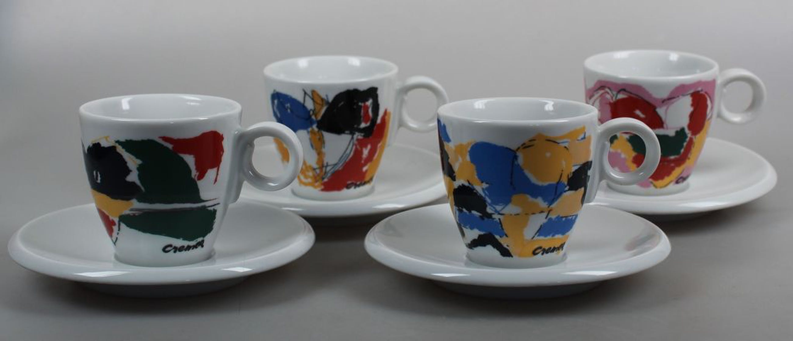 Vier espresso kop en schotels met decoratie door Jan Cremer. Porselein. Hoogte kopjes 6 cm en diameter schotels 12 cm. Gaaf.