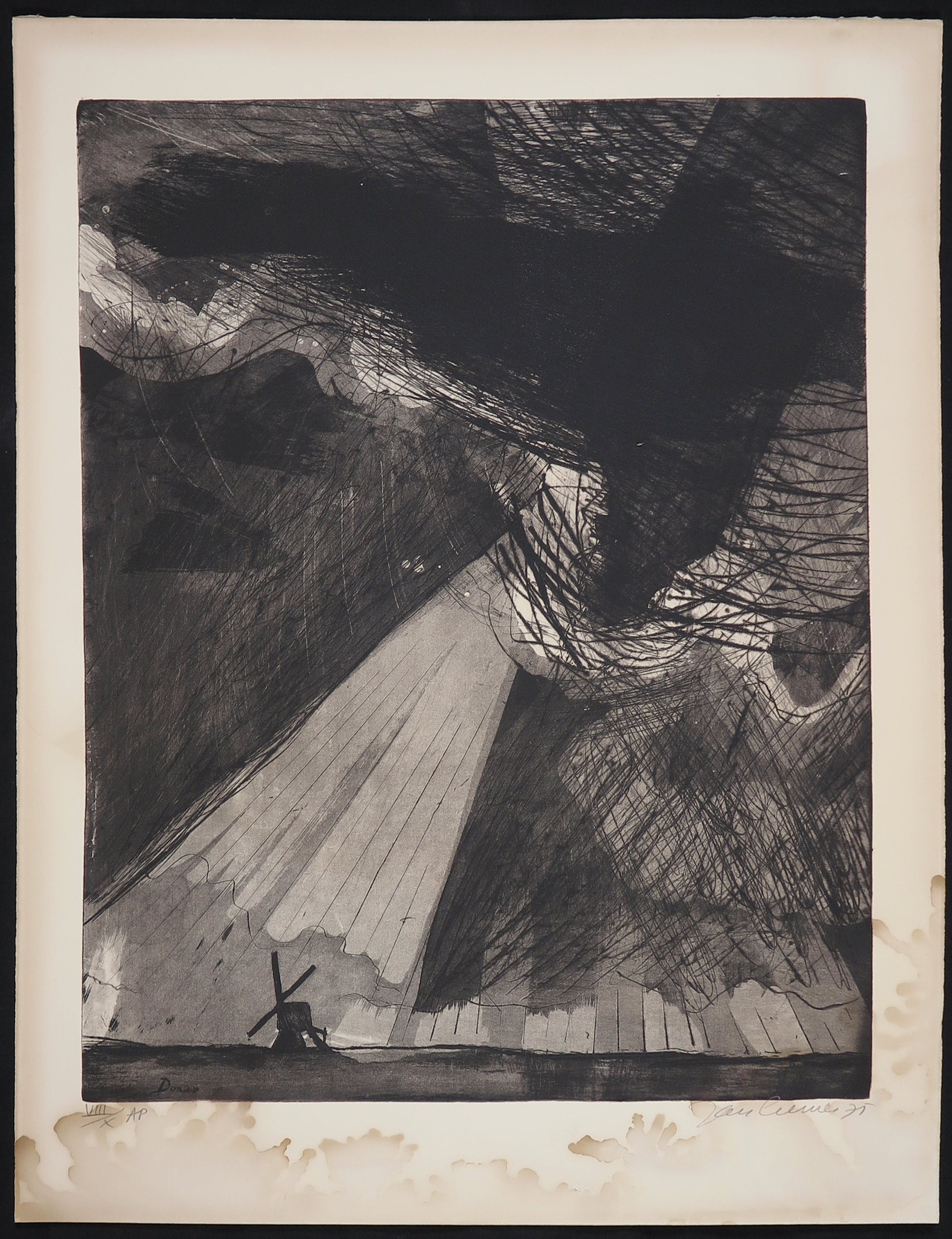 Het werk is verkleurd/vergeeld, en bevat vooral aan de onderzijde en rechtsonder vochtvlekken. Ook zit er een lichte golving in het blad. Door het gebruik van een passe-partout zal dit aanzicht verminderen. | |||||||||||