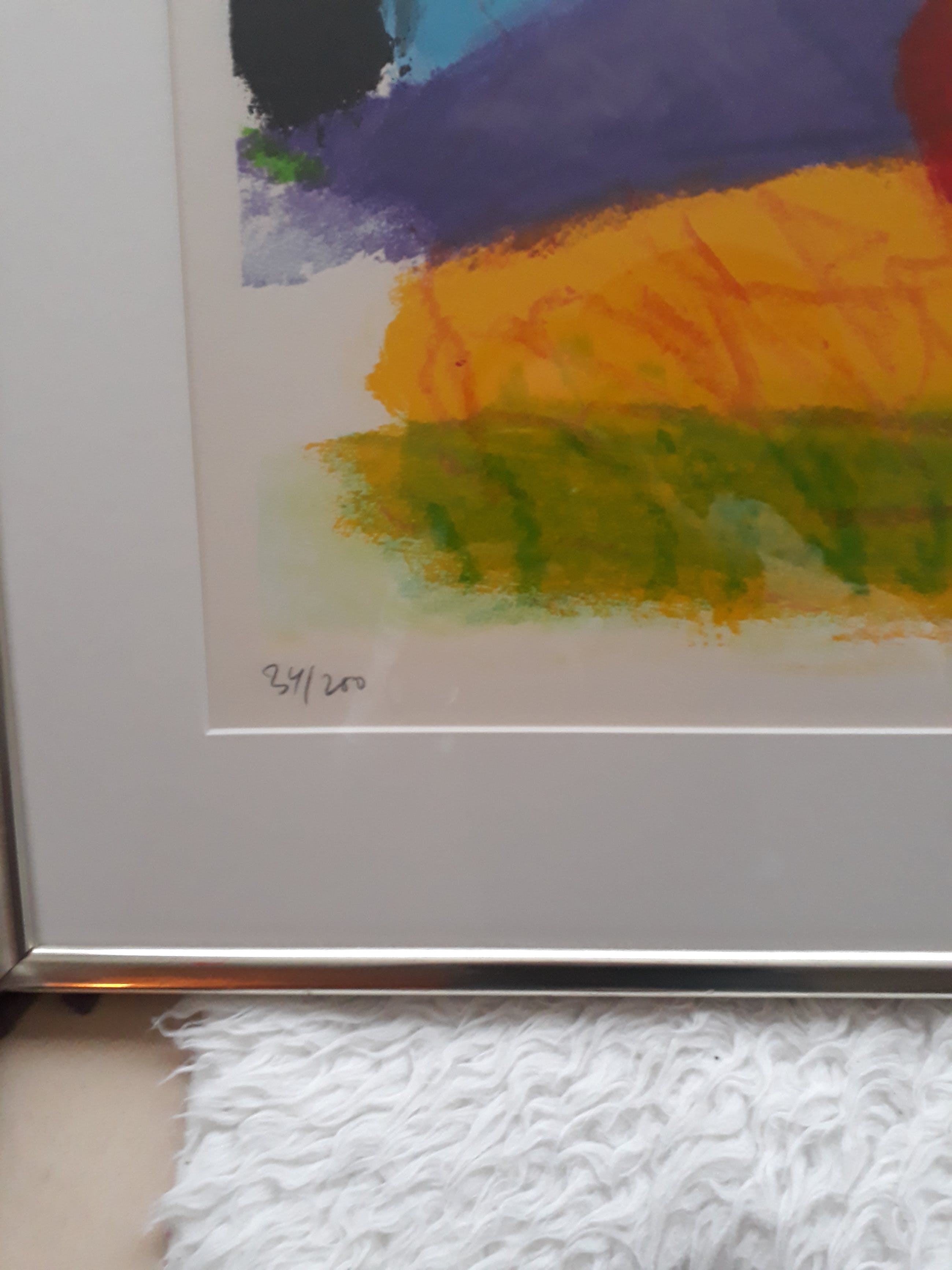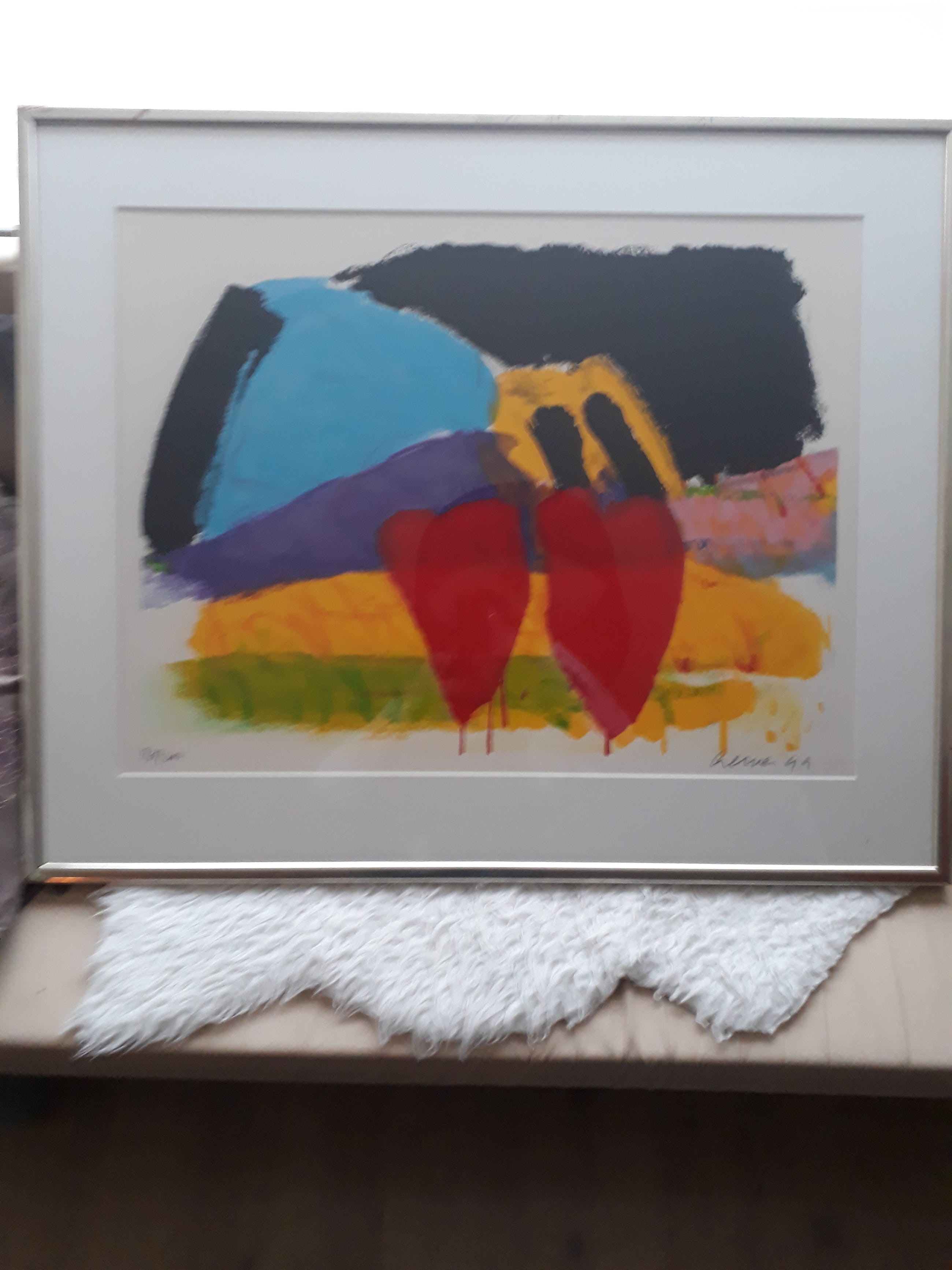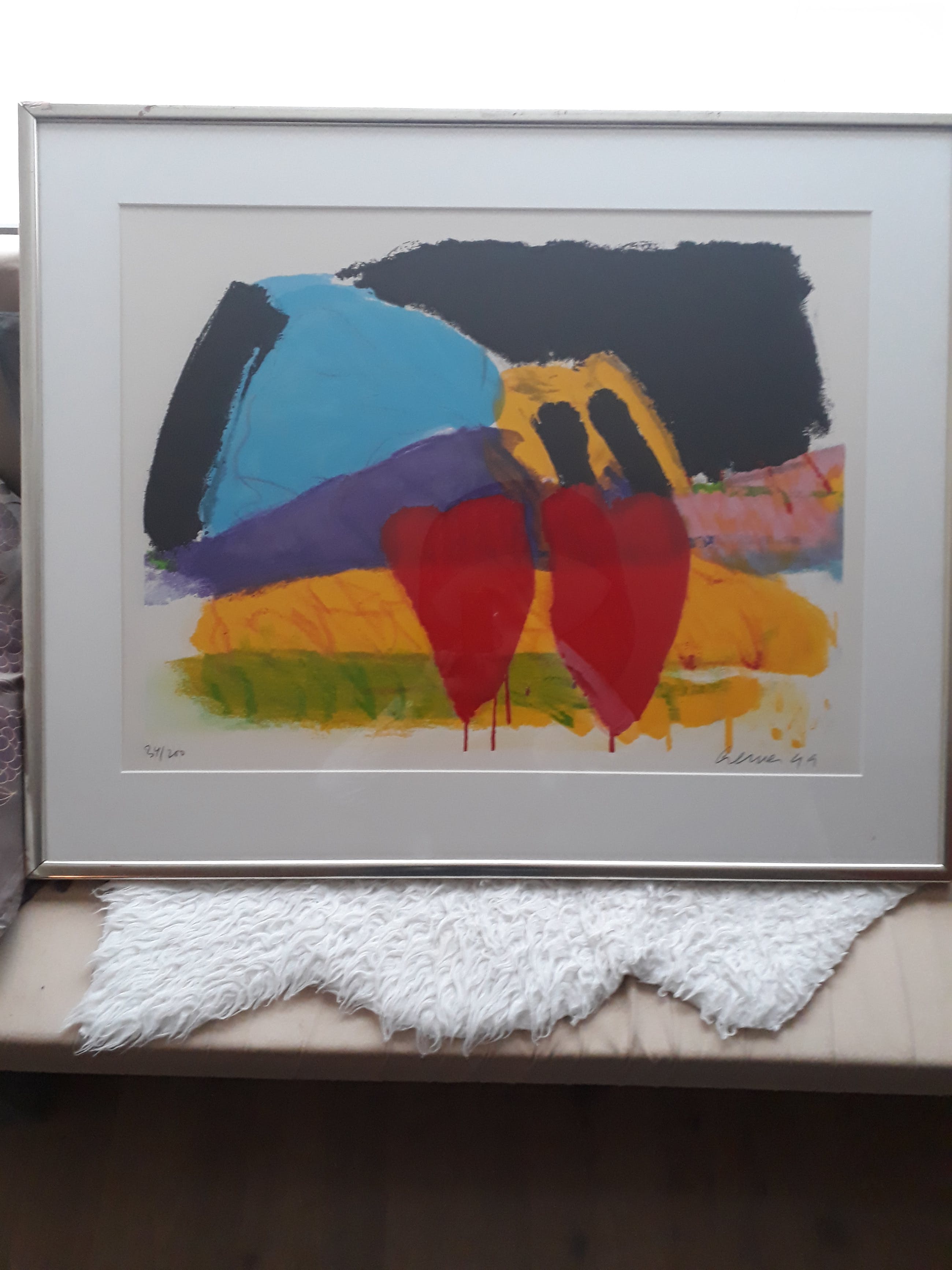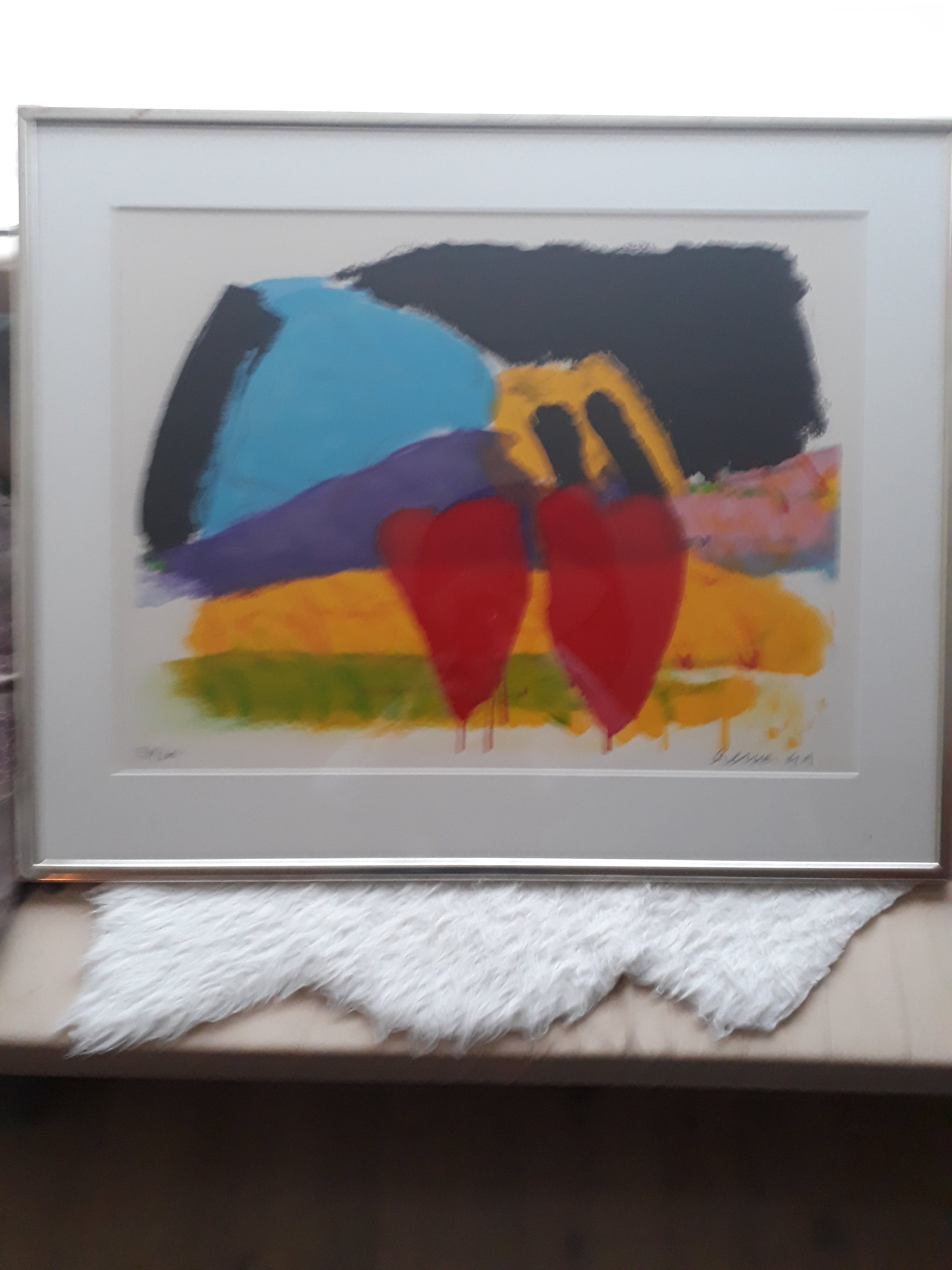 fraaie zeefdruk van cremer uit 1999. lijst licht beschadigd [verf en wat krassen in het hout.