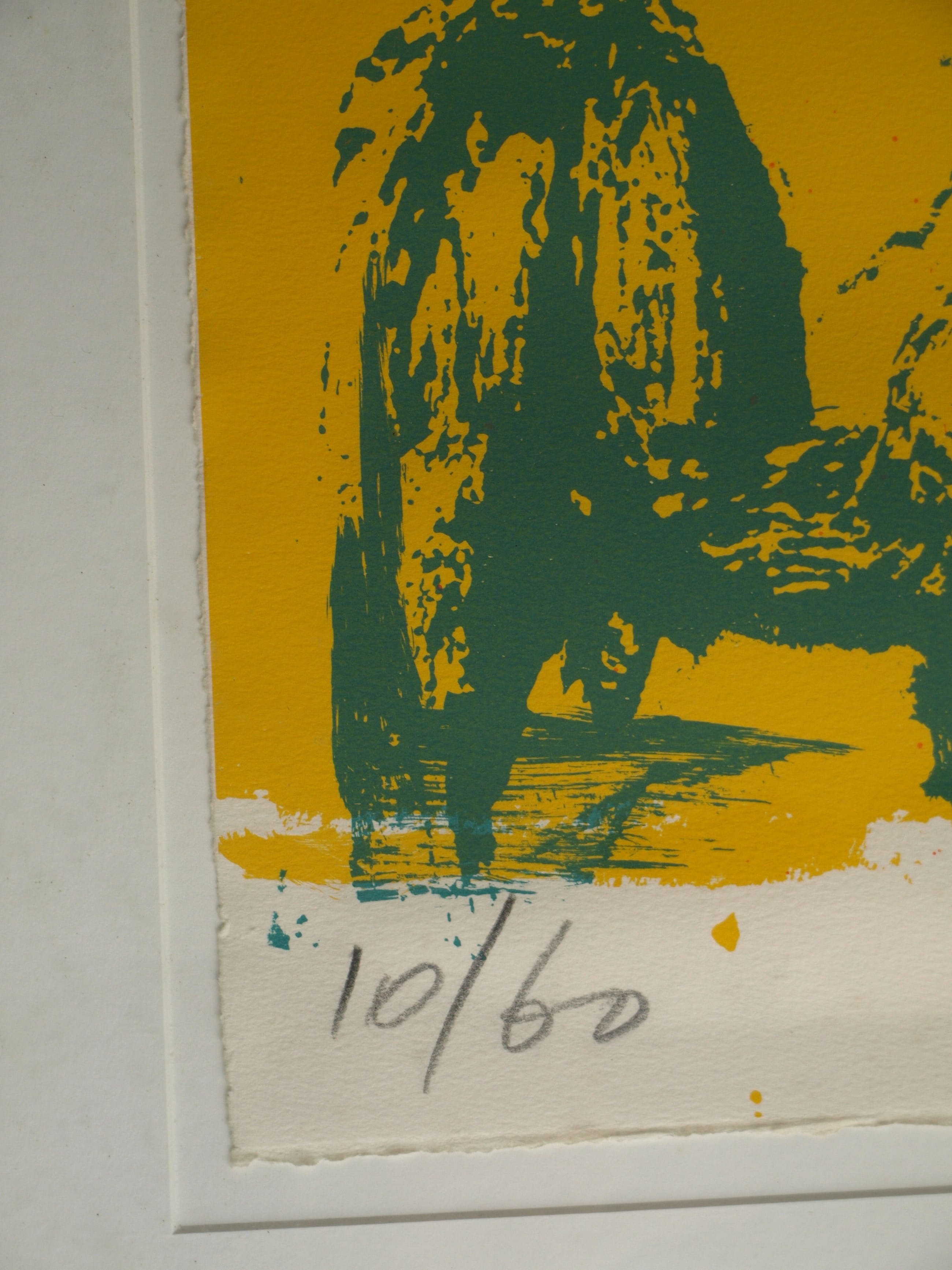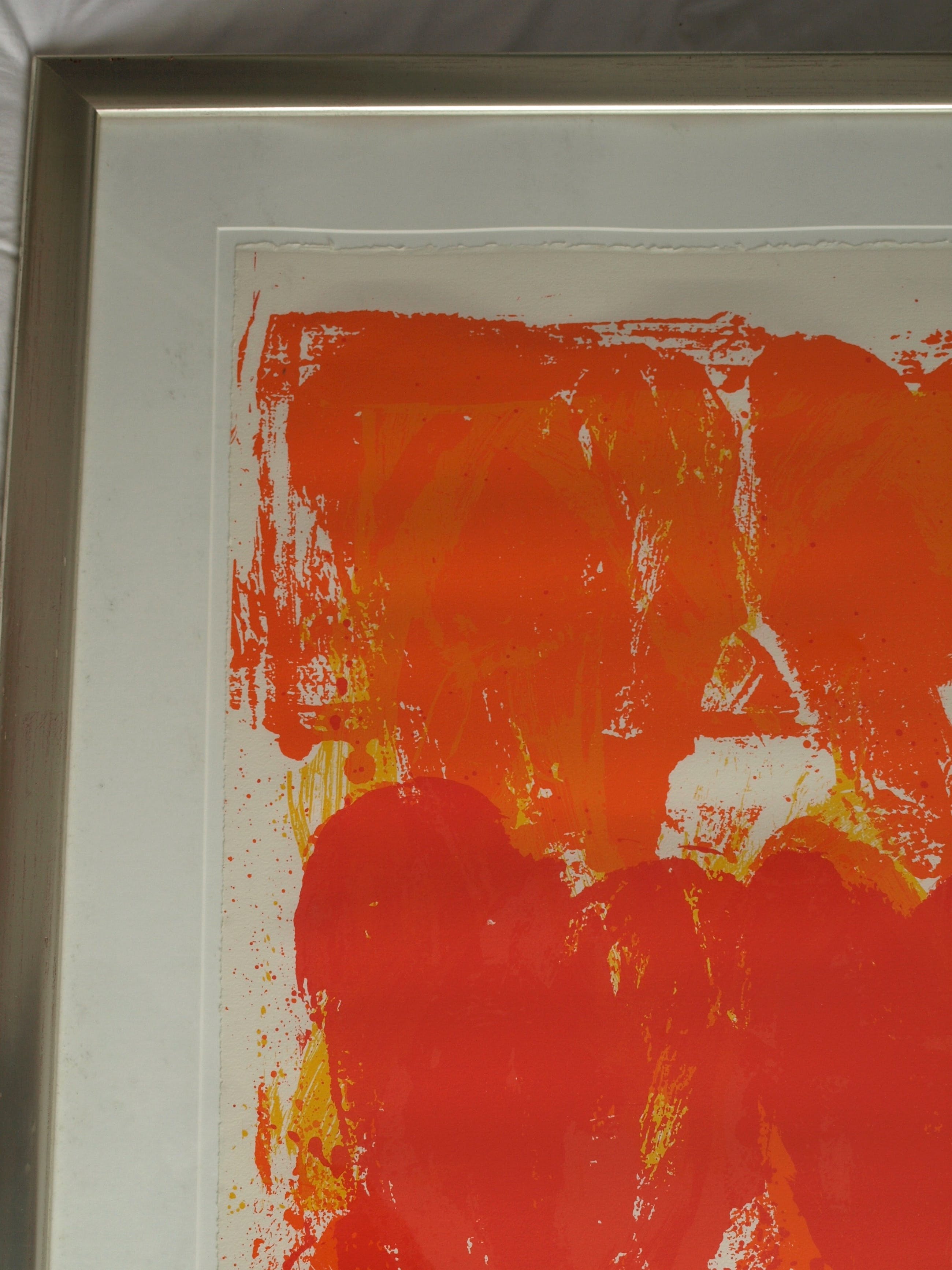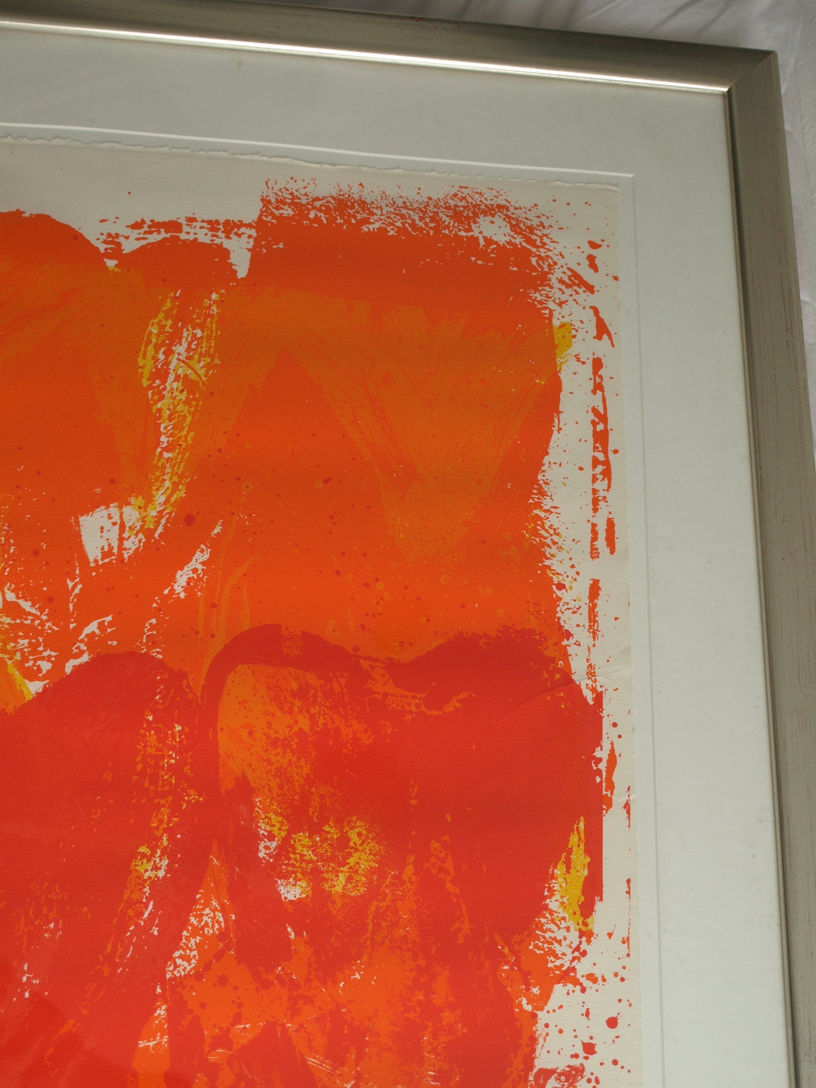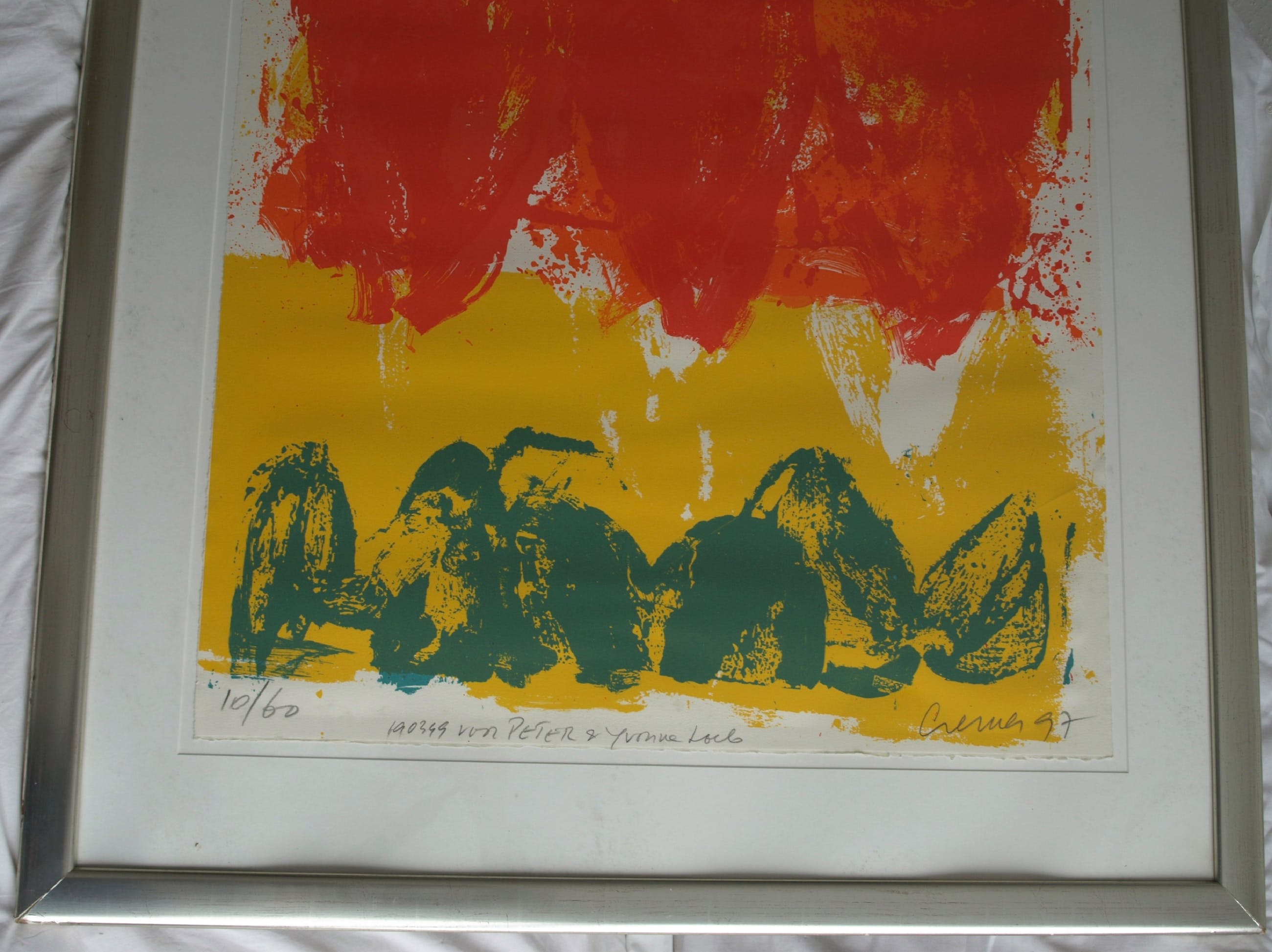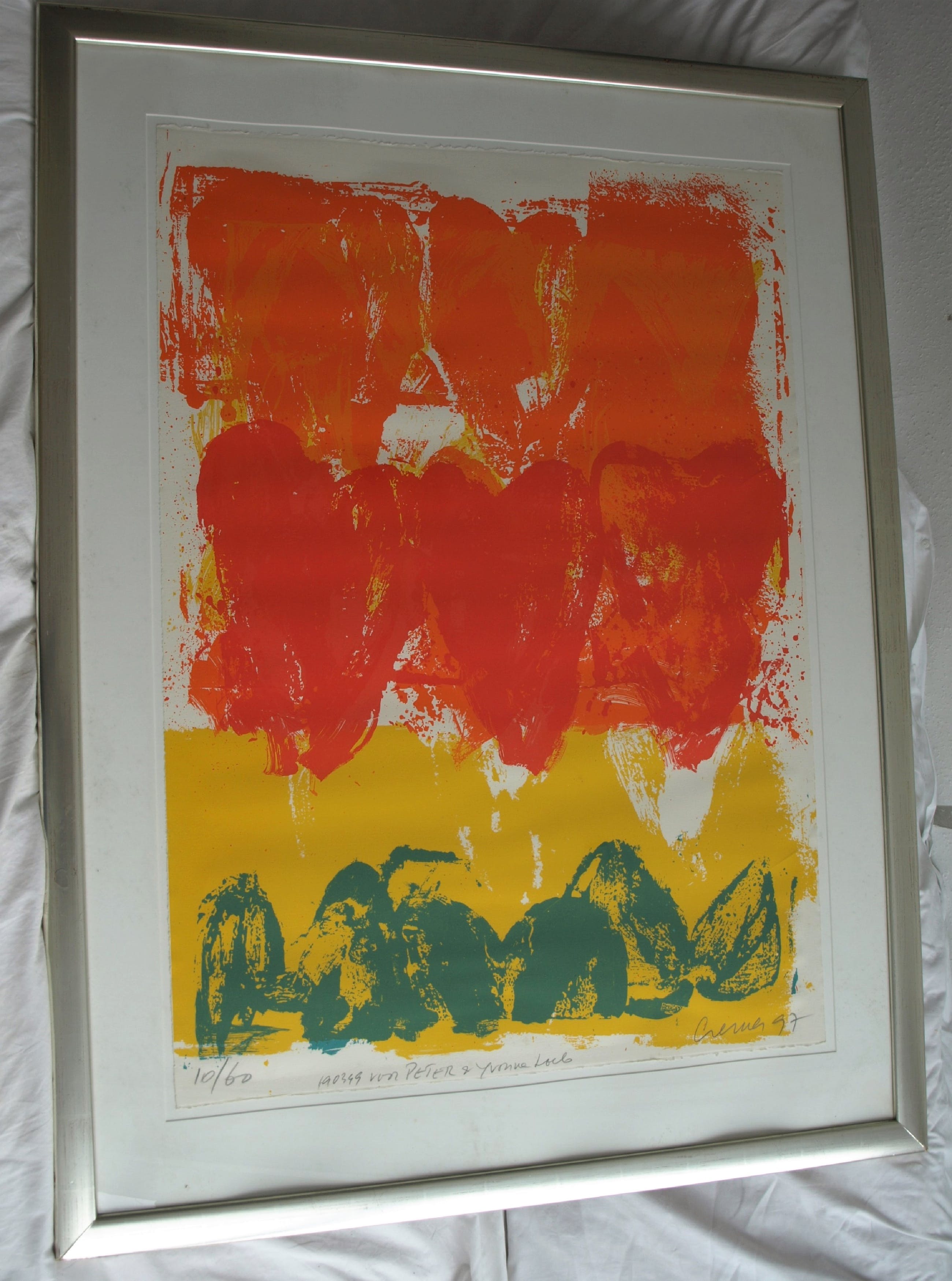 -Herkomst: “Voor Peter en Yvonne Loeb” staat met potlood geschreven middenonder. Dit zijn de 2 eigenaren van Uitgeverij Loeb, de uitgeverij van de boeken van Jan Cremer. De zeefdruk heeft gehangen in het kantoor van Uitgeverij Loeb.
