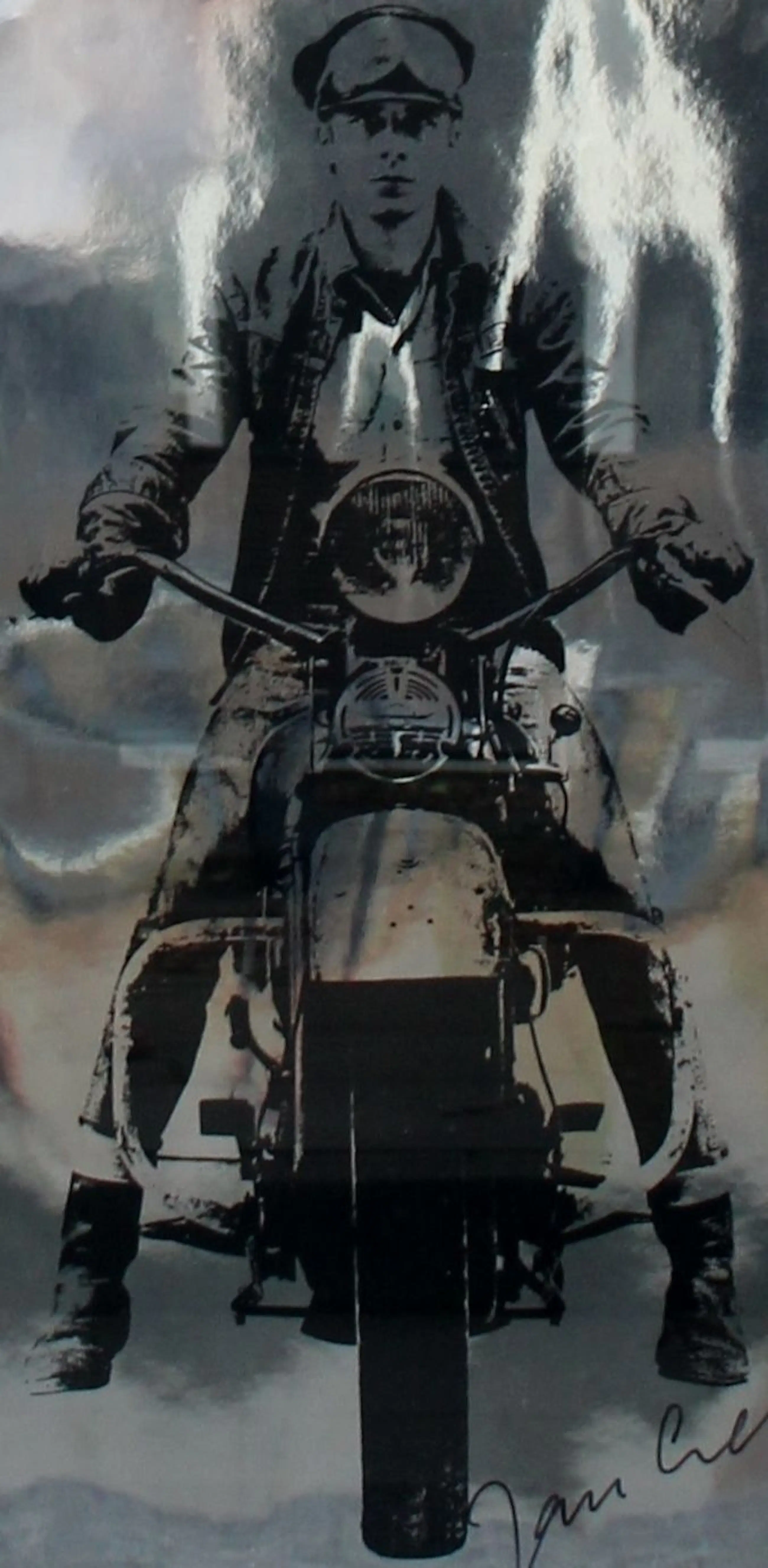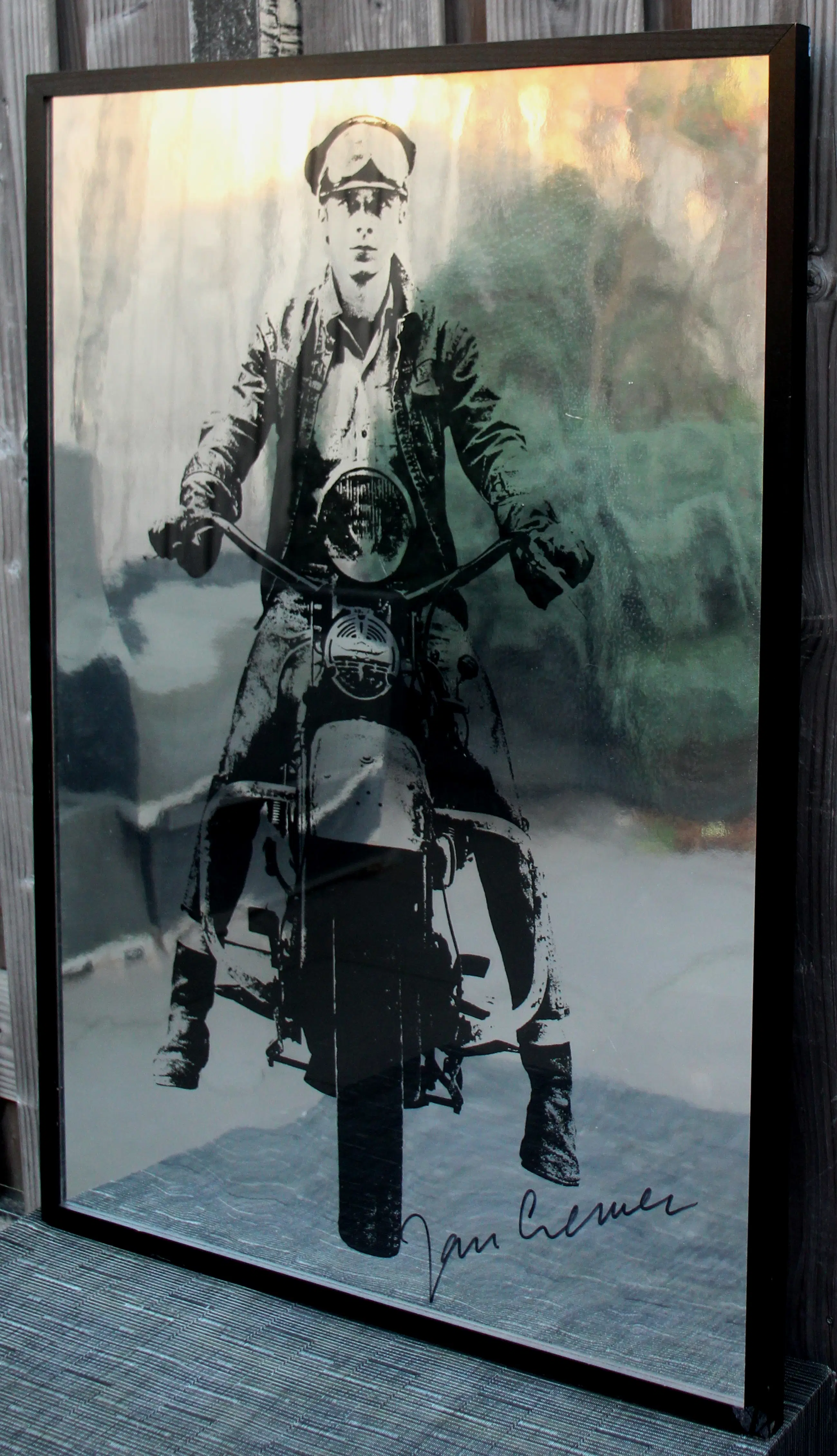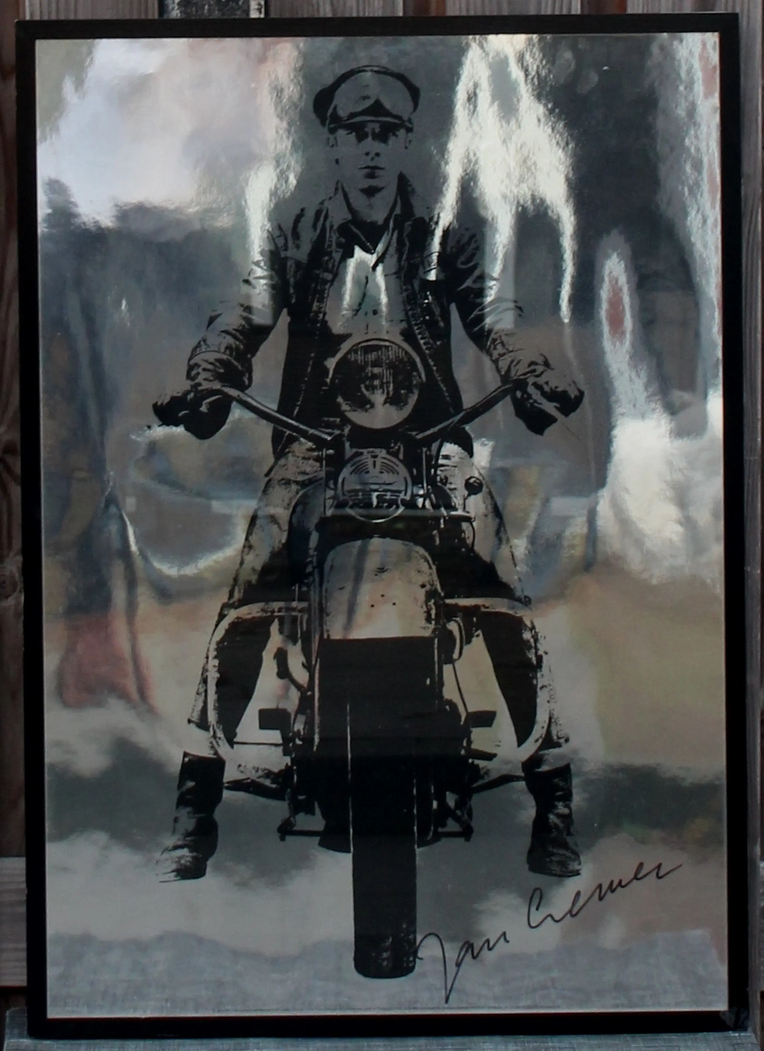 Iconische ingelijste zeefdruk in zwart, op metaal, zilverpapier van Jan Cremer. Deze foto van Jan Cremer op een motorfiets is oorspronkelijk gebruikt voor de voorzijde van het boek" Ik Jan Cremer" in 1964. Jaar: 1993. Afmetingen incl lijst: H105 x b75cm. Afmetingen voorstelling: H100 x B70cm. Omdat de ondergrond glanzend "spiegelend" is, ziet u spiegeling op de foto's.