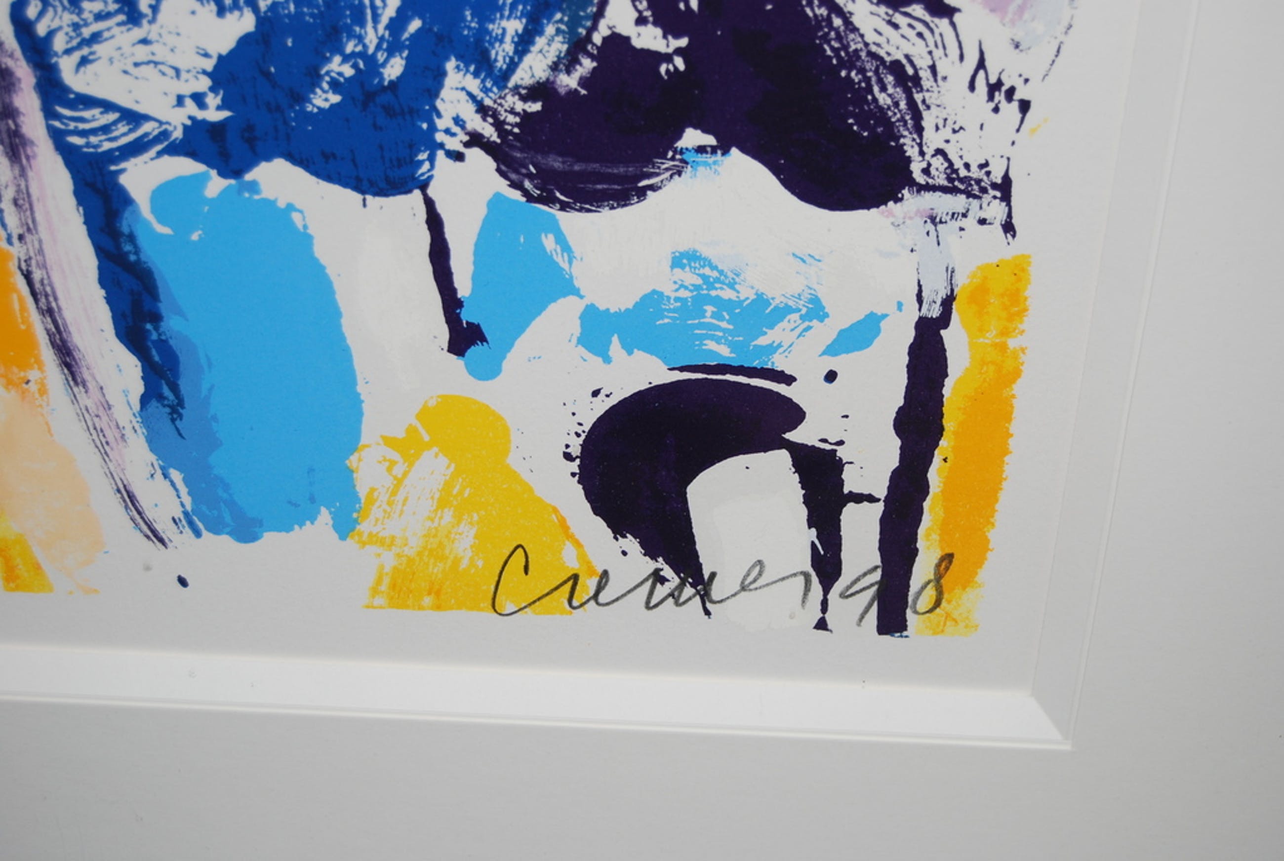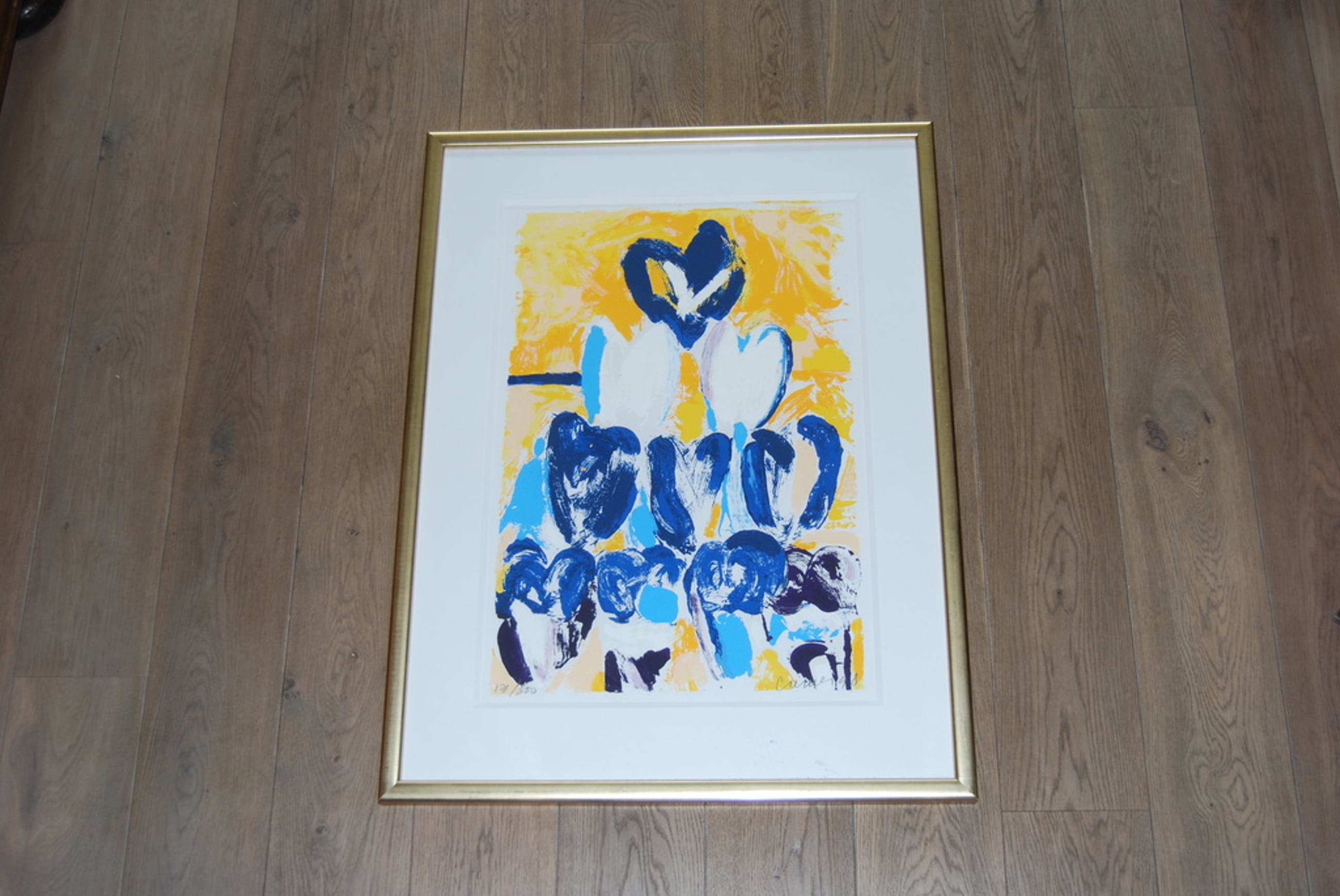 Klassieke Tulpen zeefdruk van Jan Cremer uit 1998. Prachtig ingelijst door Krutzmann in goudkleurige houten lijst achter glas met verzonken passe-partout. Hand gesigneerd, gedateerd en genummerd. Dit is nummer 171 uit een oplage van 300 en onbeschadigd. Afmetingen bxh zijn 80 cm x 105 cm (lijst) en 53 cm x 77 cm binnen passe-partout. Bij eventuele aankoop zal het werk opgehaald moeten worden in Hilversum vanwege grootte en kwetsbaarheid van het werk. Brengen in overleg mogelijk.