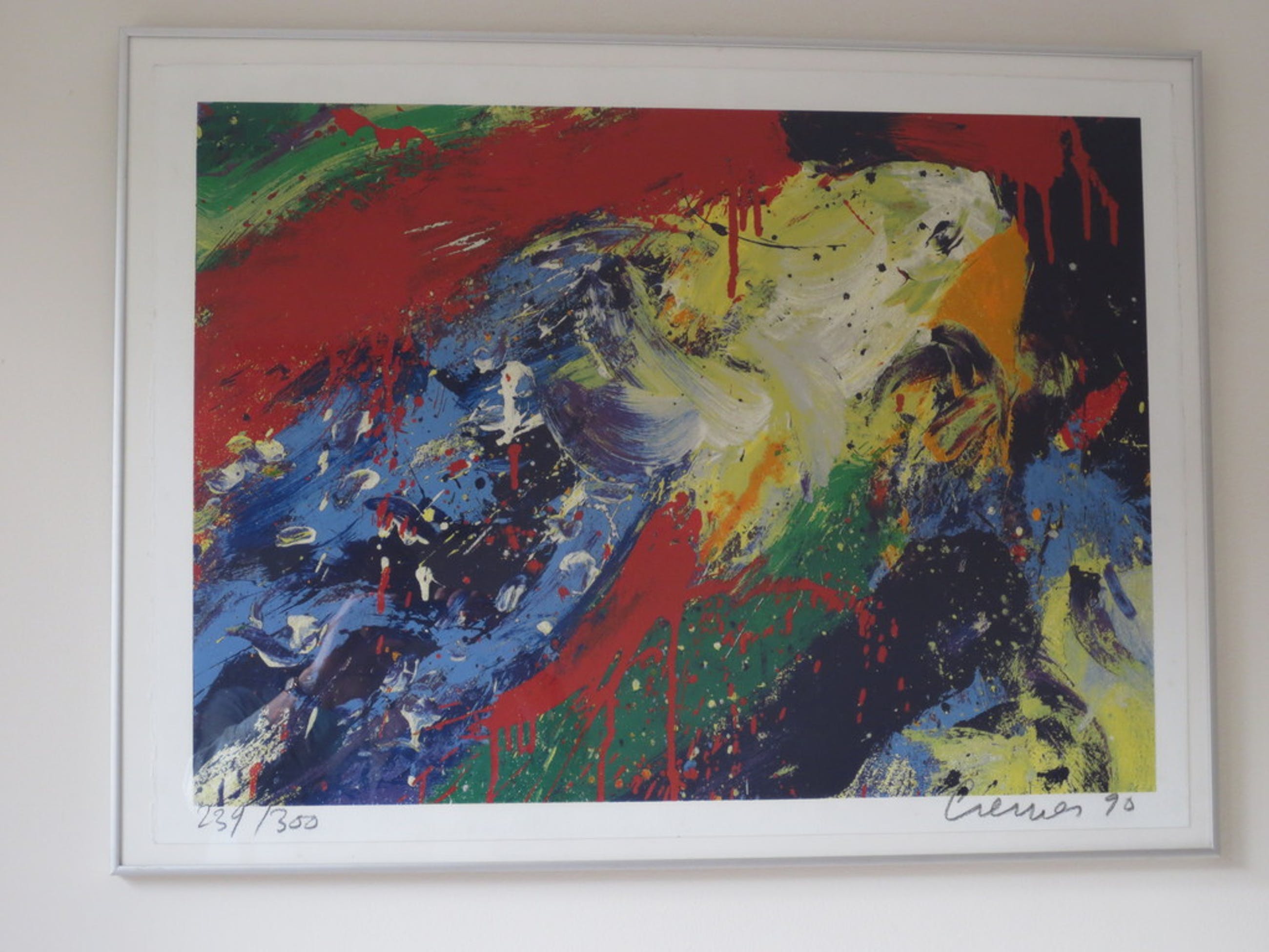 Prachtige, kleurrijke, handgesigneerde, ingelijste, zeefdruk van Jan Cremer.. Betreft nummer 239/300. Maten incl lijst 80 bij 60cm
