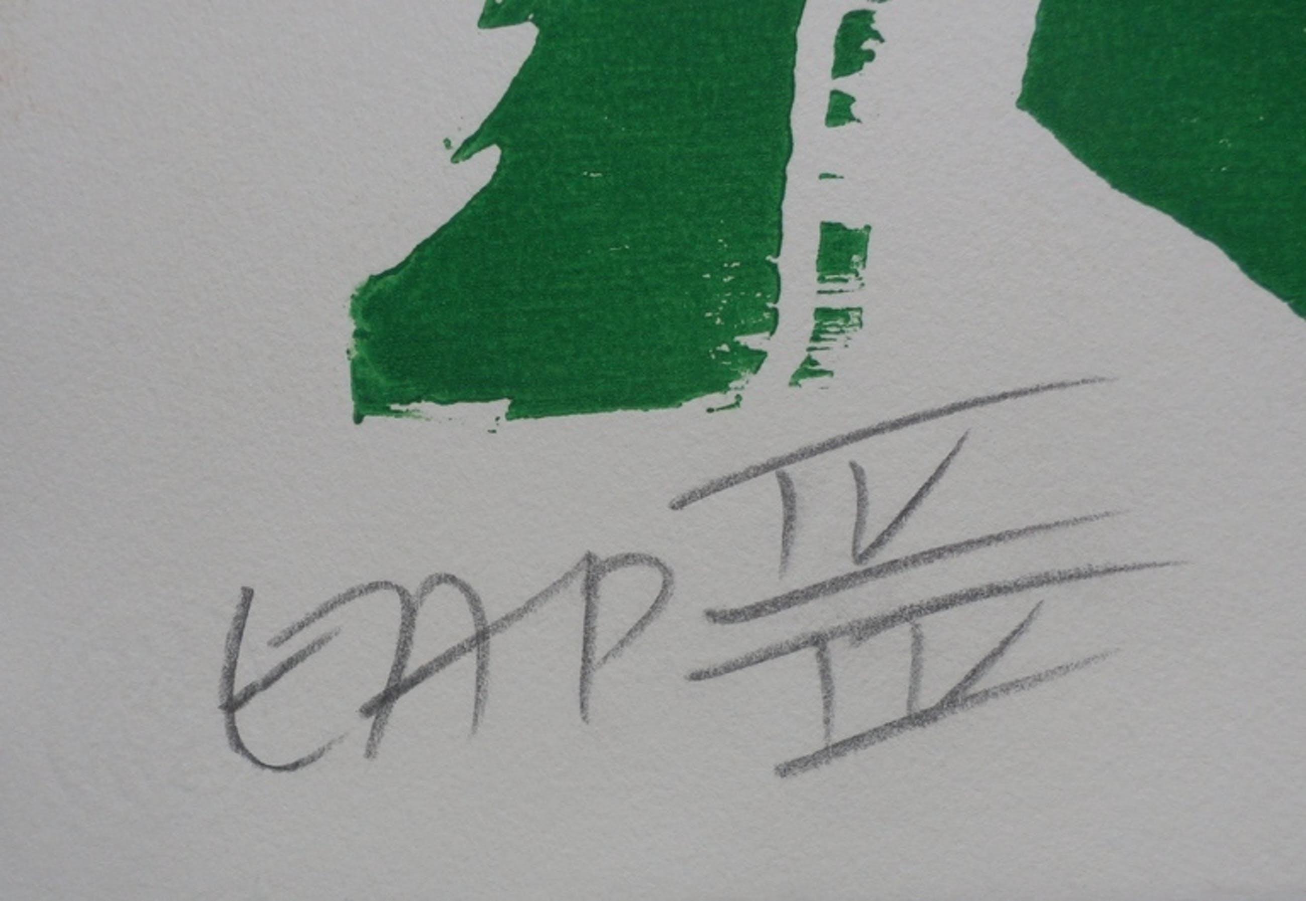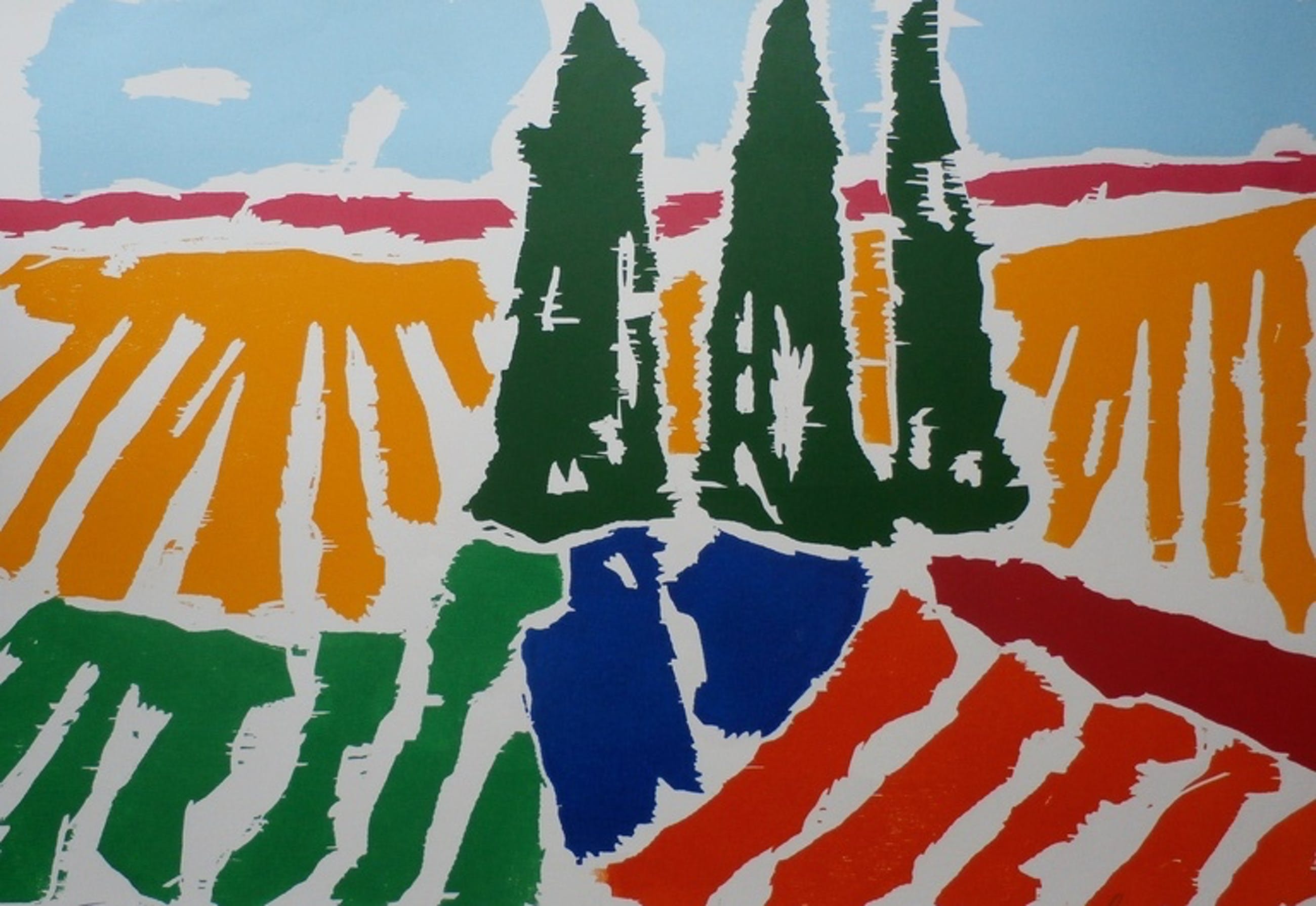 Grote houtsnede van Jan Cremer. Titel: Toscane 99 I. met opdracht: "Voor Rina"(=Rina Berghuis, zij is de partner van wijlen Piet Clement). Uit 1999. Afmetingen blad: H68 x b102 cm. Nummer: EAP IV/IV. Conditie: in zeer goede staat. Van alle bladen grafiek, die in de drukkerij op de Prinsengracht ontstonden, ontving zij meestal nr. IV met de opdracht Voor Rina. Het werk is rechtsonder gesigneerd door de kunstenaar. De authenciteit van dit werk wordt volledig gegarandeerd. Een certificaat van echtheid kan, op verzoek, worden meegeleverd. Conditie: in zeer goede staat. Kleine vouw in hoek rechsonder. Galerieprijs: 1.700 euro.
