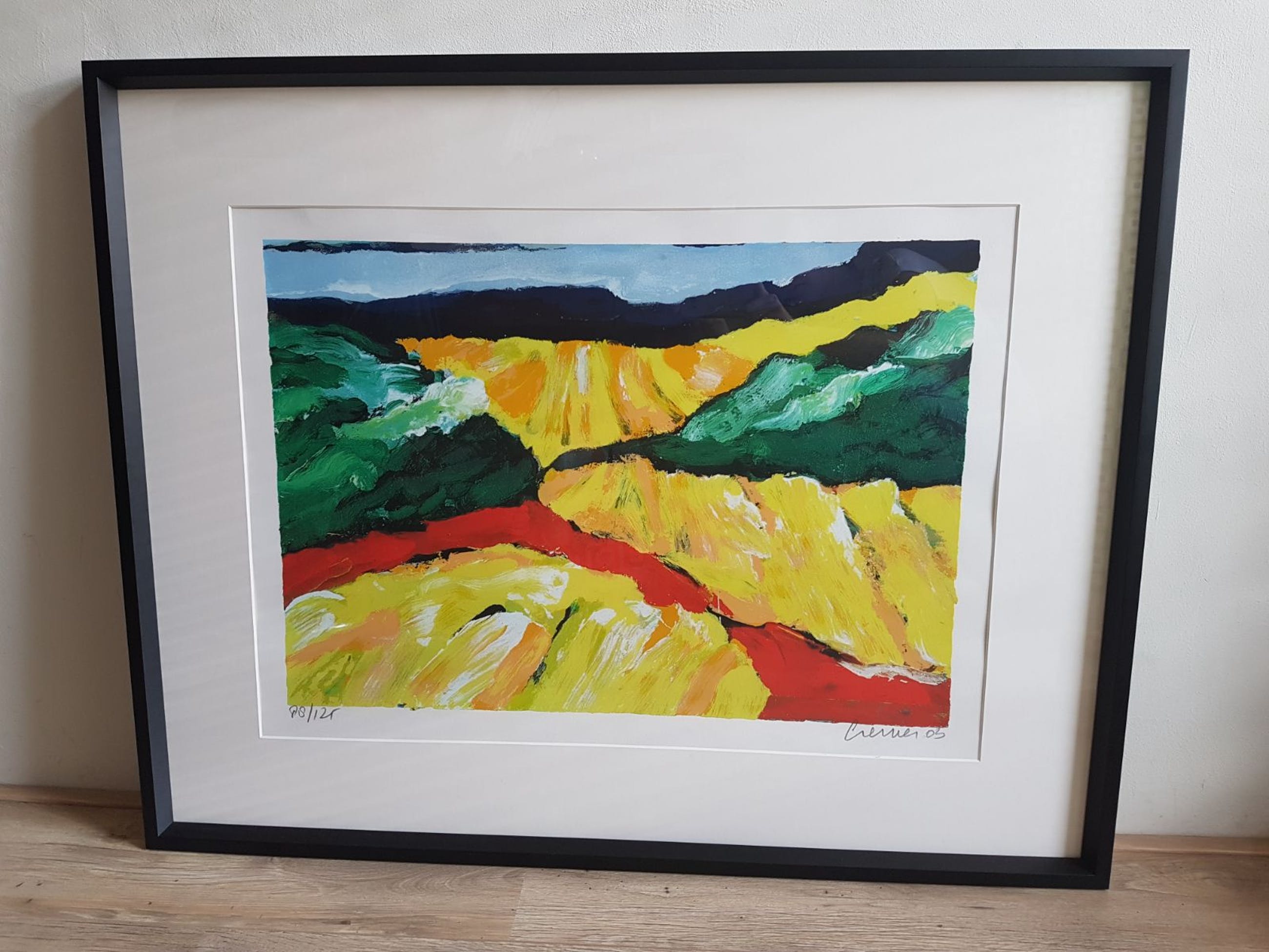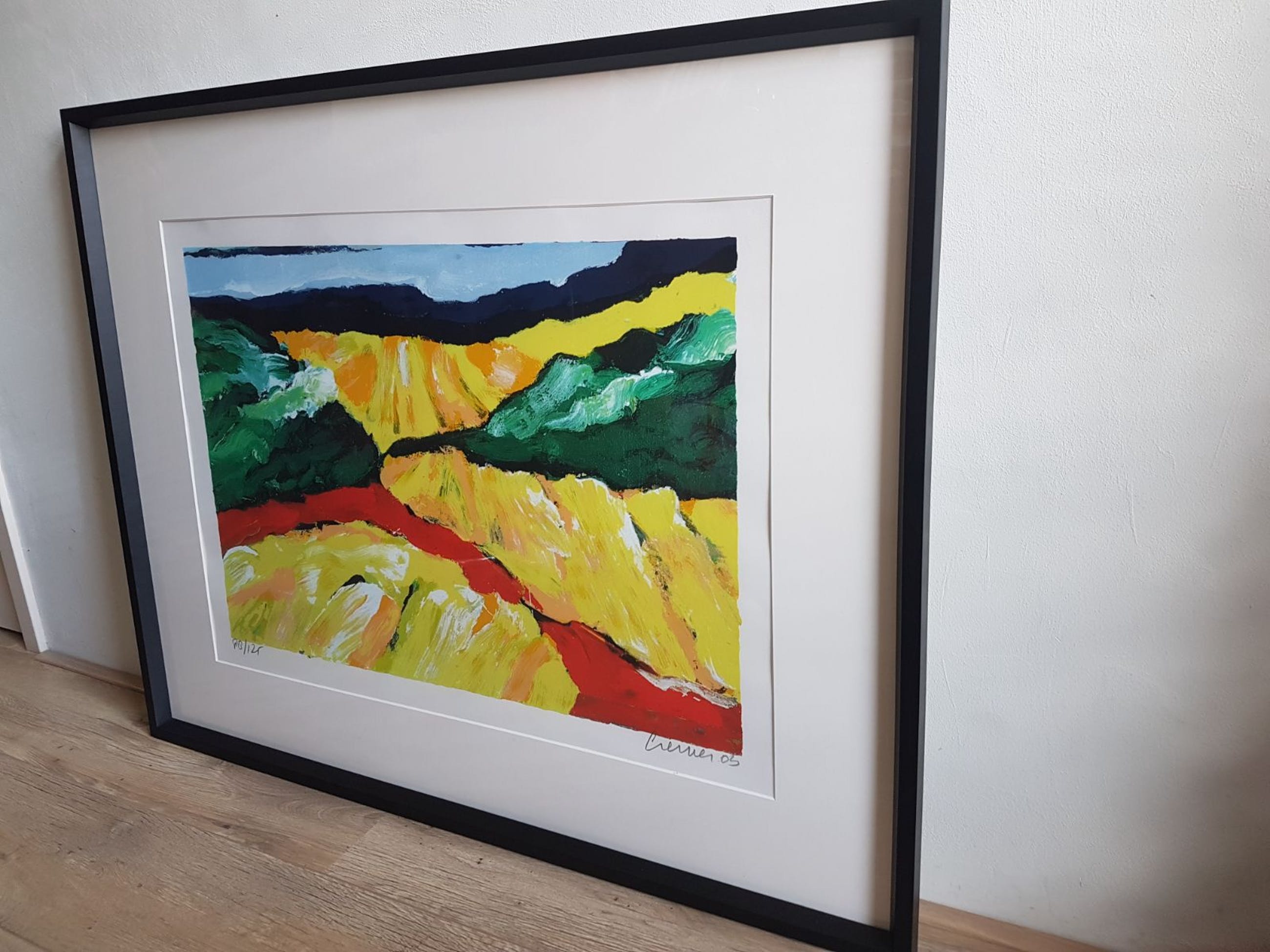 Herkomst: Prachtig landschap, beperkte oplage (88/125). Zeefdruk is aangeschaft via interne kunstveiling bij een werkgever voor wie Jan Cremer veel werken heeft gemaakt. Werk zorgvuldig in laten lijsten in Amsterdam, Hoopman lijstenmaker.