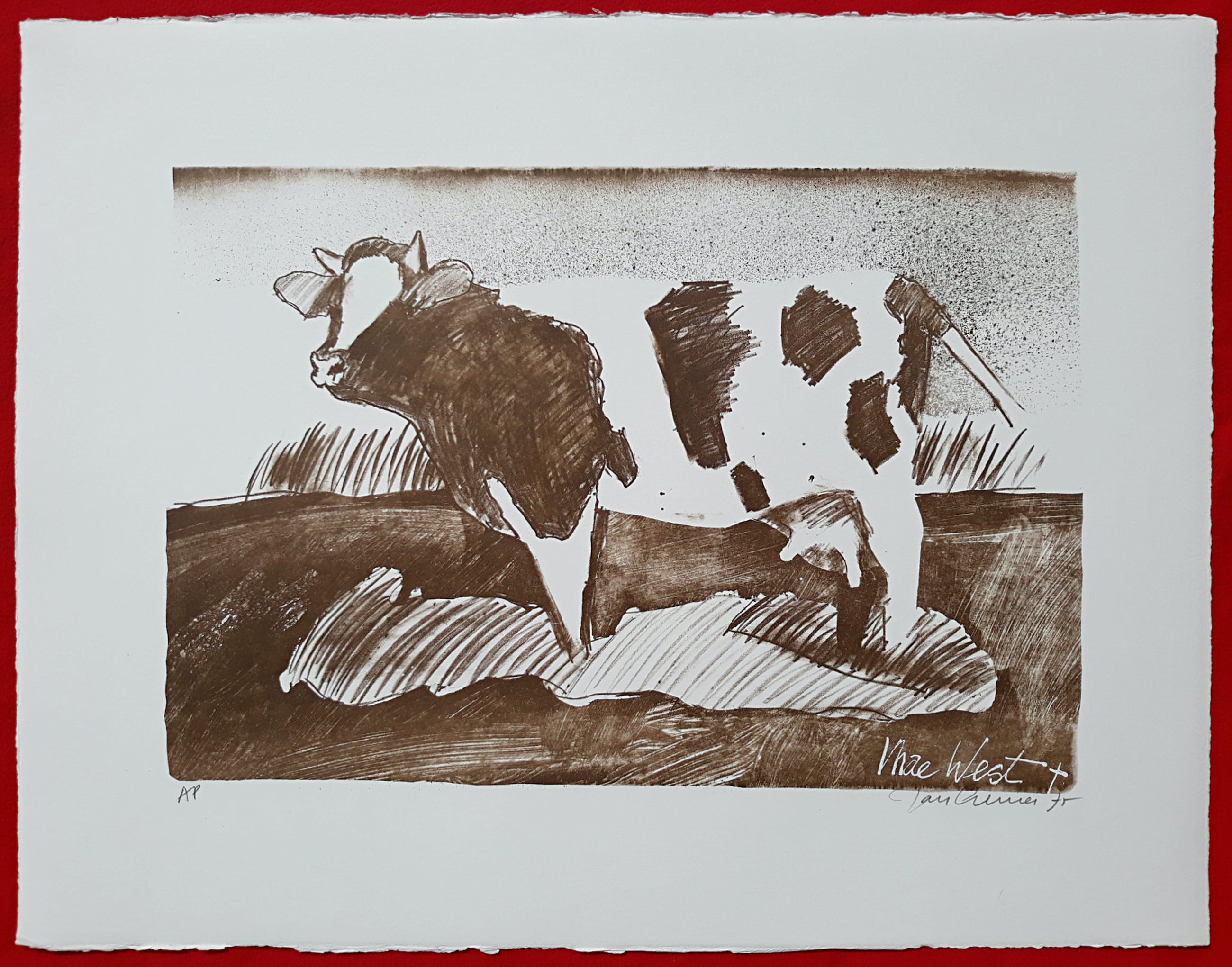 Eén van de bekende koeien van Jan Cremer. Litho op geschept papier, met potlood gesigneerd en gedateerd (‘75) een A.P. exemplaar. In uitstekende conditie.