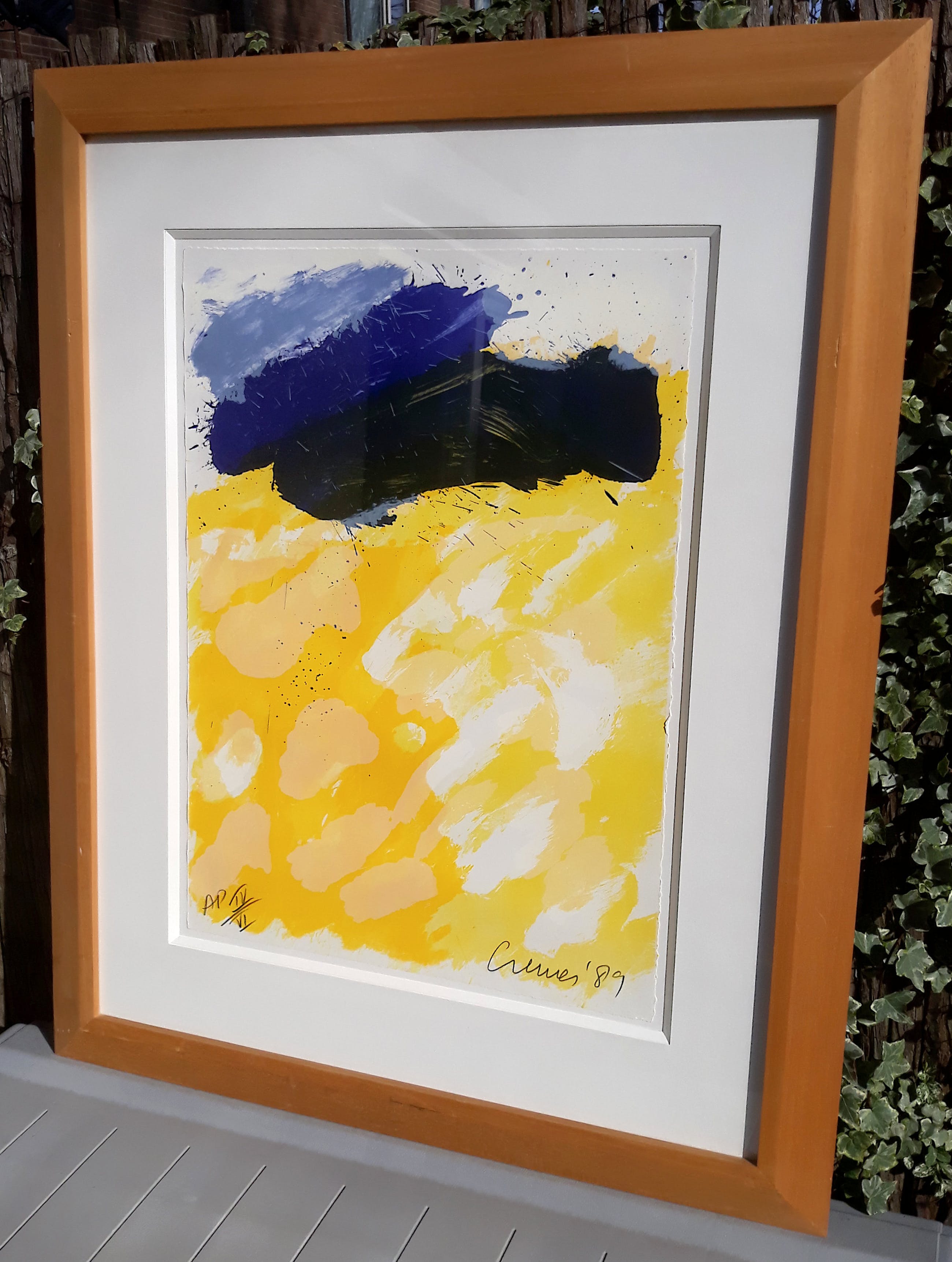 Zeer mooi, bijna abstract werk van Jan Cremer uit 1989. Zeefdruk op geschept papier, met potlood gesigneerd, gedateerd en genummerd (IV/VI = 4/6), een Artist Proof exemplaar. Het gehele blad in zeer solide houten lijst, achter glas en met zuurvrij, luxueus passe-partout. Alles in zeer goede conditie. Literatuur: “Cremer Grafiek / Prints 1956-1998”, no. 89-07/L, bladzijde 133.