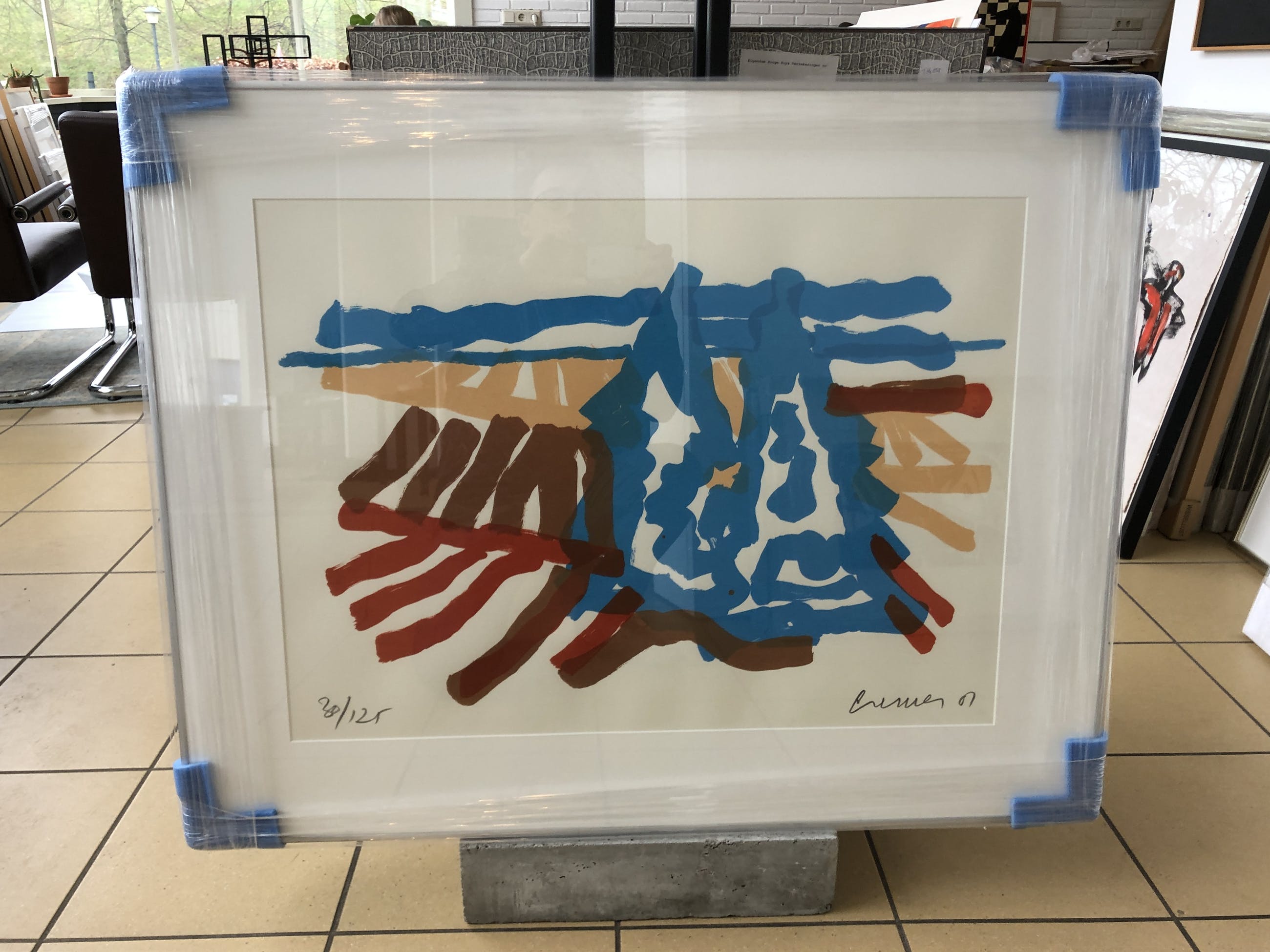 Mooie zeefdruk van jan Cremer in kleine oplage. Het werk heeft een eenvoudige maar net lijst en zuurvrij pasee partout. U kunt het zo ophangen. Het werk kan worden opgehaald, verzonden met lijst per koerier of zonder lijst worden toegestuurd. De foto is door het glas heen gemaakt.