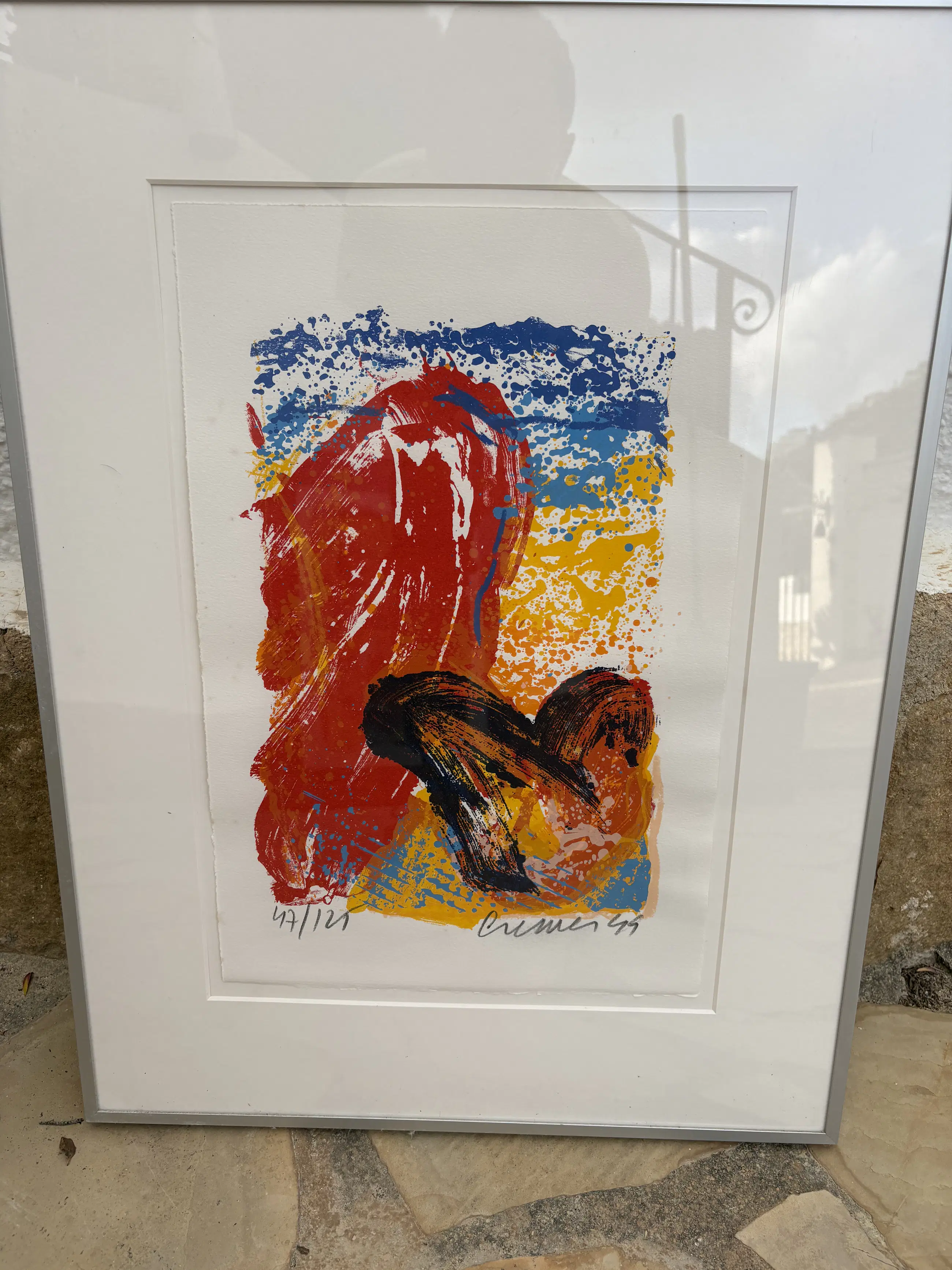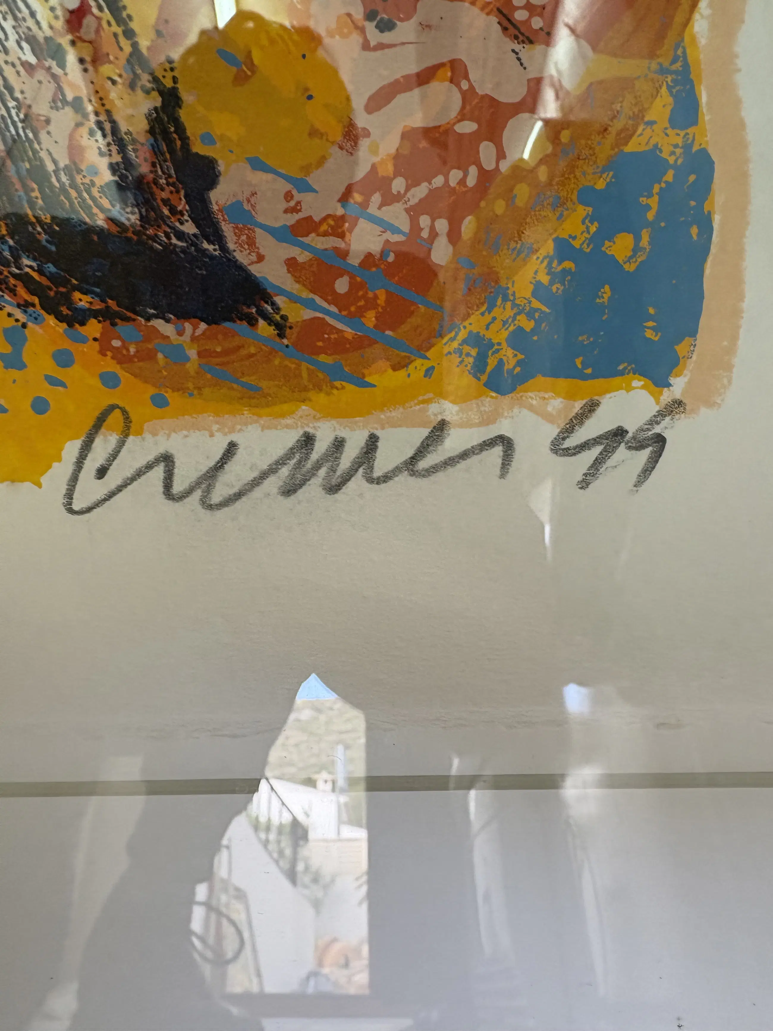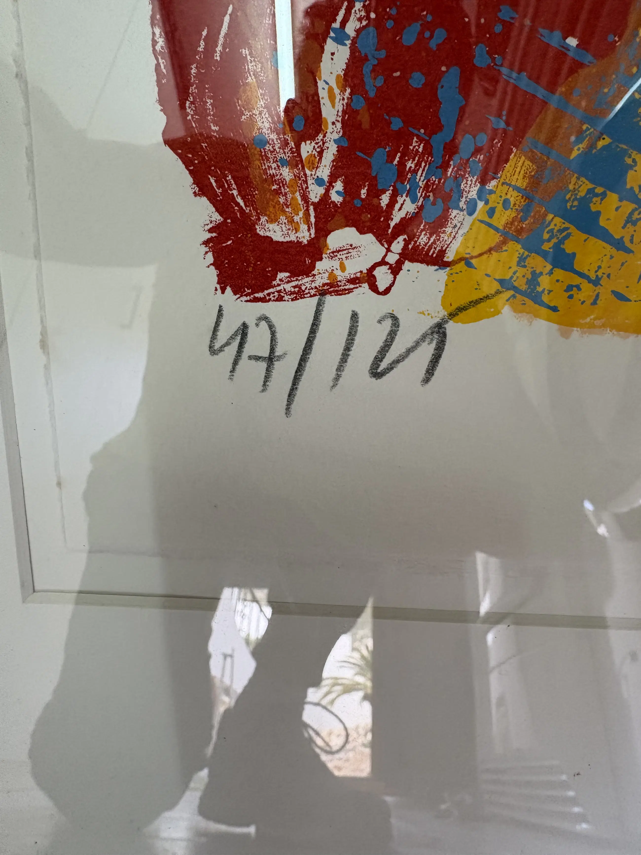 Gevonden in Spanje. Info van ChatGPT Dit kunstwerk is een zeefdruk van de bekende Nederlandse kunstenaar Jan Cremer. Kunstenaar: Jan Cremer. Techniek: Kleurzeefdruk. Kenmerken: Het werk komt uit een gelimiteerde oplage, in dit geval nummer 47 van 121, zoals aangegeven op de prent zelf. Stijl: Typerend voor Cremer met krachtige kleuren en expressieve vormen, vergelijkbaar met werken uit zijn serie 'Nine Tulips' of Toscane-series.