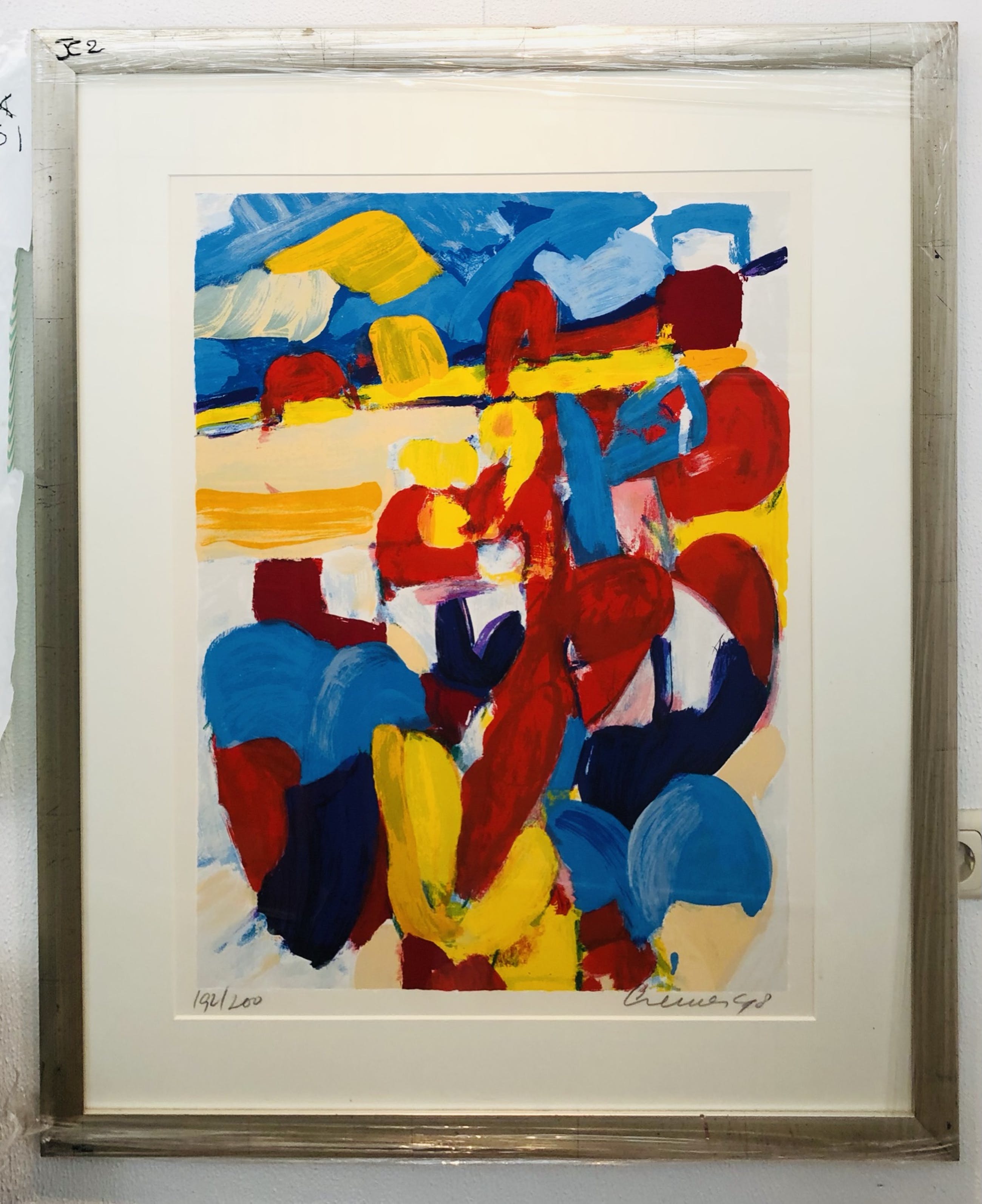 Fraai kleurrijk werk van Jan Cremer met lijst. Een werk dat zo aan de muur kan hangen! U kunt het werk vooraf komen bekijken in de Schatkamer van galerie Rotor in Gorcum, na aankoop afhalen of verzenden per koerier met lijst of zonder lijst per aangetekende post toegestuurd krijgen. Het werk zit in een prima maar gebruikte lijst. De foto is door het glas van de lijst heen genomen.