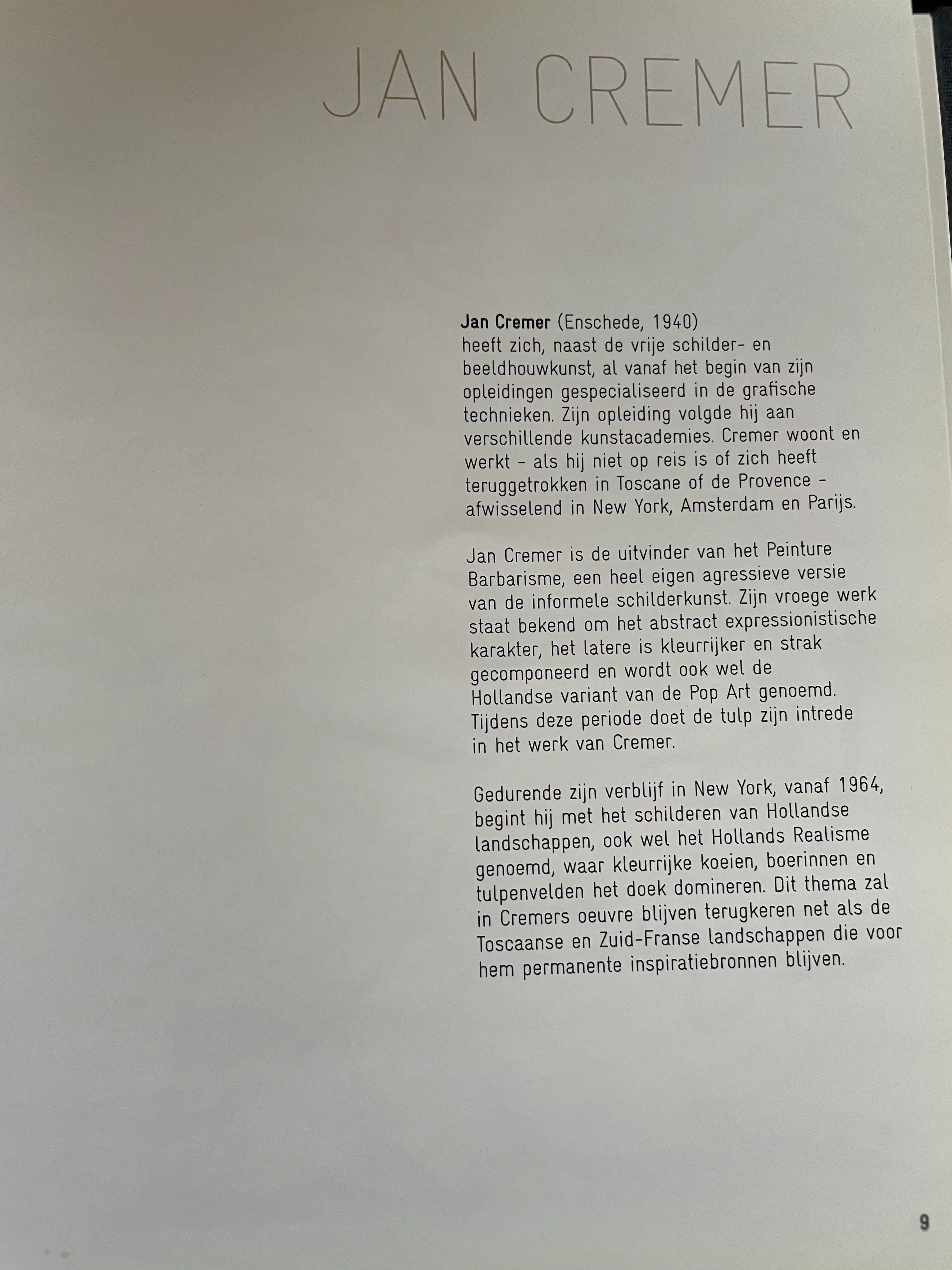 Jan Cremer is een gerenommeerde Nederlandse kunstenaar, bekend om zijn diverse artistieke talenten. Als schrijver, schilder en dichter heeft Cremer een indrukwekkend oeuvre opgebouwd. Zijn kunstwerken, zoals "Tulpes de Nord", weerspiegelen zijn gedurfde en expressieve stijl. Met krachtige penseelstreken en levendige kleuren creëert Cremer werken die een rauwe en emotionele energie uitstralen. Zijn artistieke carrière is doordrenkt van rebellie en experiment, waarbij hij de grenzen van de traditionele kunst verlegt en zijn eigen unieke visie tot uiting brengt.