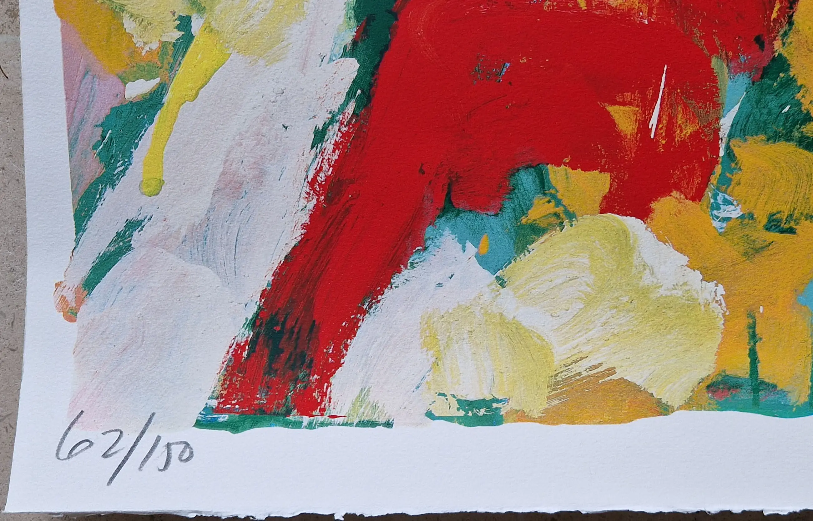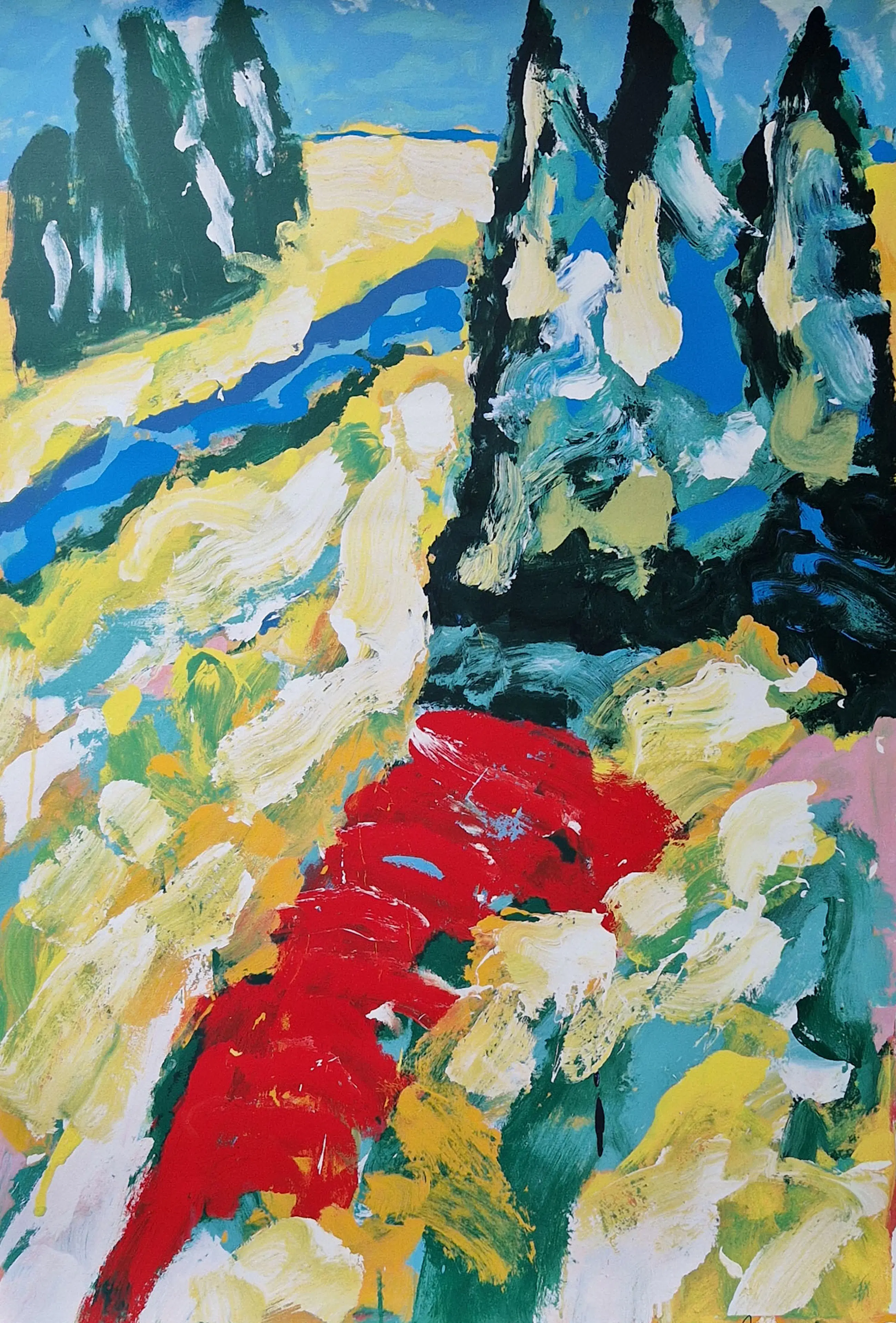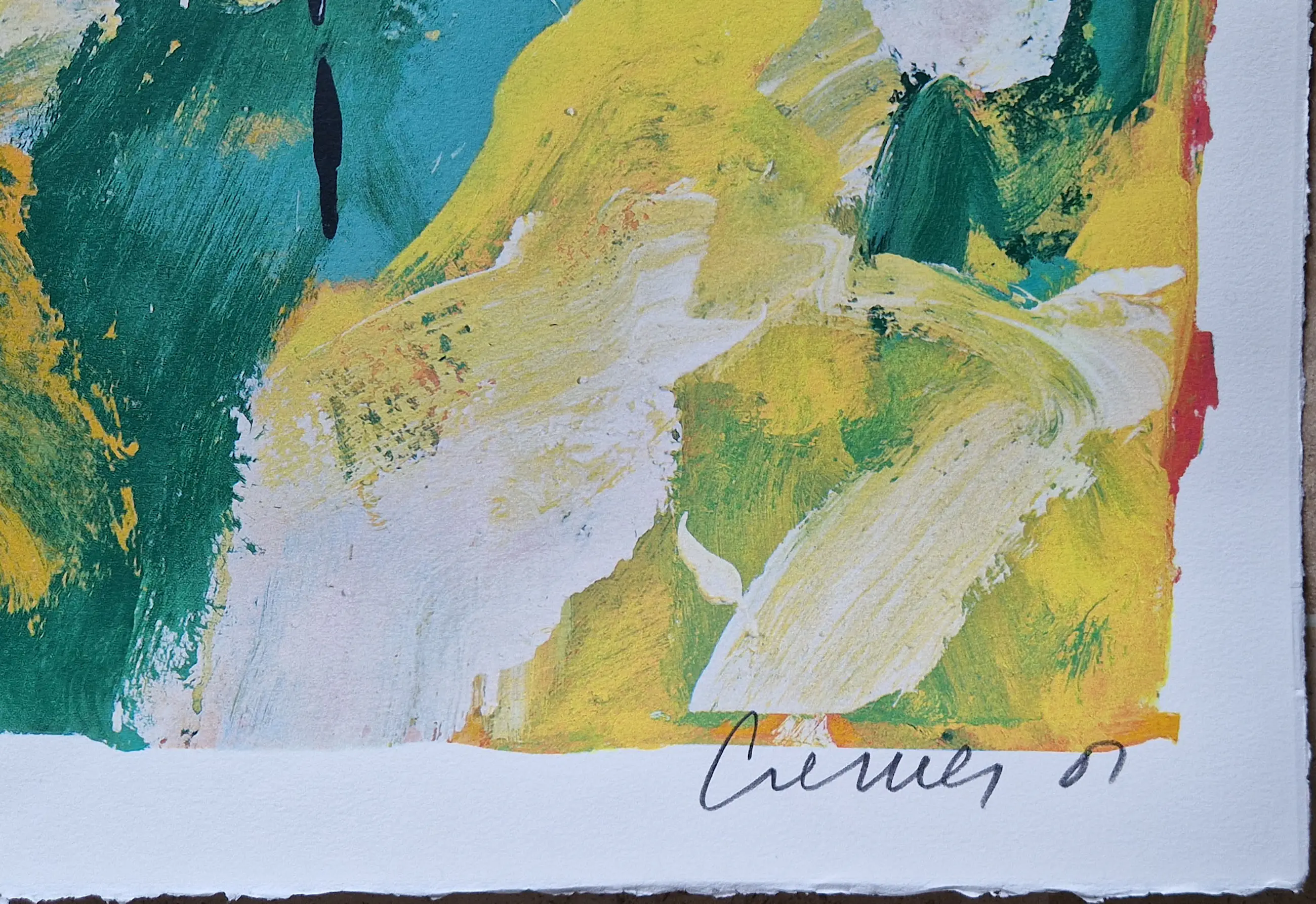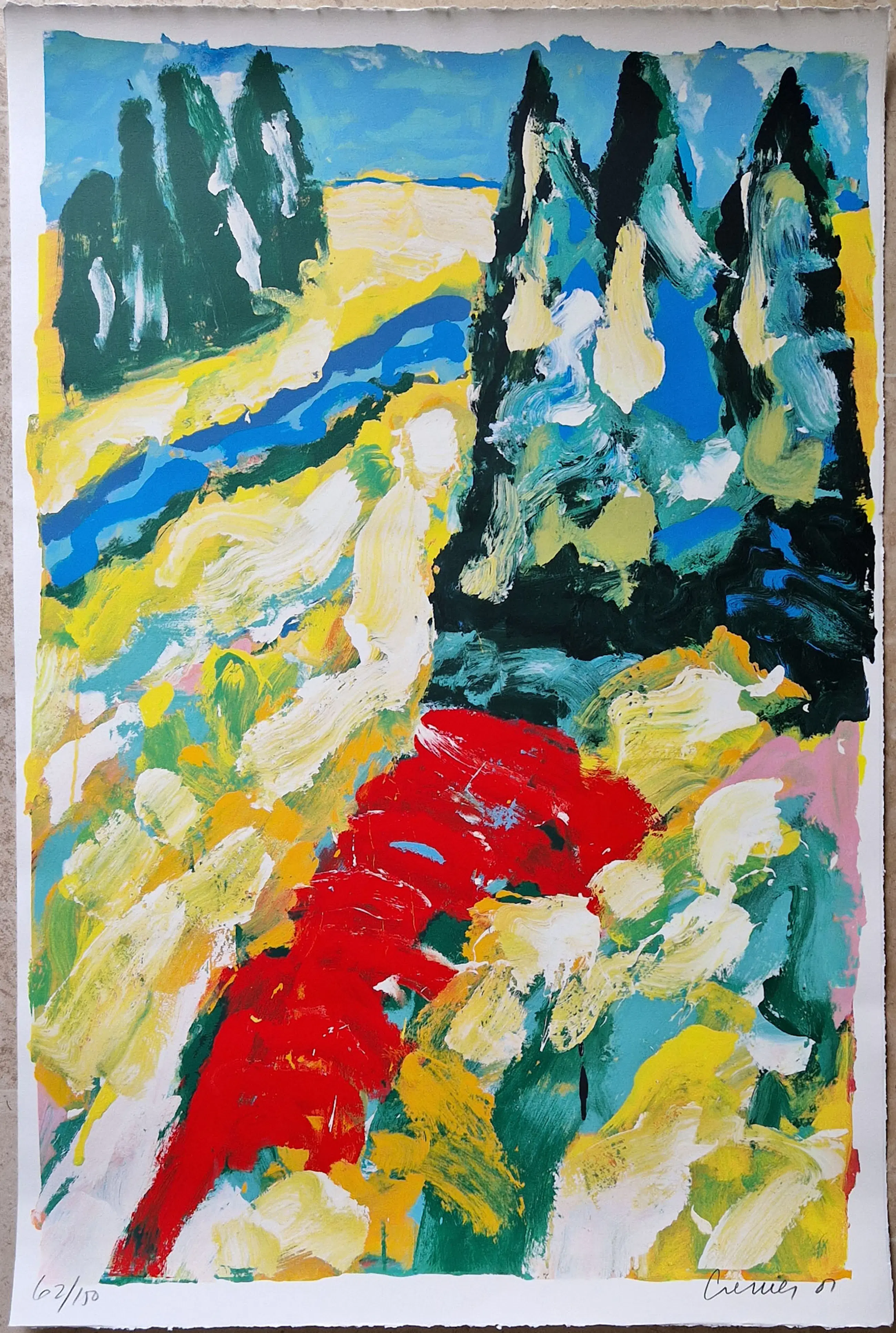 Zeefdruk van Jan Cremer met de titel: 'Fiume Azzuro' uit 2001. Het werk is rechtsonder met de hand gesigneerd door de kunstenaar.