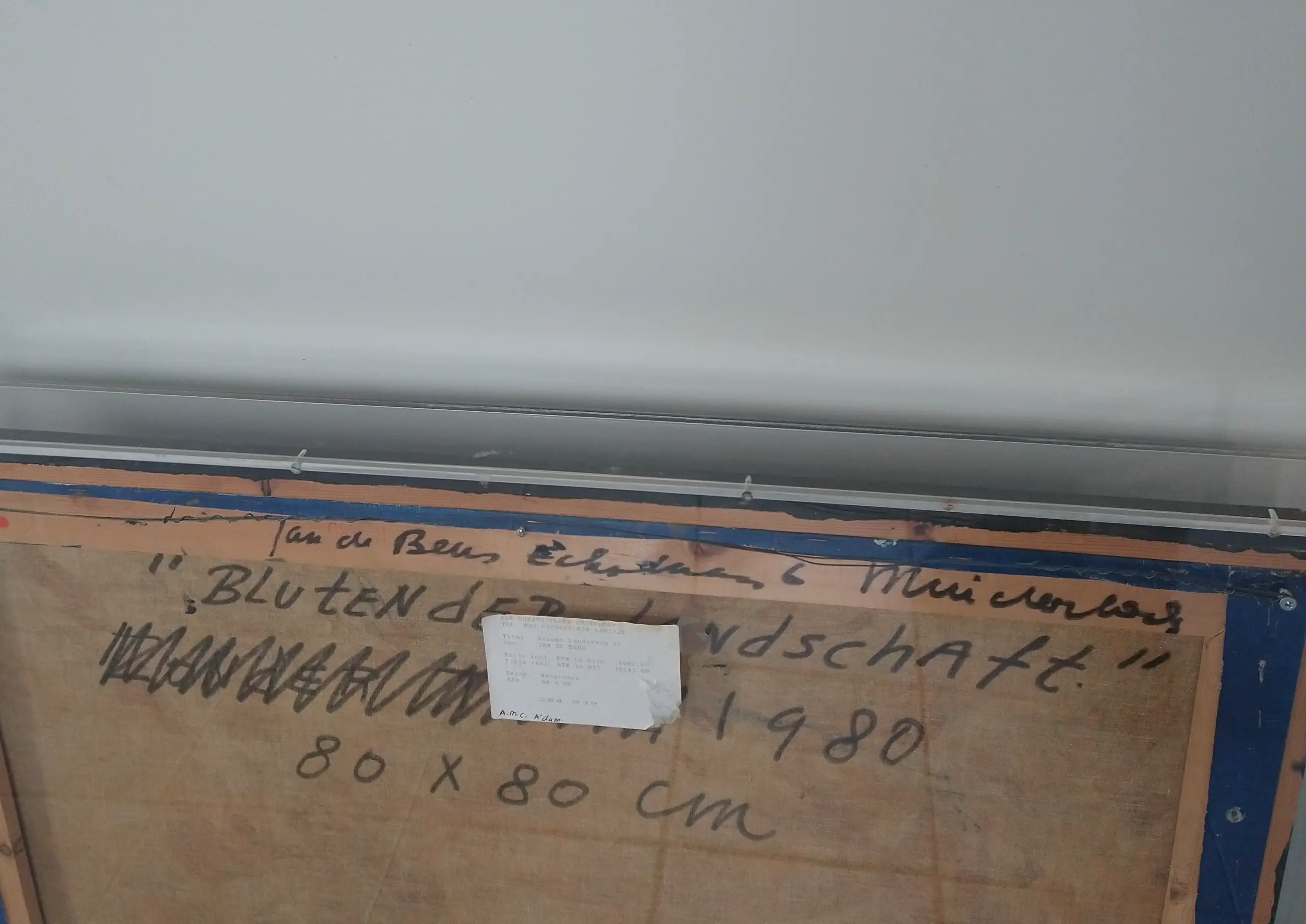 Aan de voorzijde is het gesigneerd en gedateerd 1980 Aan de achterzijde zitten enkele labels en staat de titel en nogmaals de signatuur