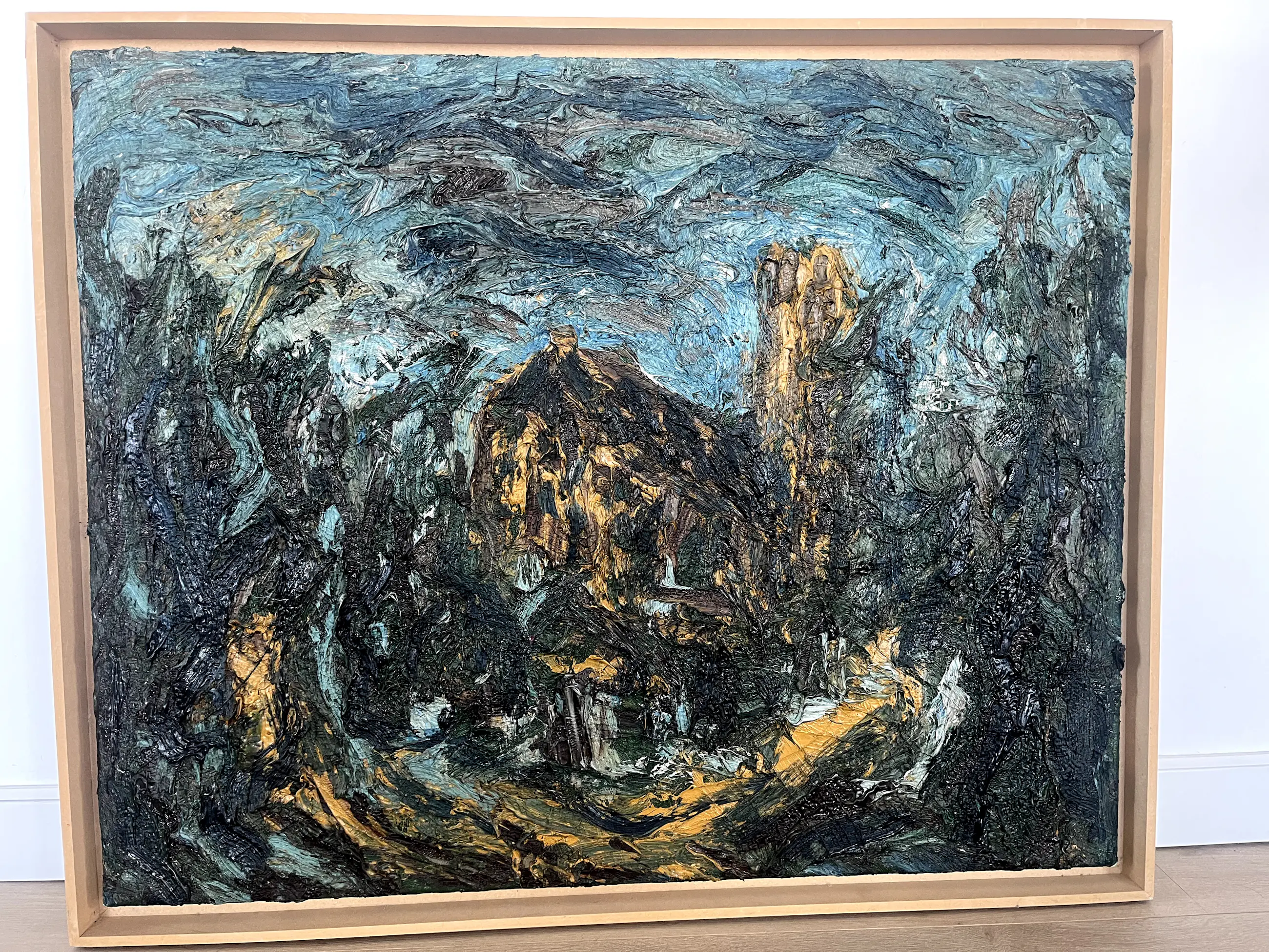 Mooi werk van de Kerk van Muiderberg bij zee. Herkenbare dikke verf in blauw, grijs, zwart en geel kleuren (vooral die laatste komt op foto minder duidelijk uit). In baklijst.