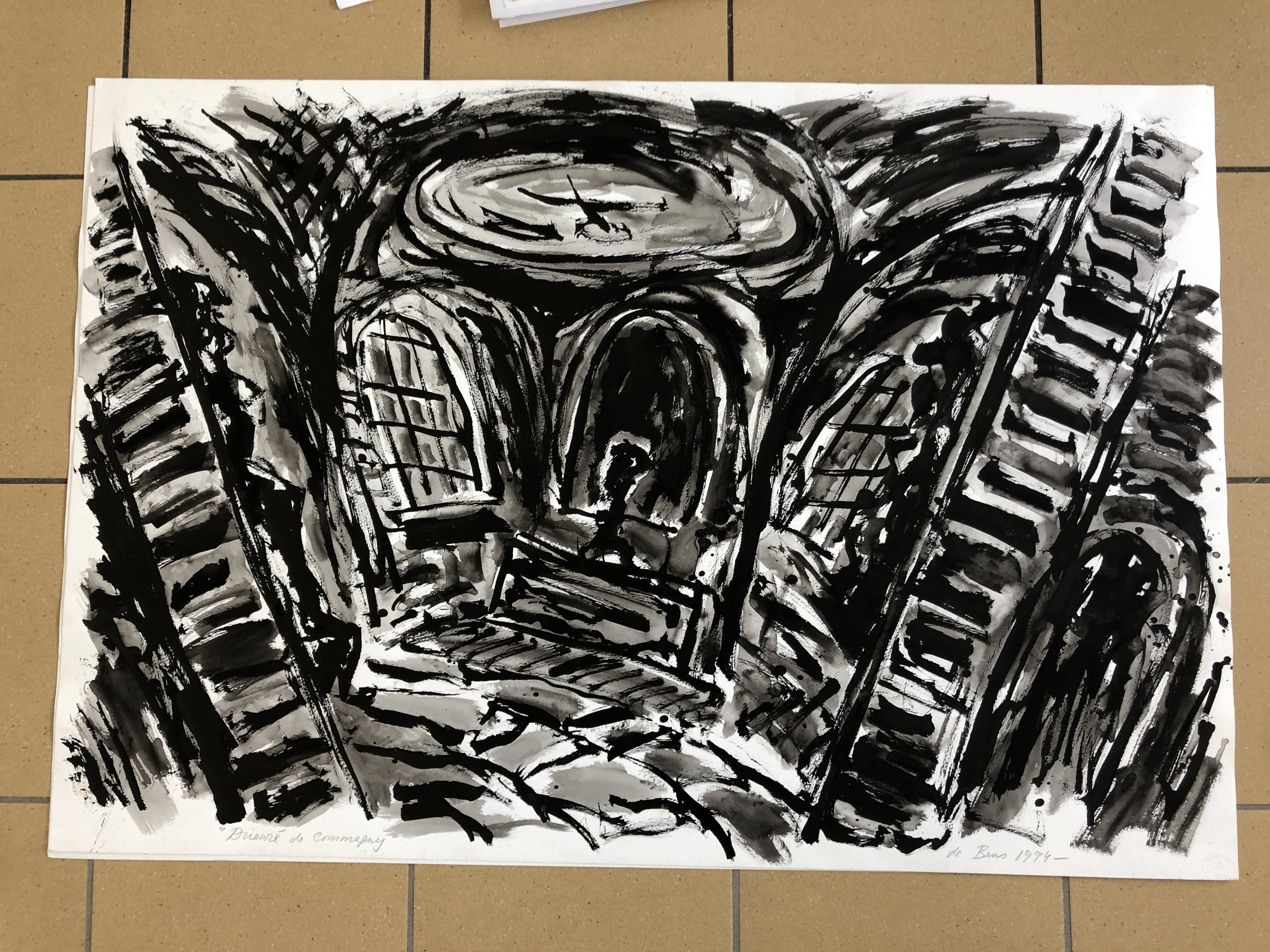 Grote zwart-wittekening van De Beus. Gesigneerd en met titel. U kunt het werk vooraf komen beoordelen in onze schatkamer in Gorcum. U kunt werk bij ons laten opslaan en wij kunnen uw inlijsting verzorgen.