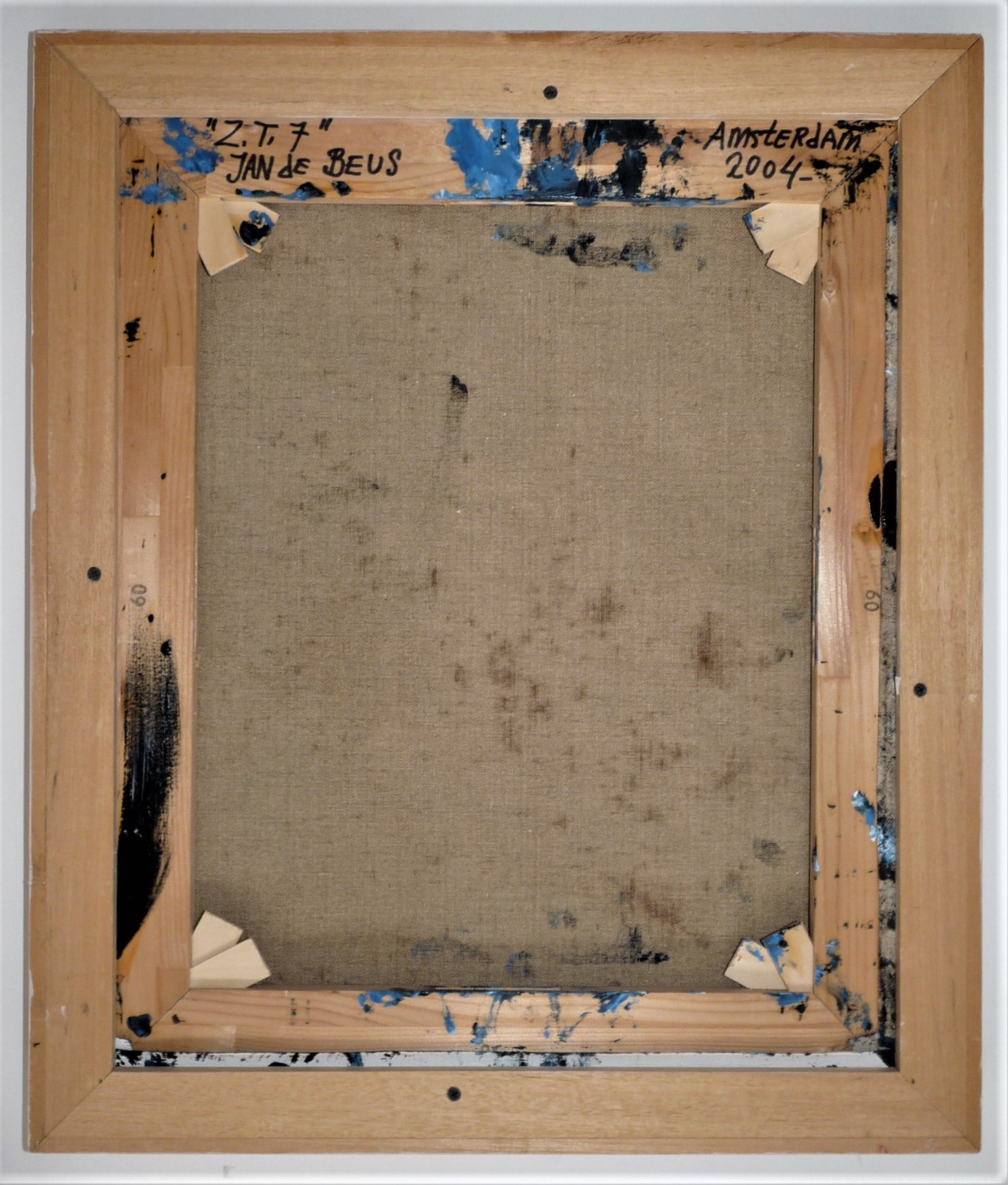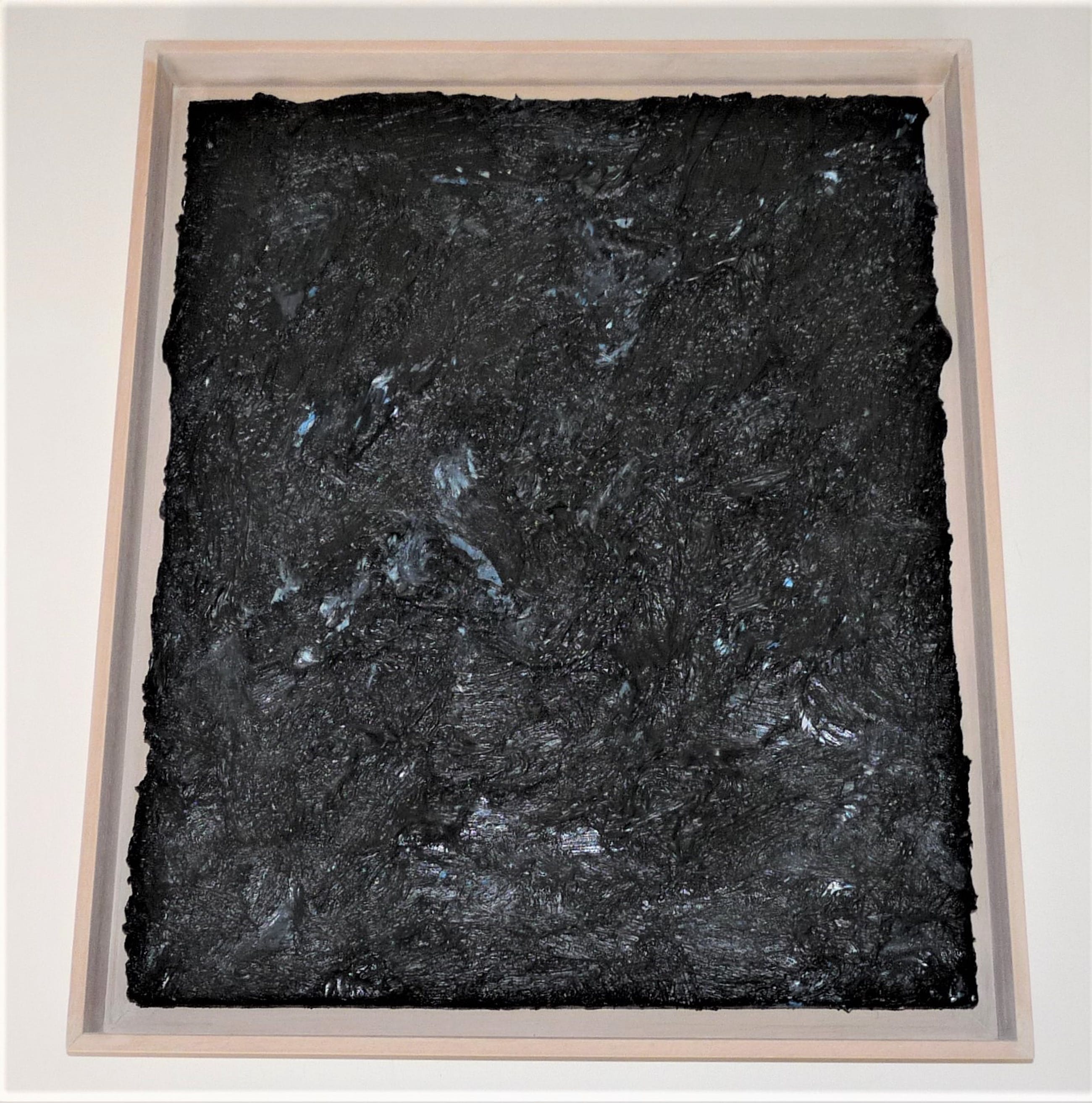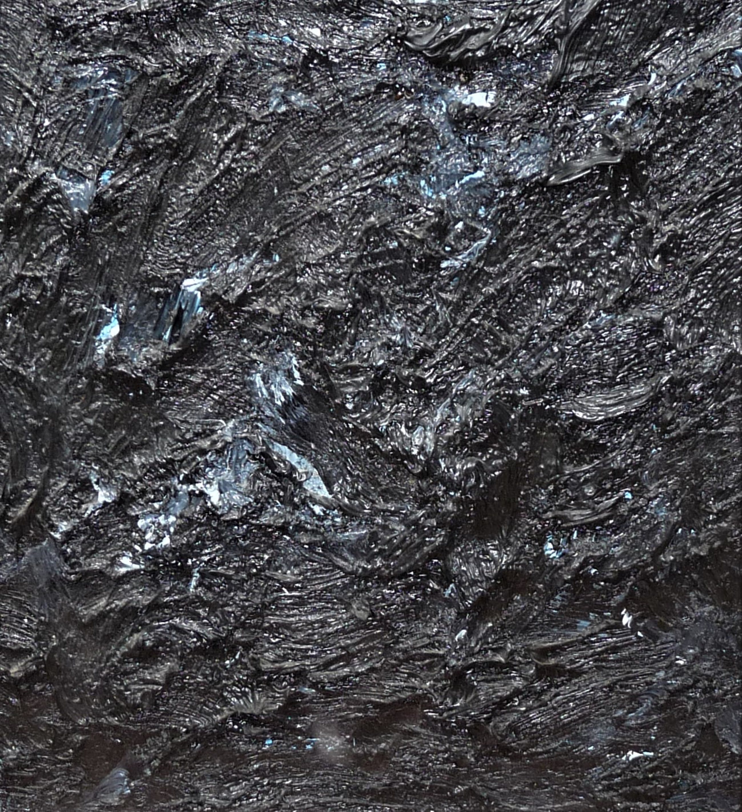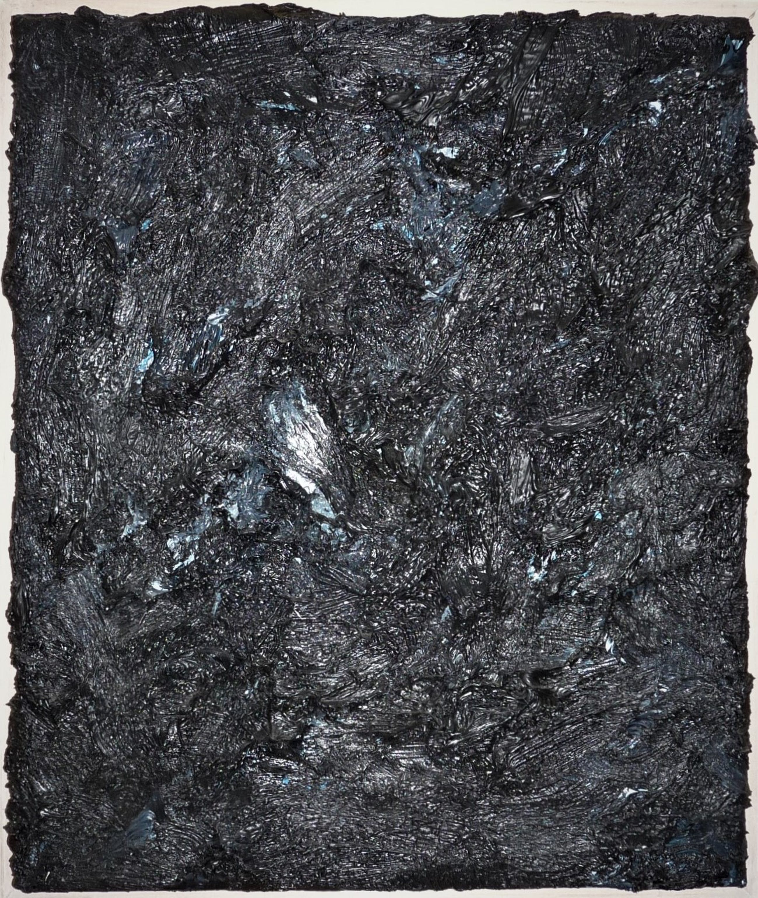 Bijzonder fraai werk van de kunstenaar Jan de Beus. Een van de zwarte werken die hij in 2004 maakte. Betreft een zeer pasteus werk en zwaar van gewicht door de hoeveelheid verf. De verfstreken, dikte en diepte van de verf maken het werk spannend, hetgeen helaas niet optimaal op de fotos is te tonen. Van deze zwarte werken (deze met hier en daar een heel klein beetje blauw) heeft hij er niet veel gemaakt en dit exemplaar is een van de meer grotere van die reeks werken uit 2004.Aan het werk zou je meerdere uiteenlopende termen kunnen verbinden, zoals: monochroom, minimalistisch, expressief, pasteus, materiekunst enz.