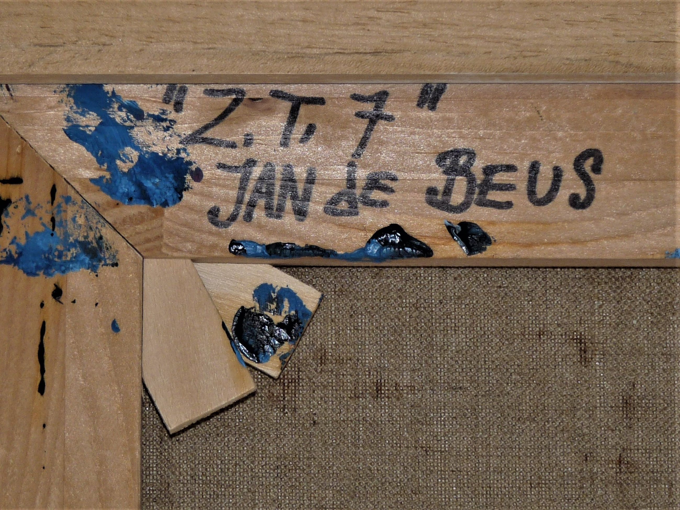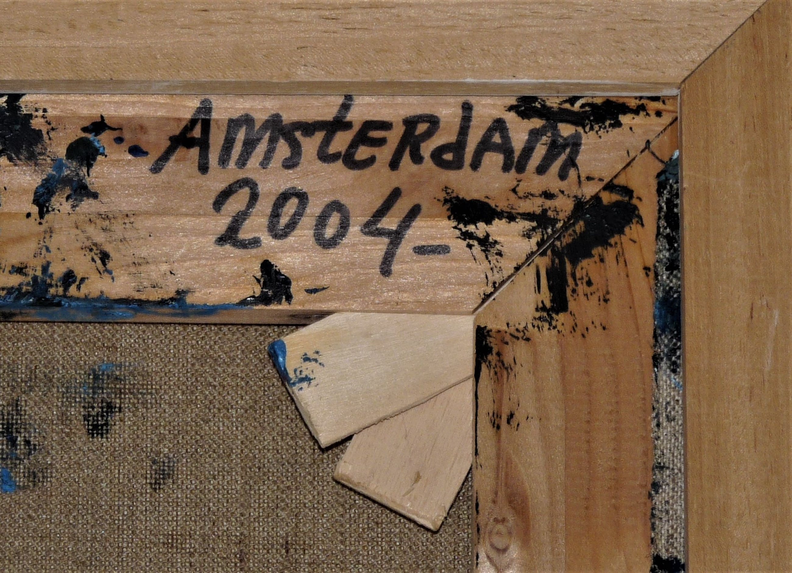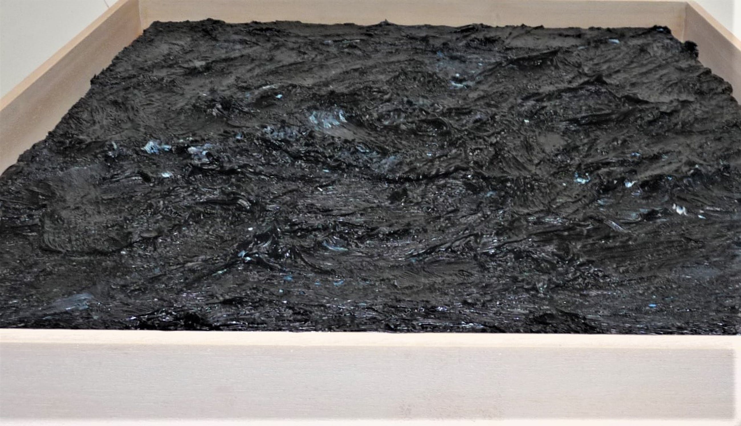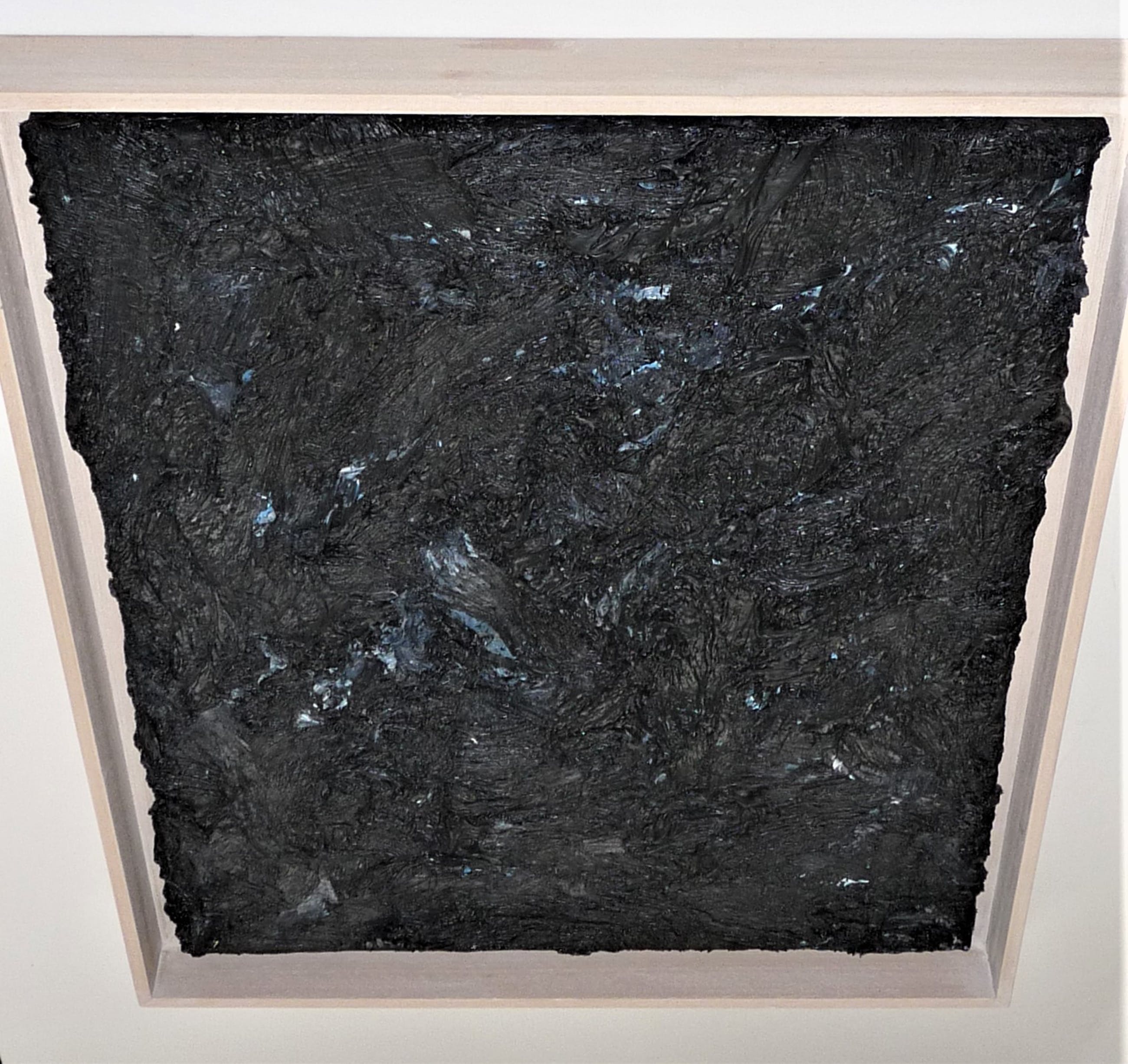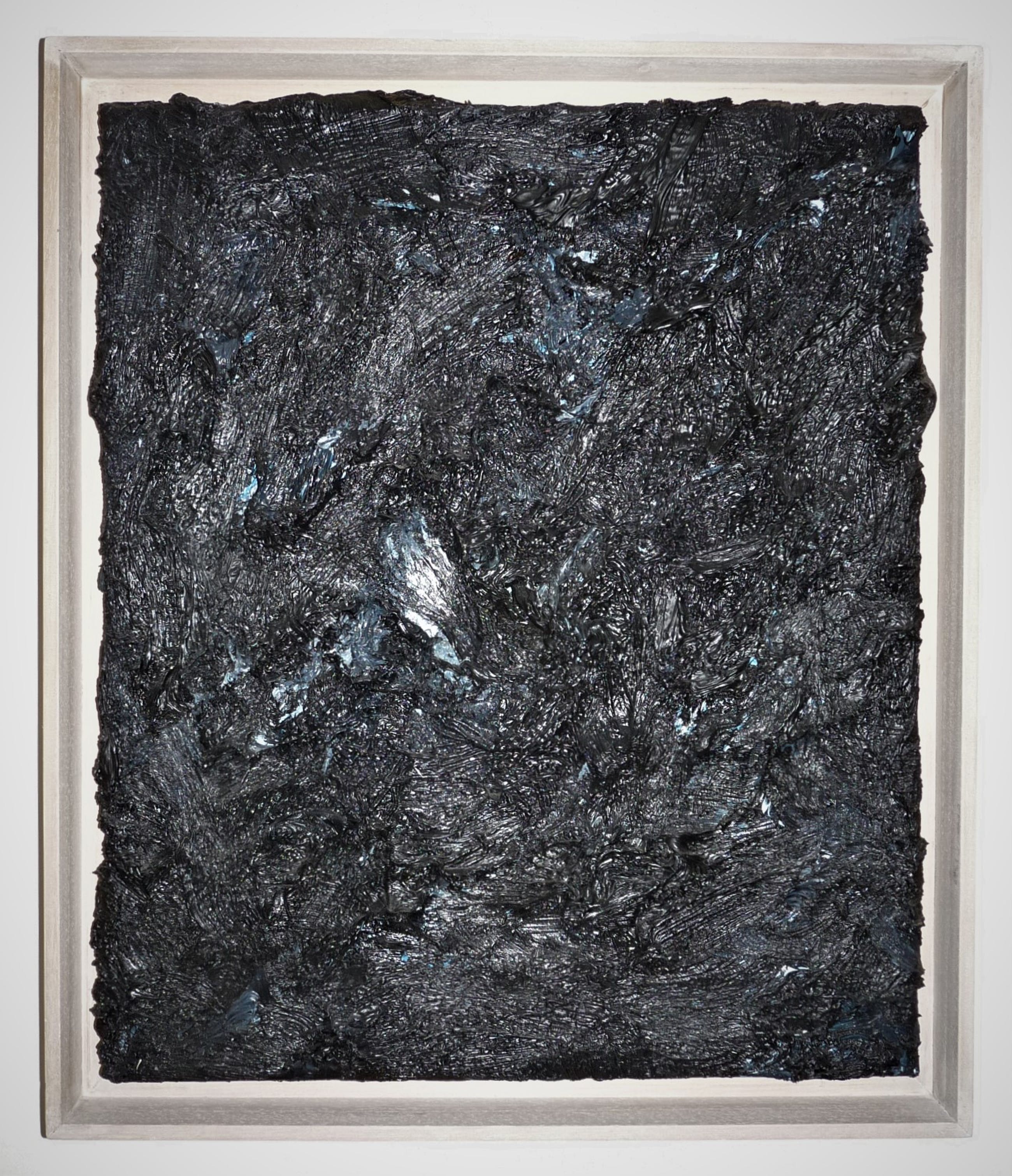 Bijzonder fraai werk van de kunstenaar Jan de Beus. Een van de zwarte werken die hij in 2004 maakte. Betreft een zeer pasteus werk en zwaar van gewicht door de hoeveelheid verf. De verfstreken, dikte en diepte van de verf maken het werk spannend, hetgeen helaas niet optimaal op de fotos is te tonen. Van deze zwarte werken (deze met hier en daar een heel klein beetje blauw) heeft hij er niet veel gemaakt en dit exemplaar is een van de meer grotere van die reeks werken uit 2004.Aan het werk zou je meerdere uiteenlopende termen kunnen verbinden, zoals: monochroom, minimalistisch, expressief, pasteus, materiekunst enz.