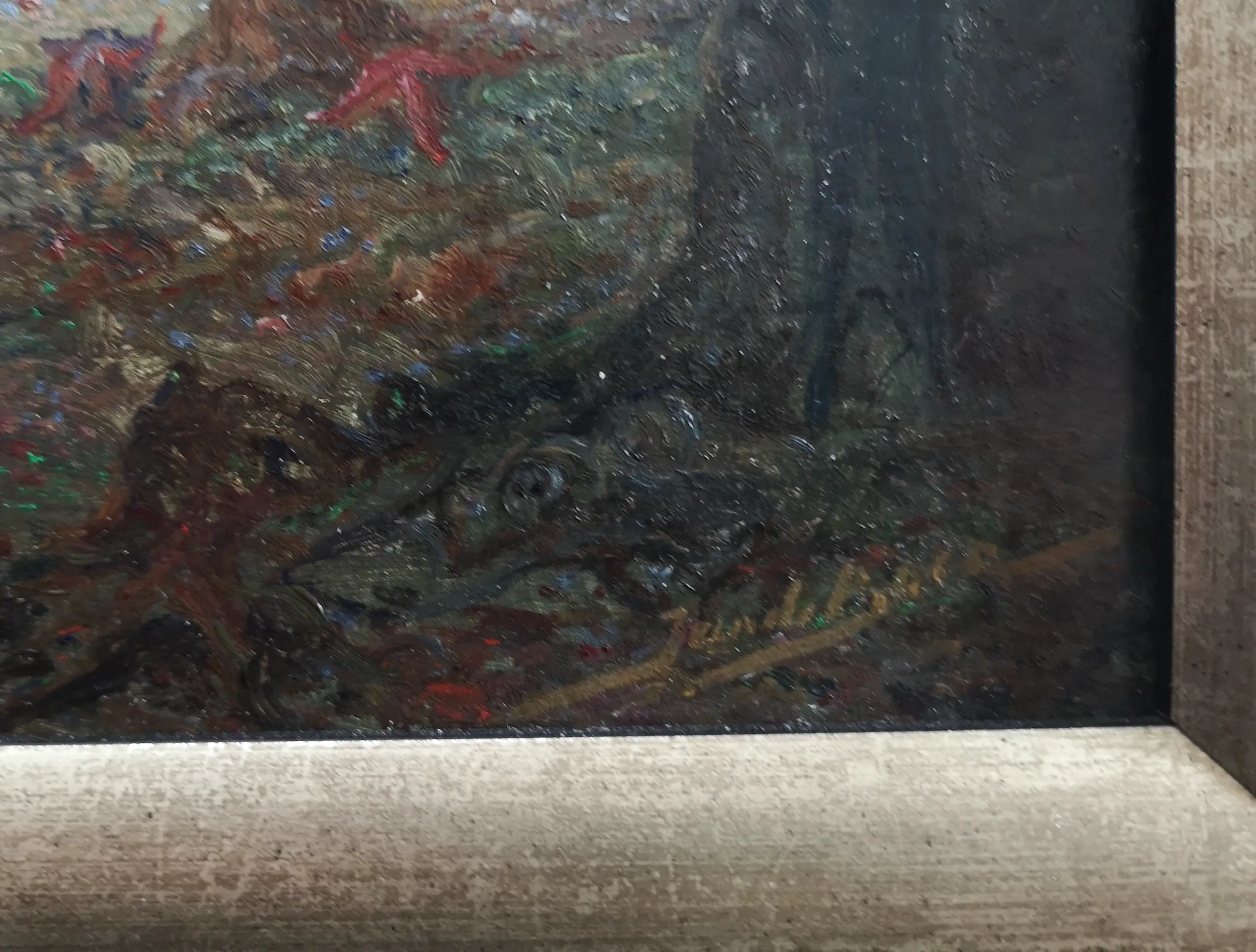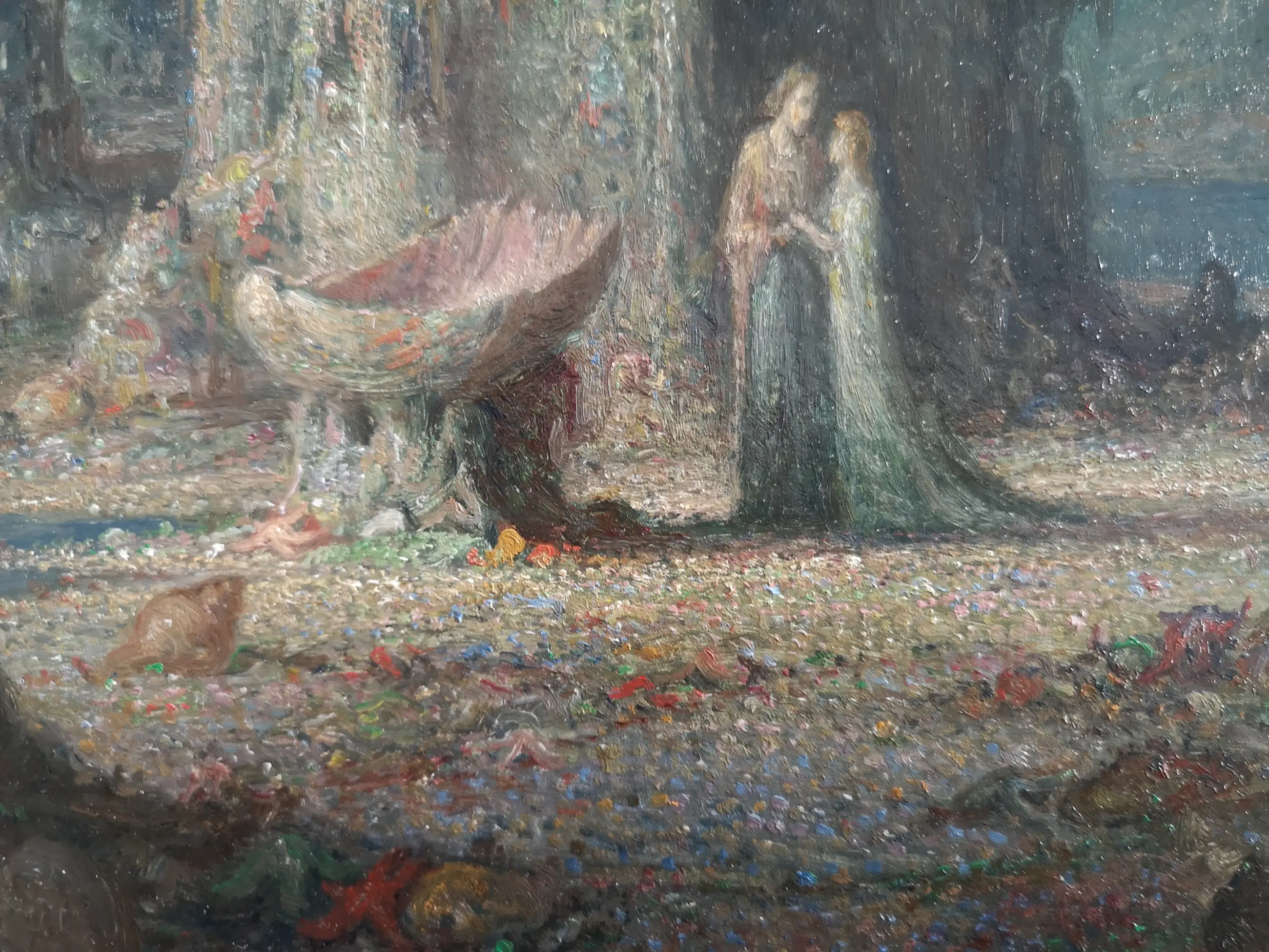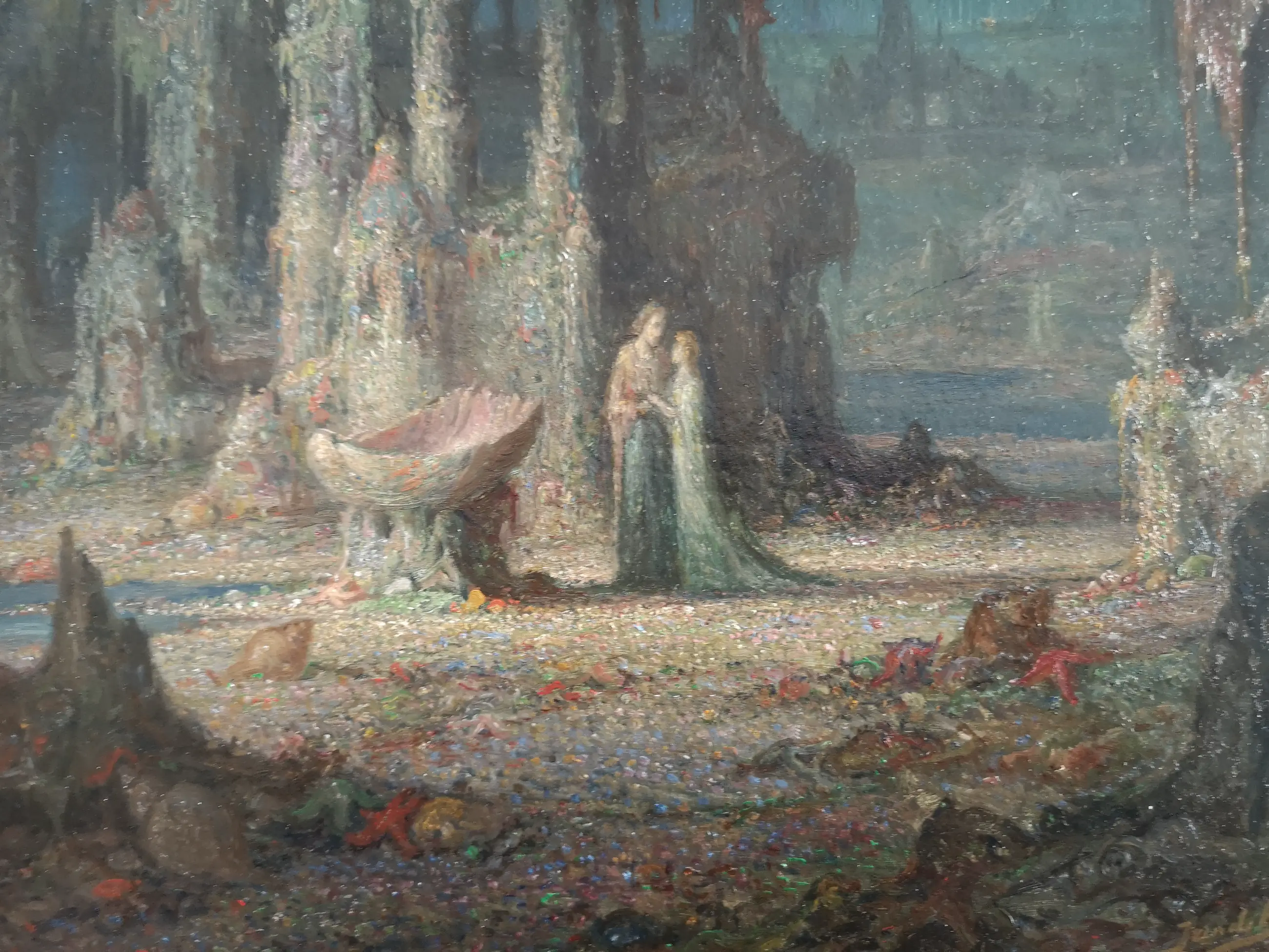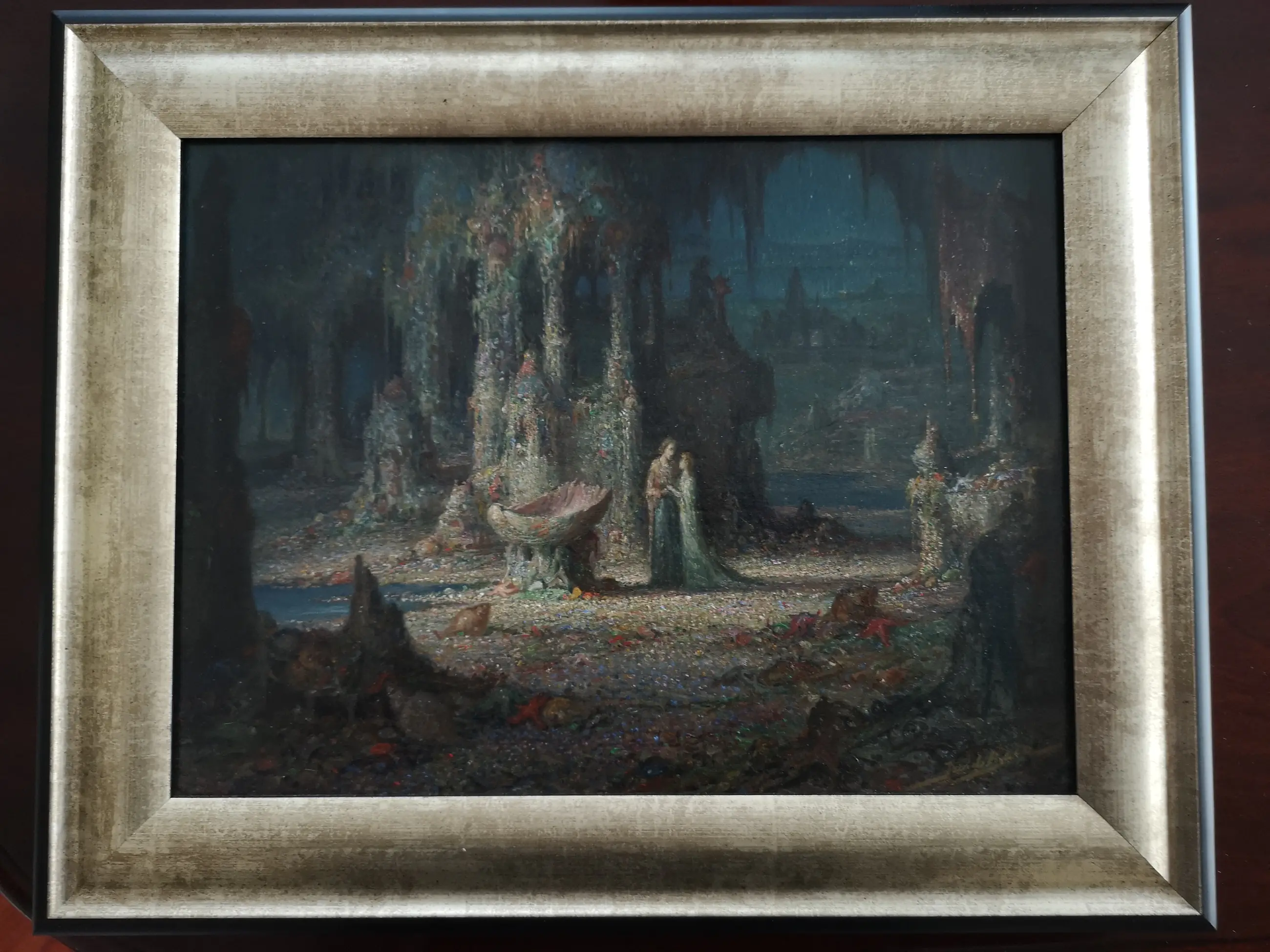 Een schilderij in olieverf van Jan de Boer met een karakteristiek fantasie onderwaterlandschap. Rechtsonder gesigneerd en op de achterzijde nogmaals met het adres van de schilder en de titel "De gelofte".
