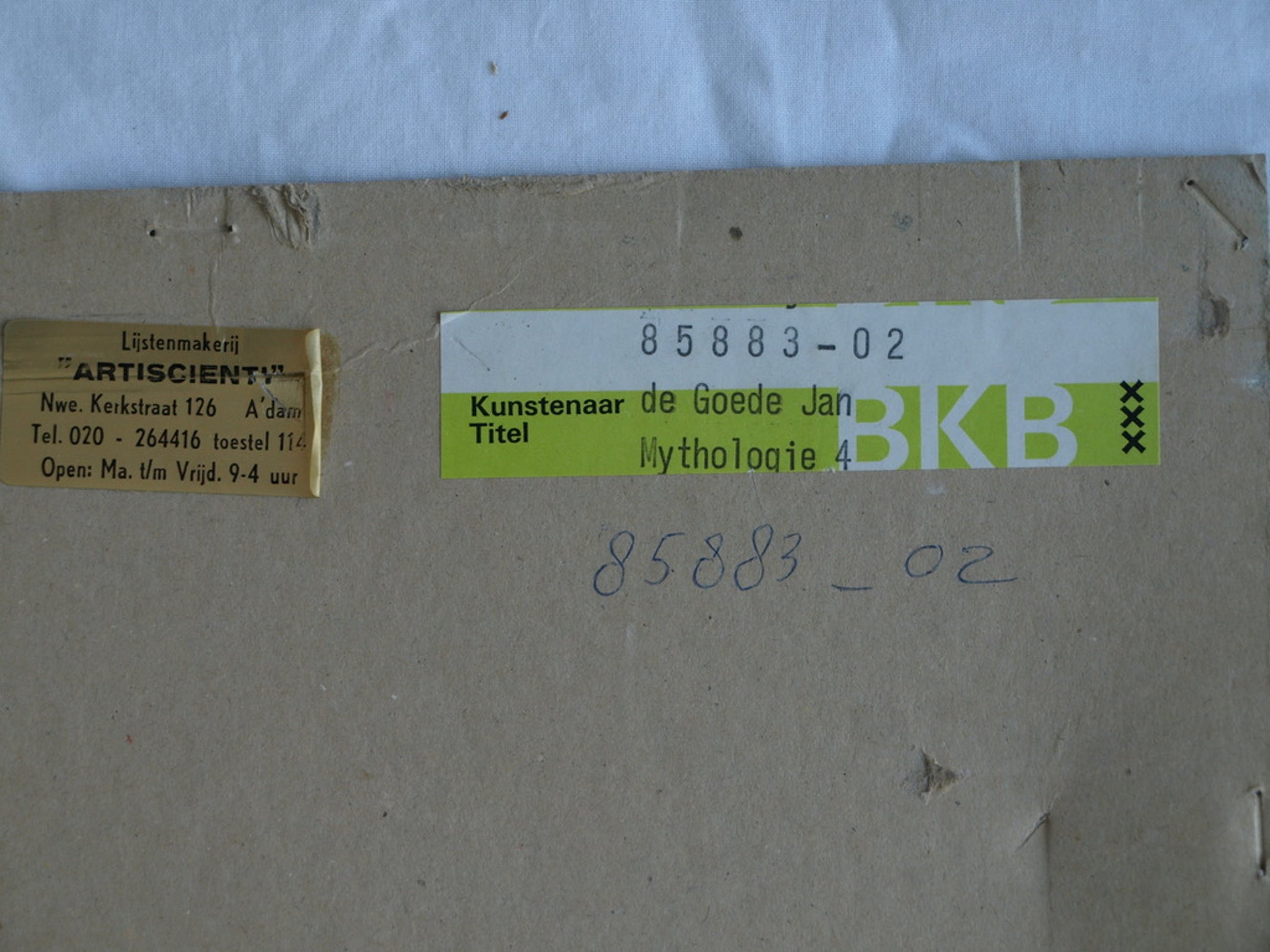 Het werk is niet meer ingelijst. De kartonnen achterplaat met informatie over dit werk, de kunstenaar en de herkomst, is nog wel aanwezig.