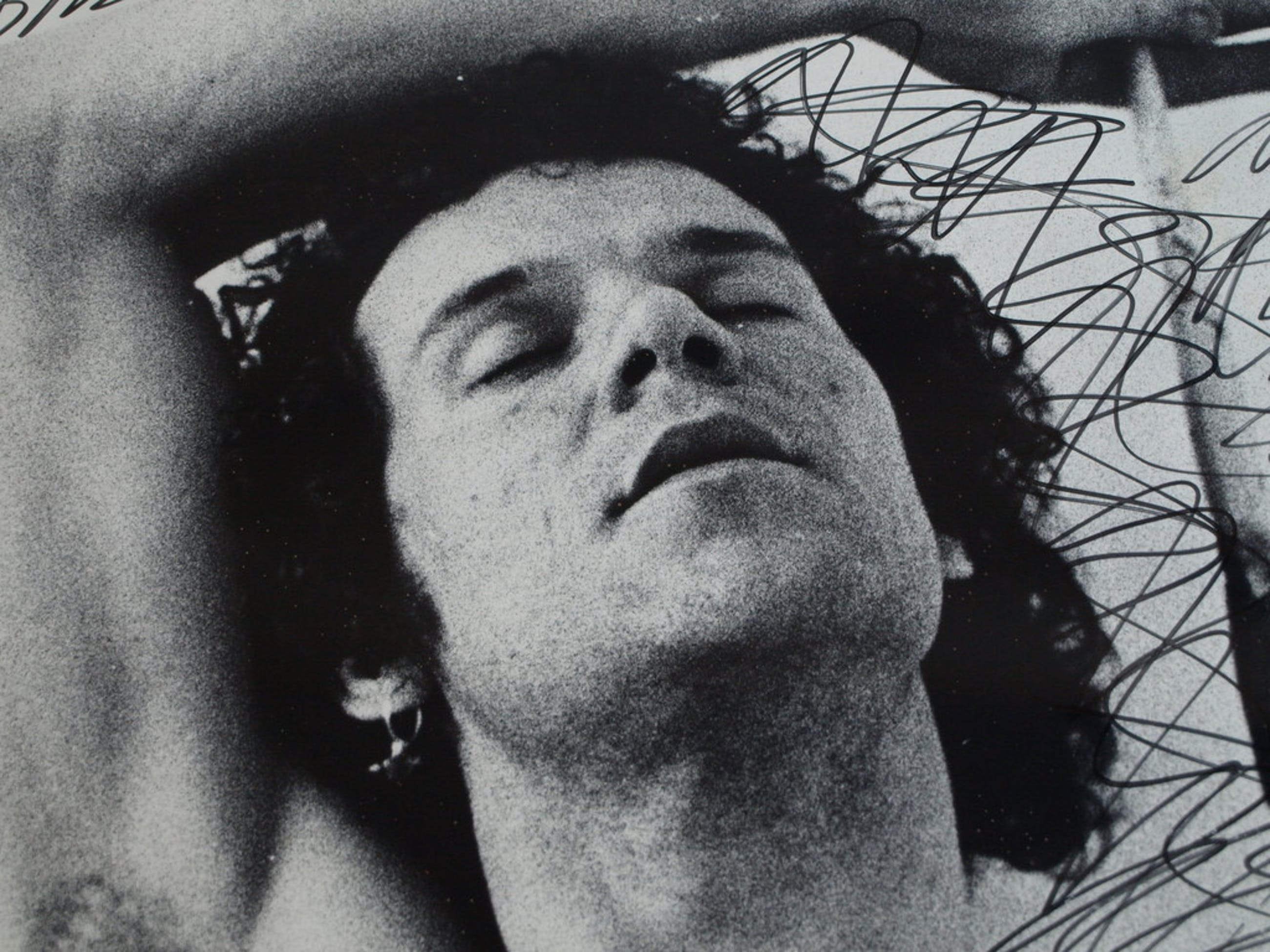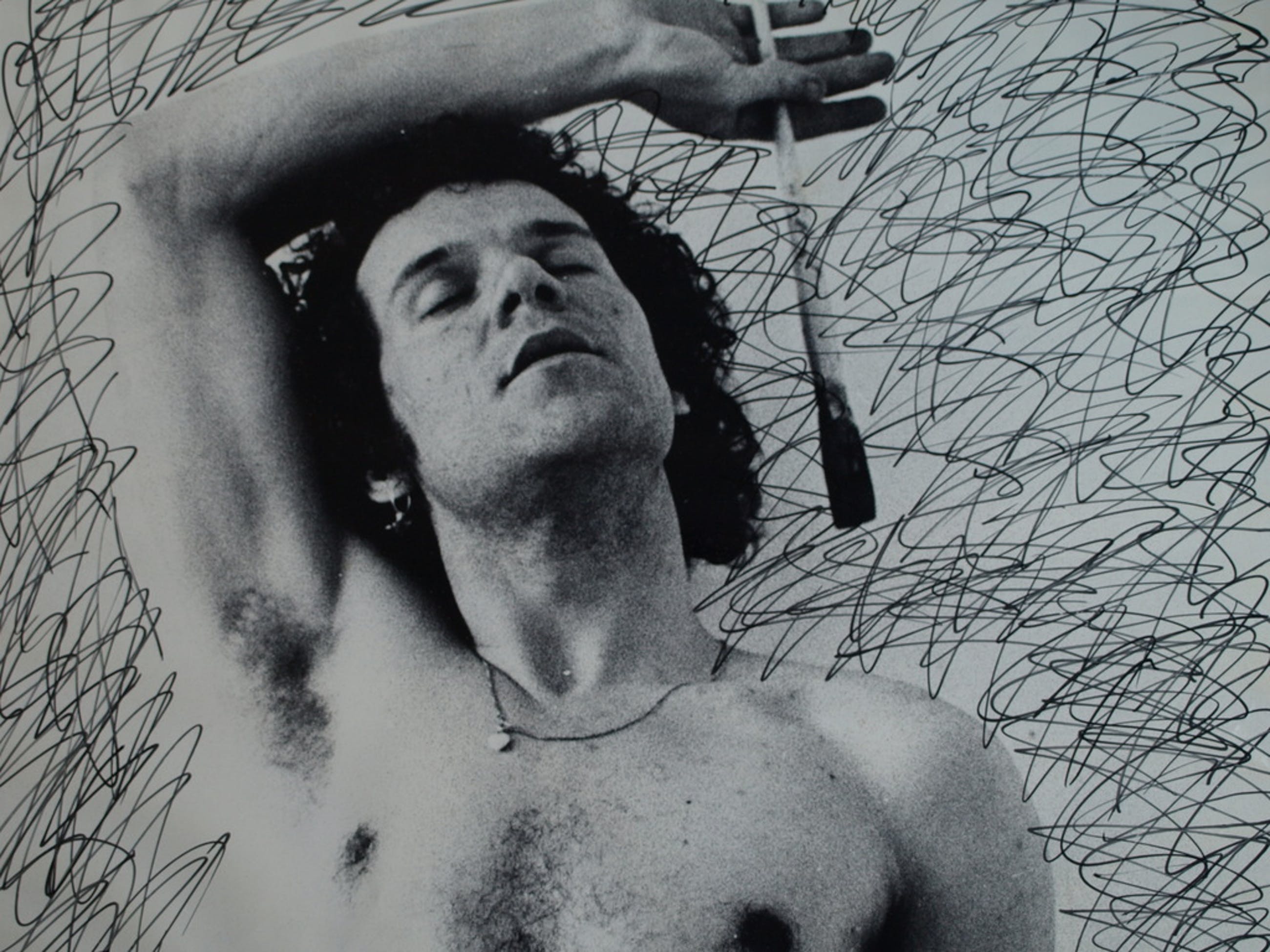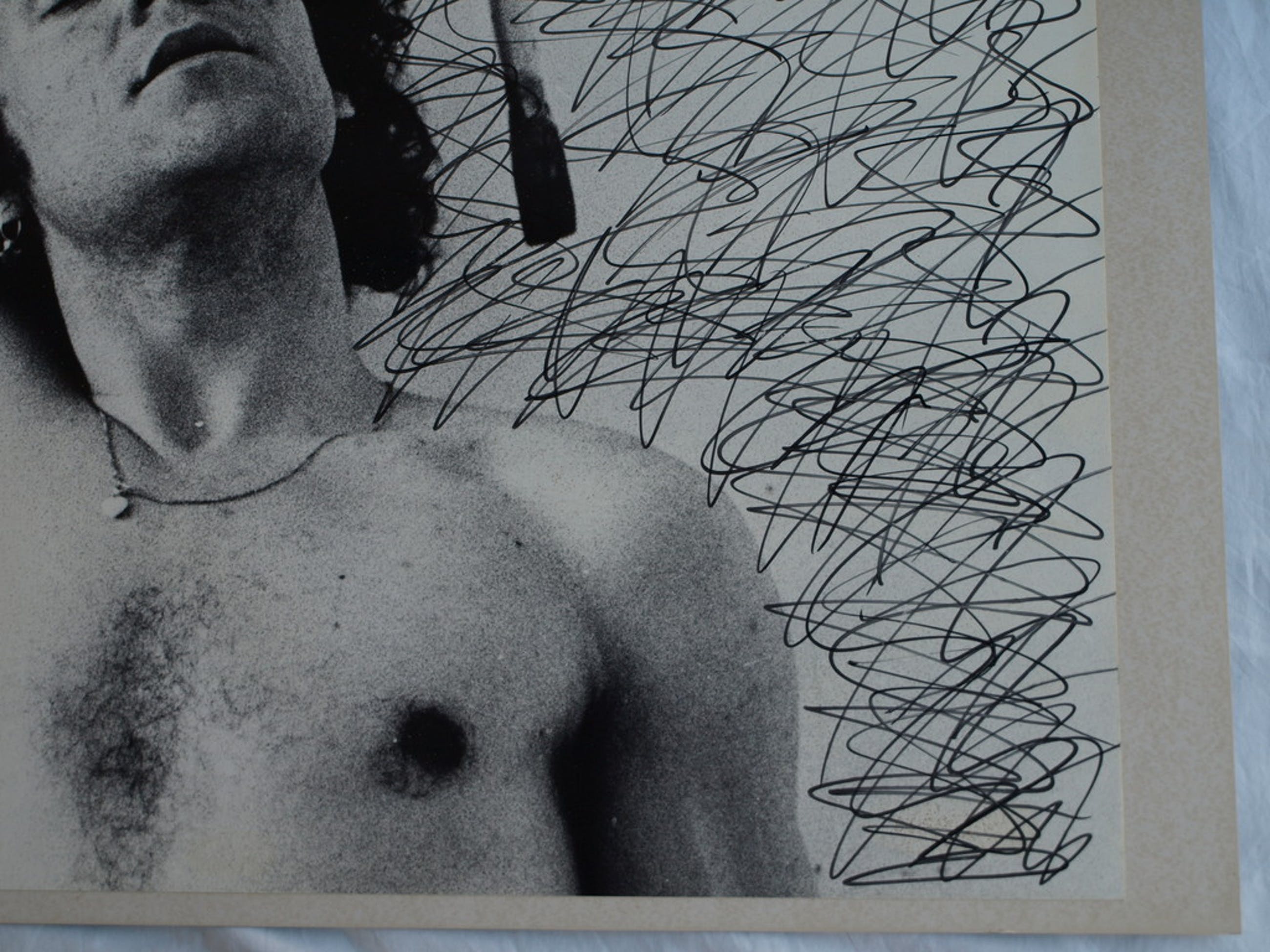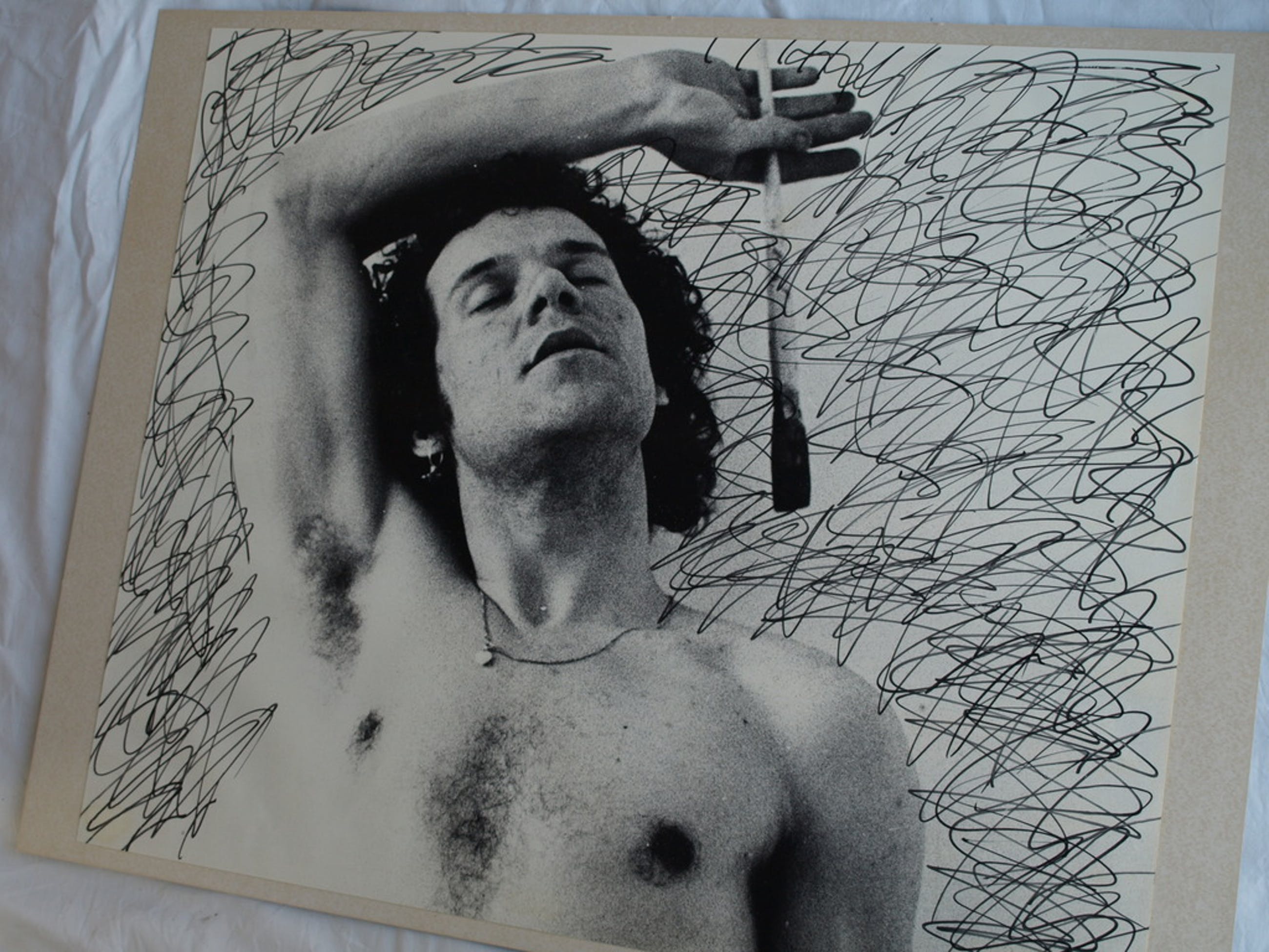 Een grote, met zwarte markeerstift bewerkte foto van de kunstenaar Jan de Goede uit ca 1975. Waarschijnlijk een zelfportret van de kunstenaar.