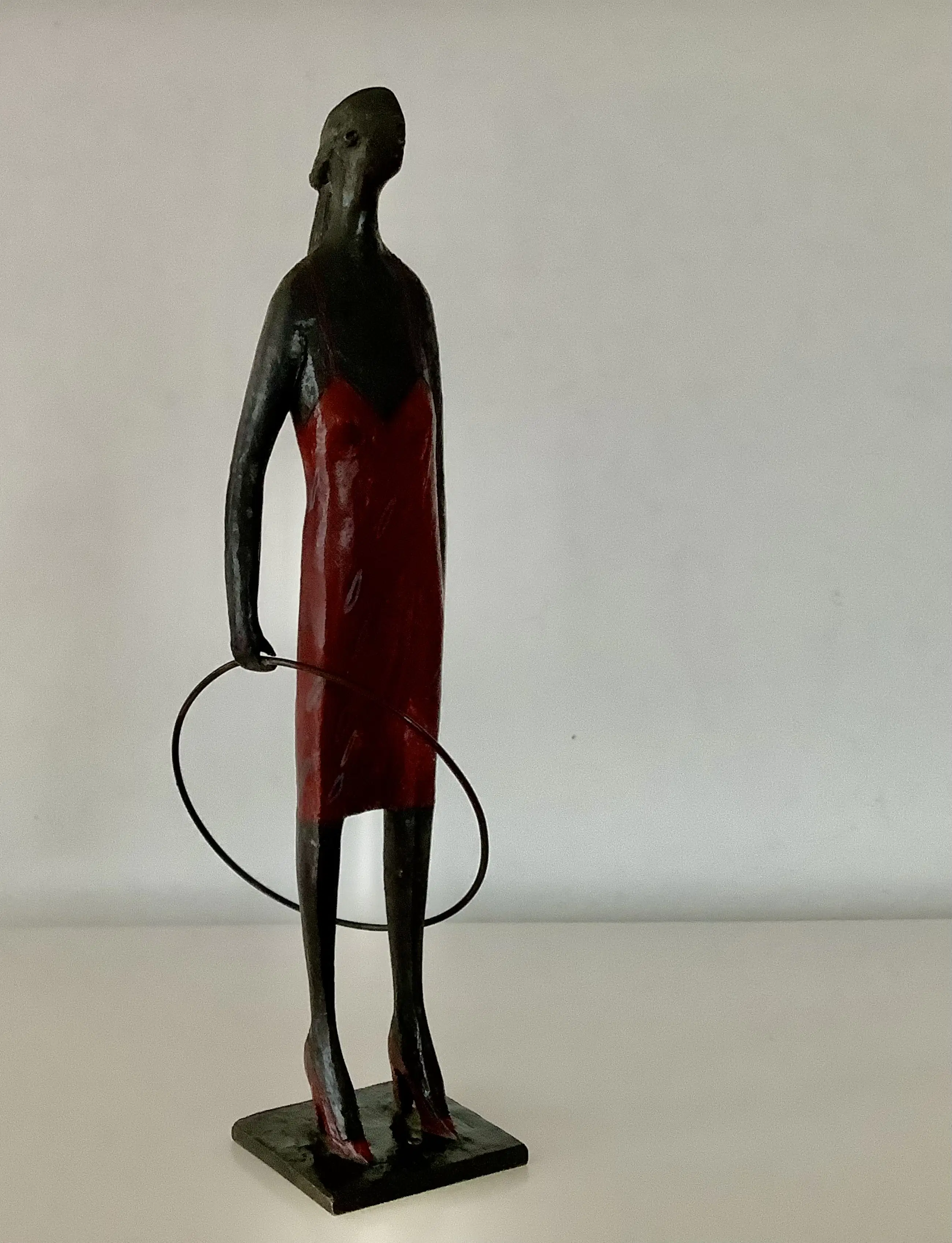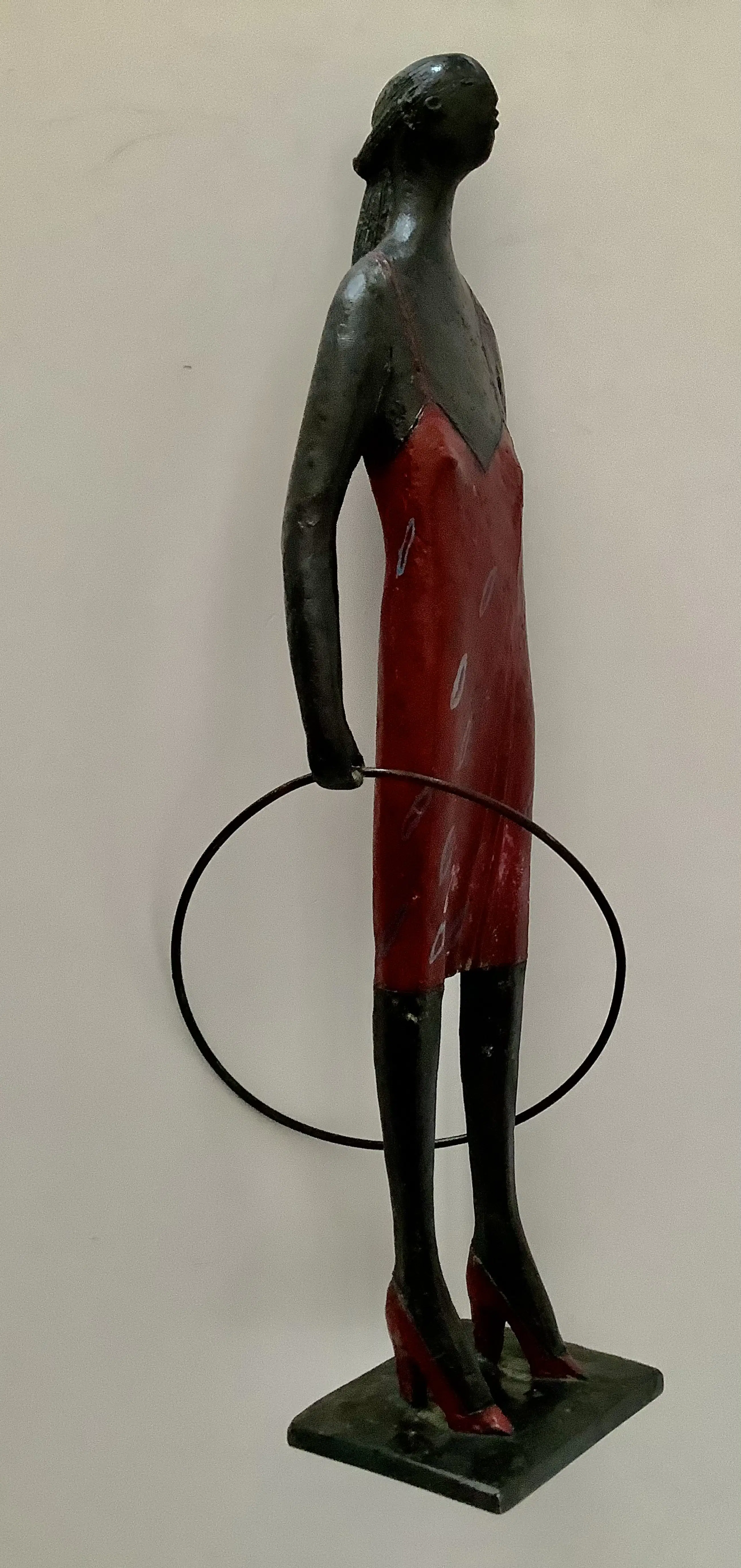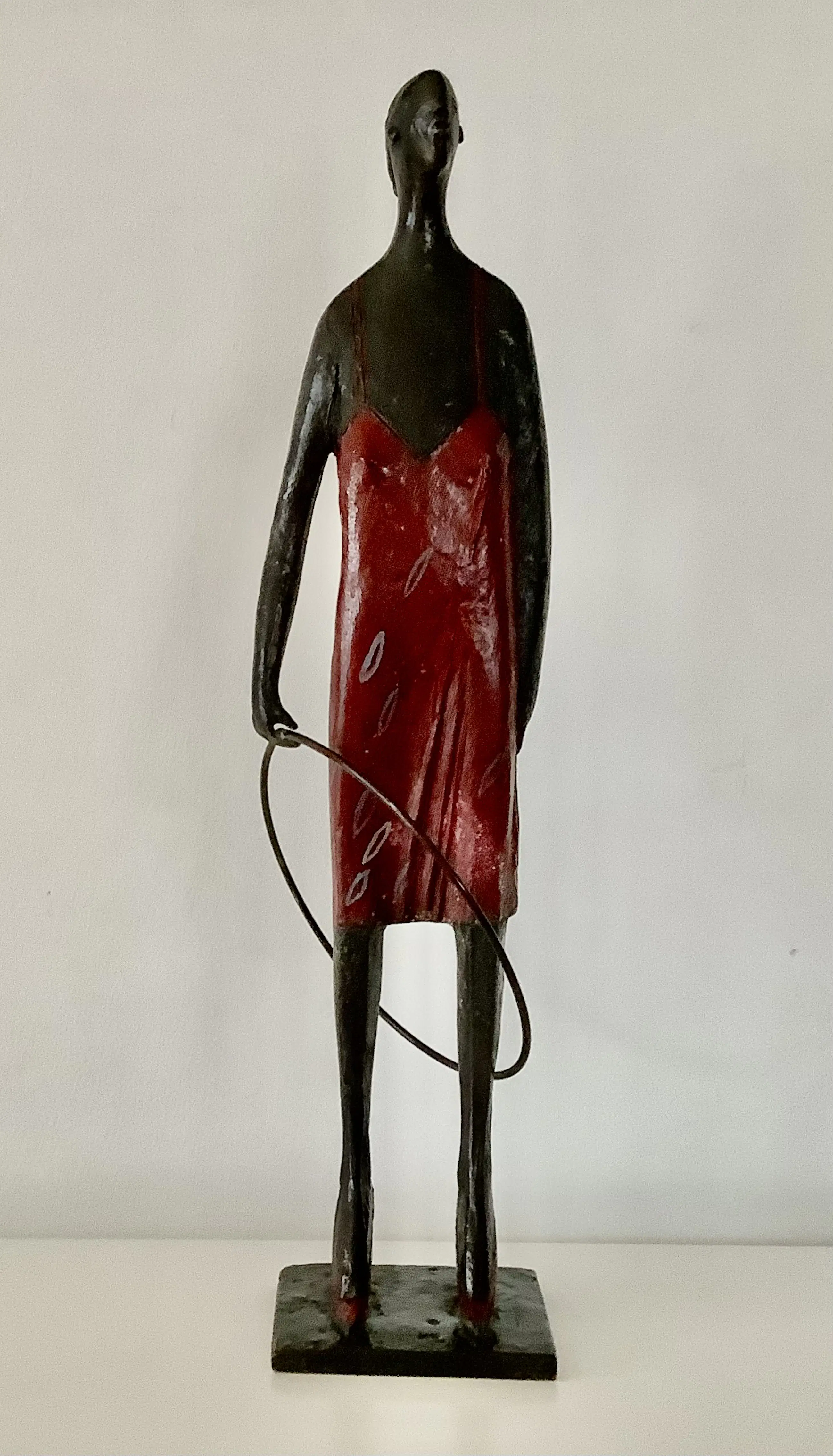 Fraaie sculptuur, sprekend door de rode accenten zoals jurk en hakken. Massief brons, gesigneerd onder de bodemplaat. Aantrekkelijk en decoratief beeld.