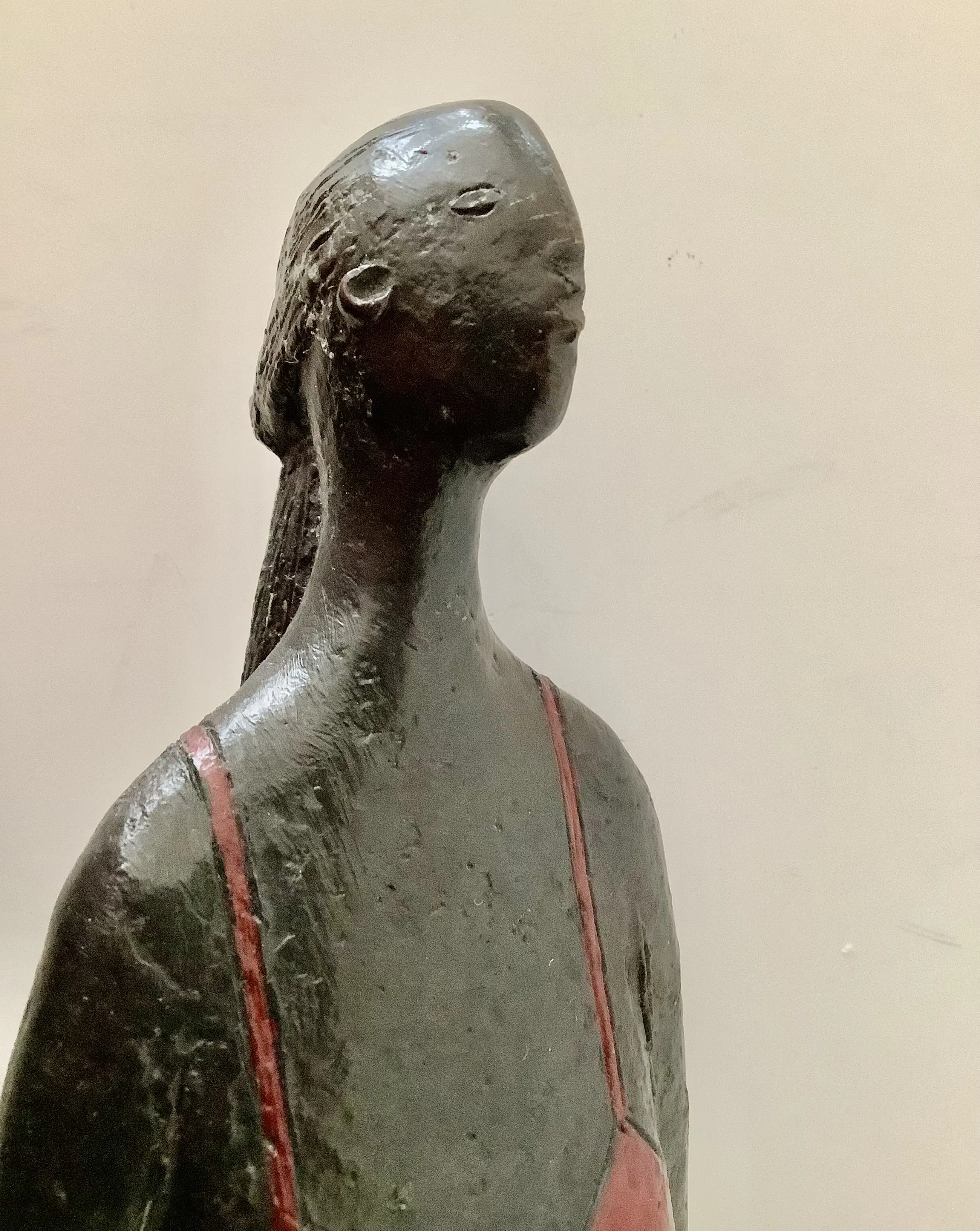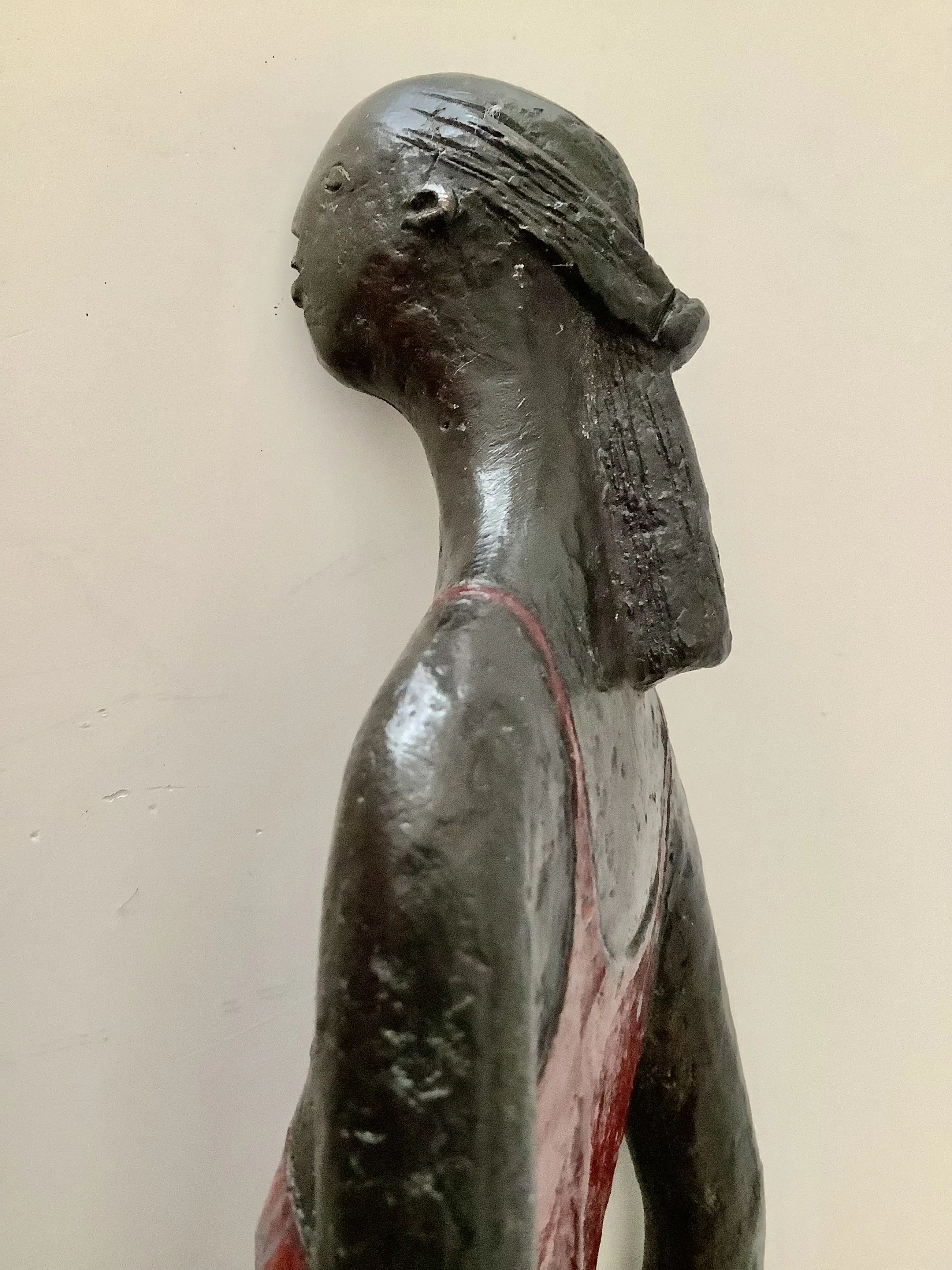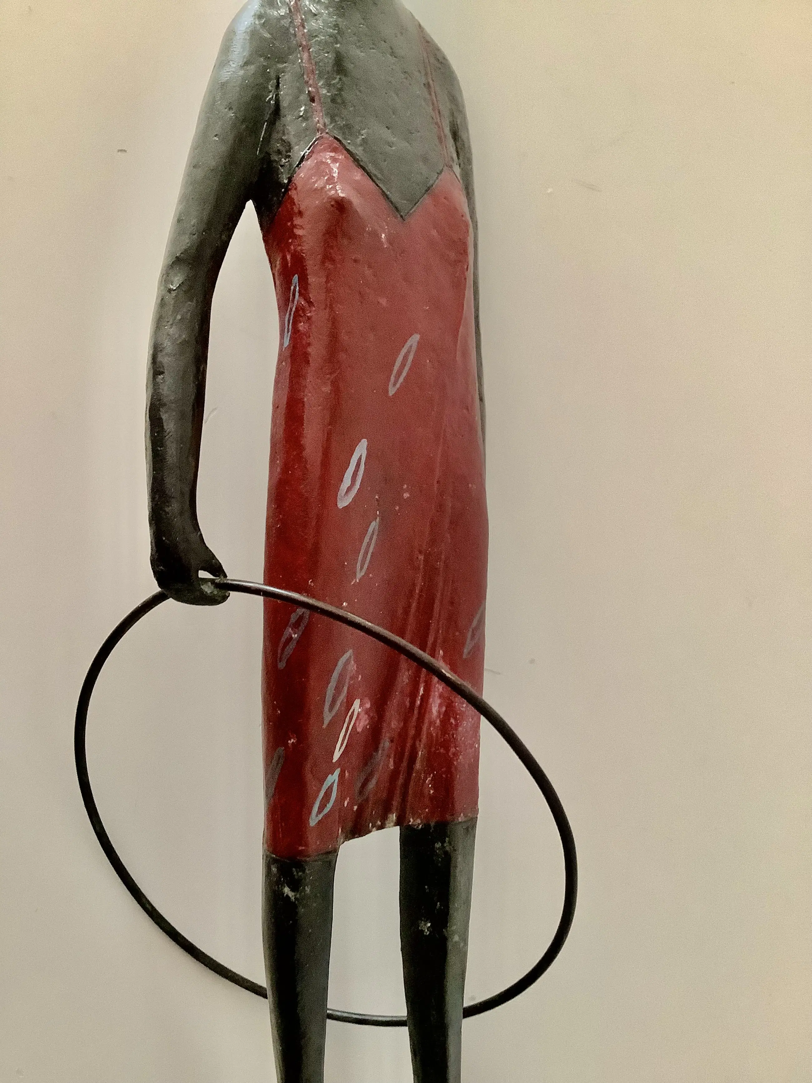 Fraaie sculptuur, sprekend door de rode accenten zoals jurk en hakken. Massief brons, gesigneerd onder de bodemplaat. Aantrekkelijk en decoratief beeld.