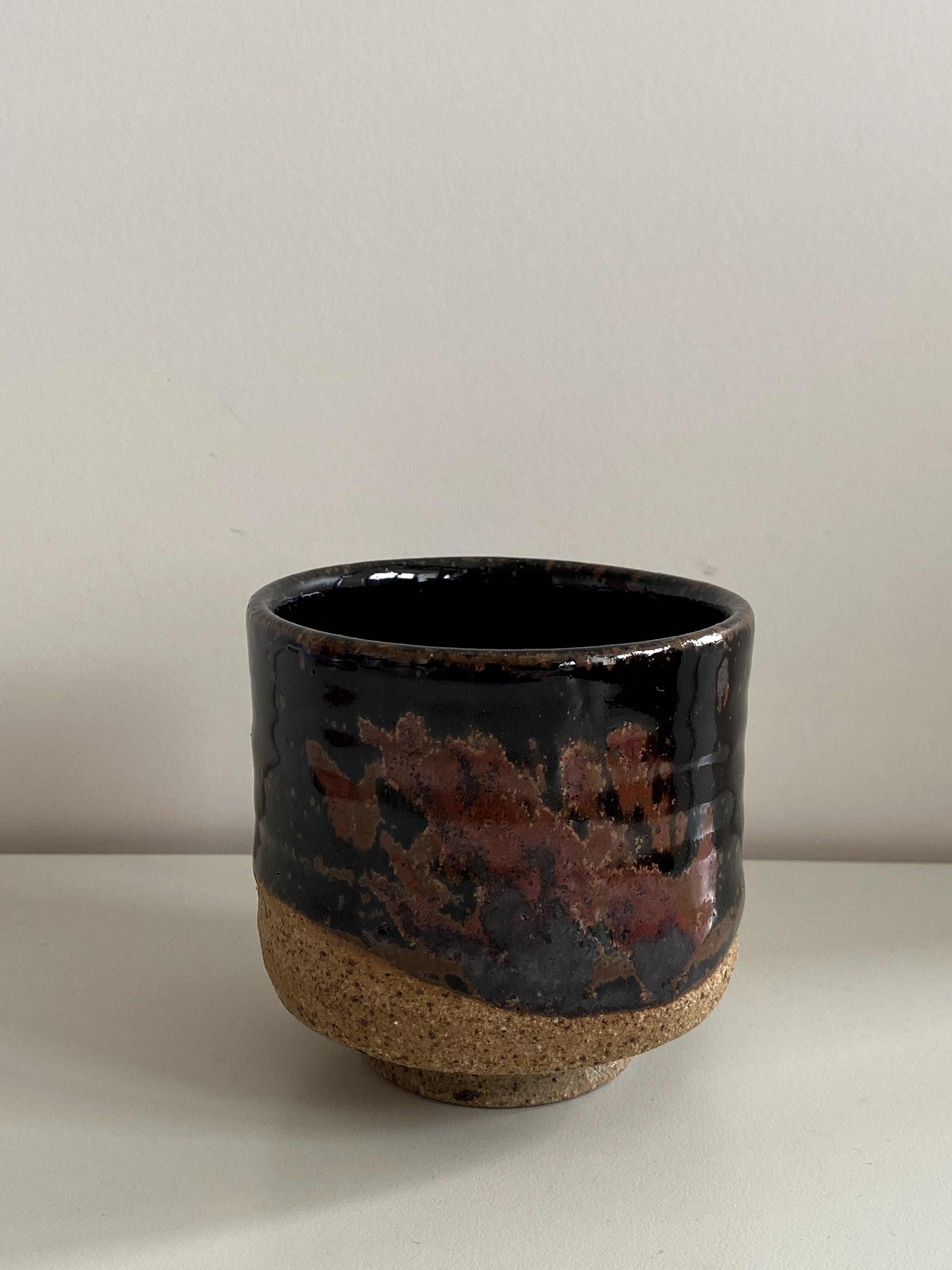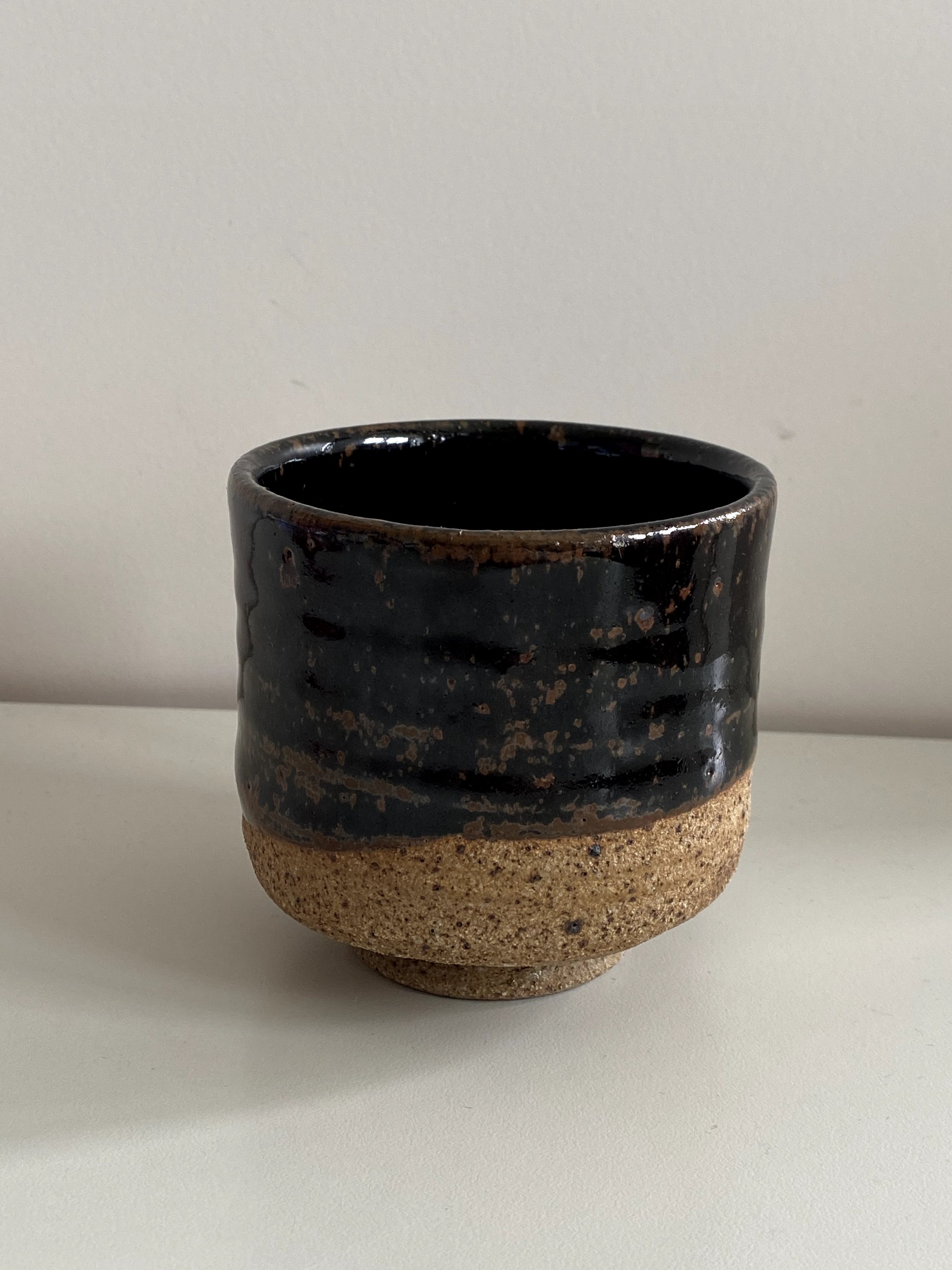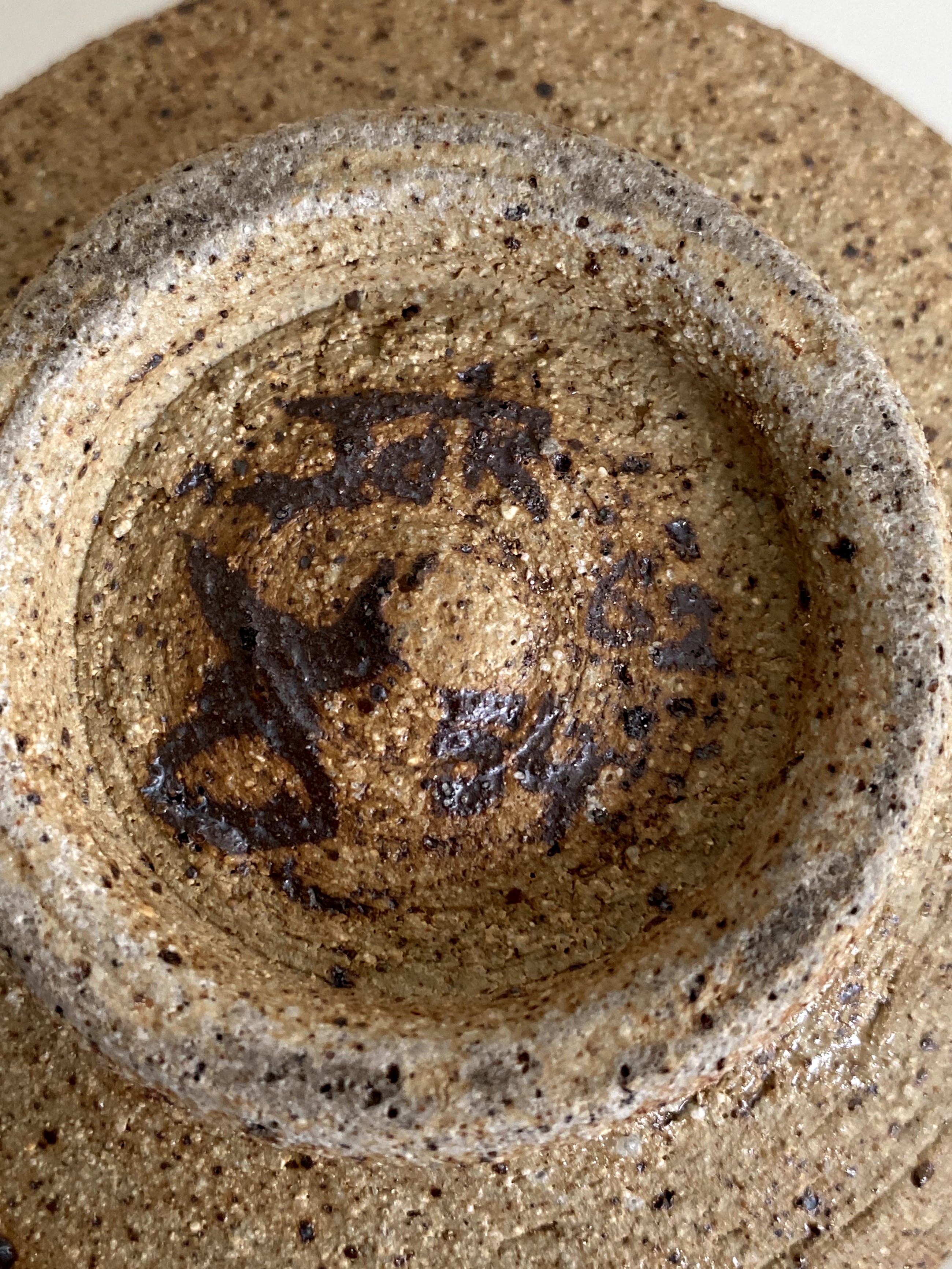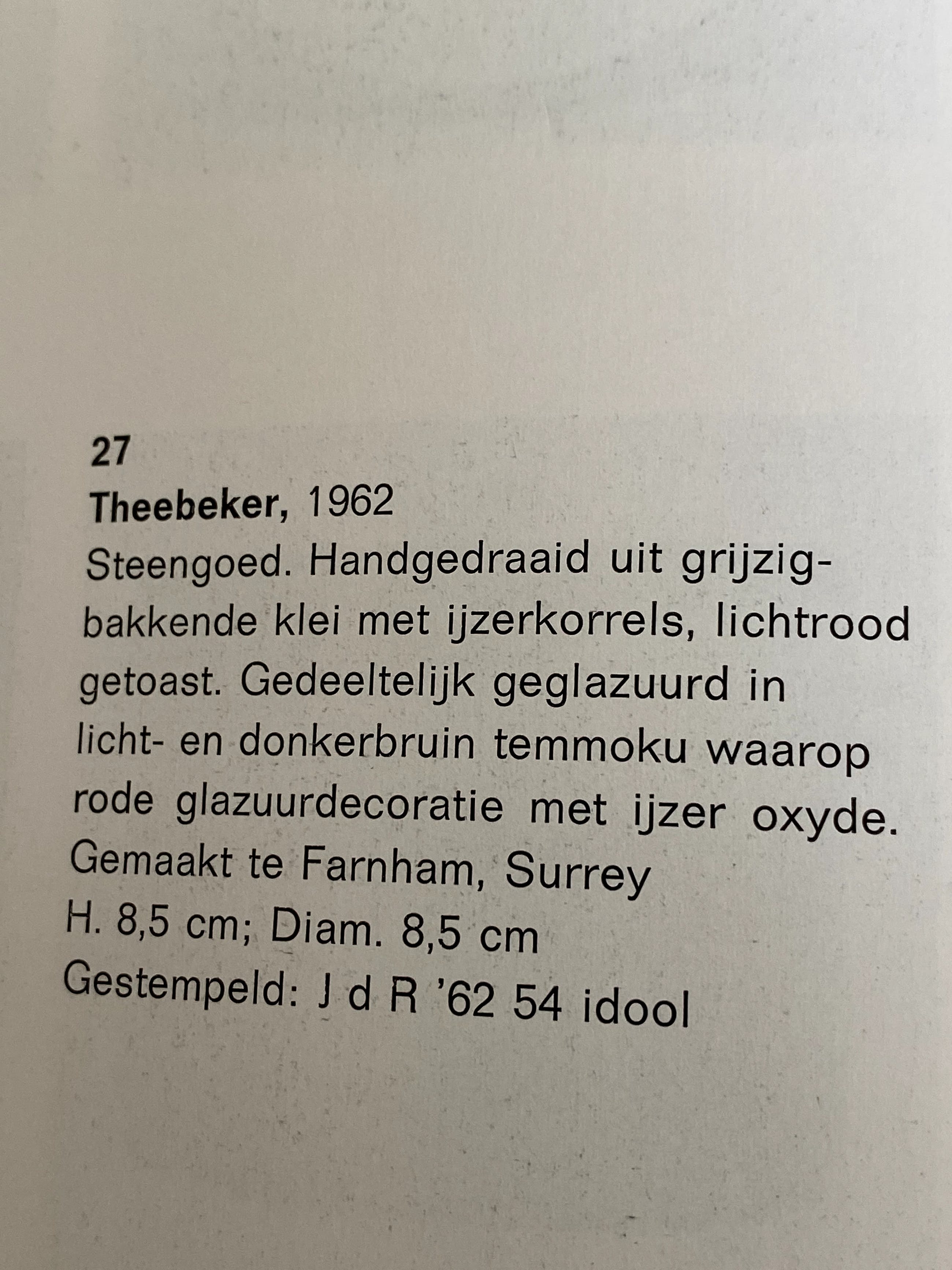prachtige hand gedraaide theekom in de Japanse traditie van Jan de Rooden. Gemaakt in Engeland tijdens een studiereis. Afkomstig uit de collectie Achterbergh. Opgenomen in de catalogus van de tentoonstelling "pottenkijker" in Museum Boijmans van Beuningen 1969. catalogus niet inbegrepen bij de koop.