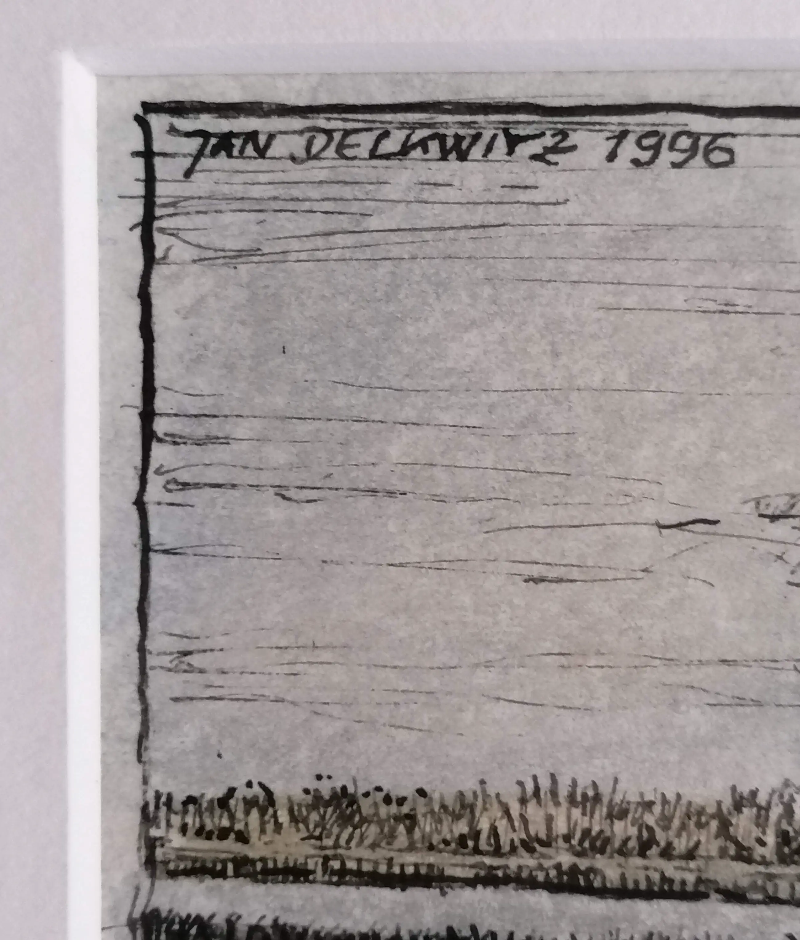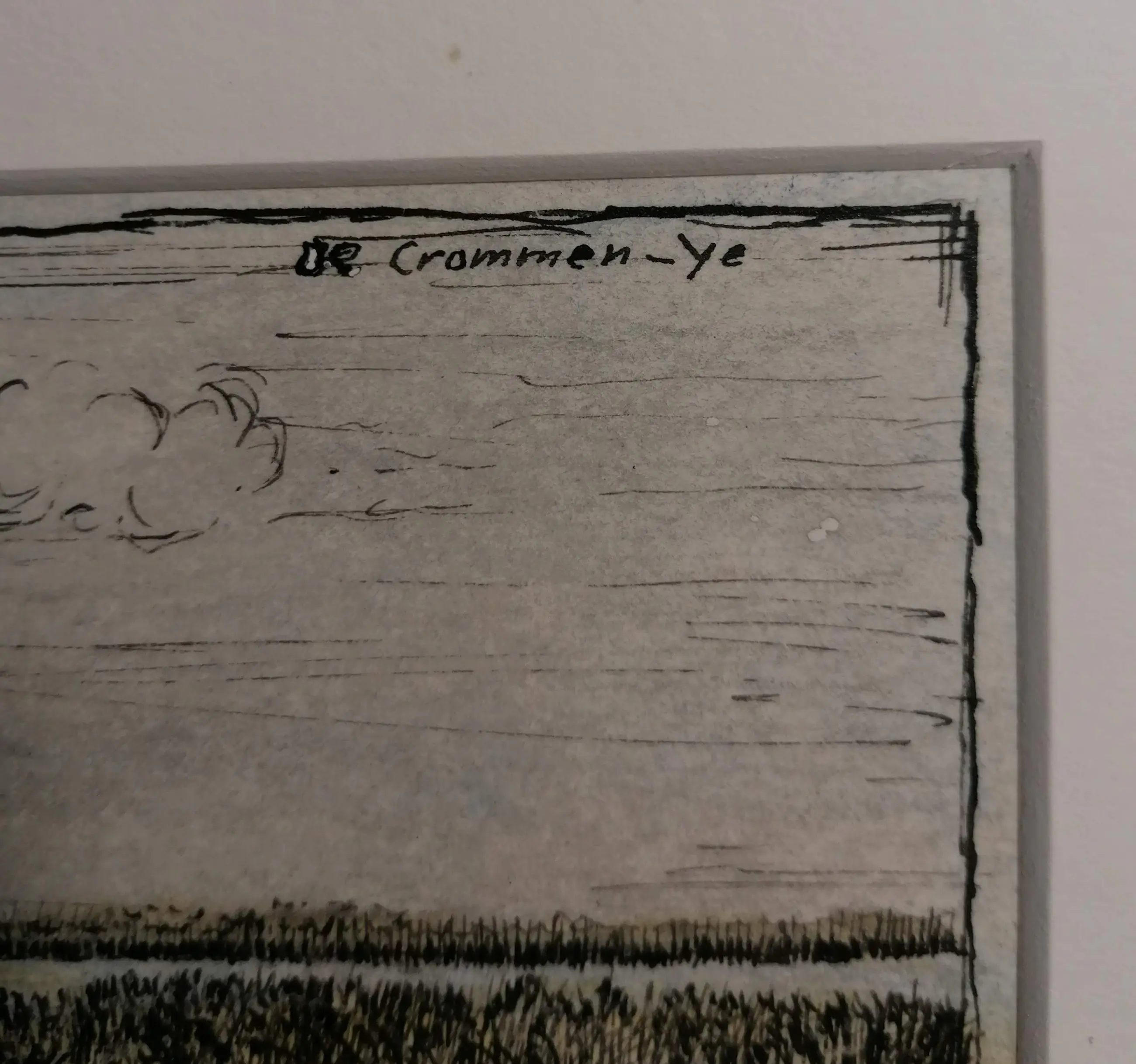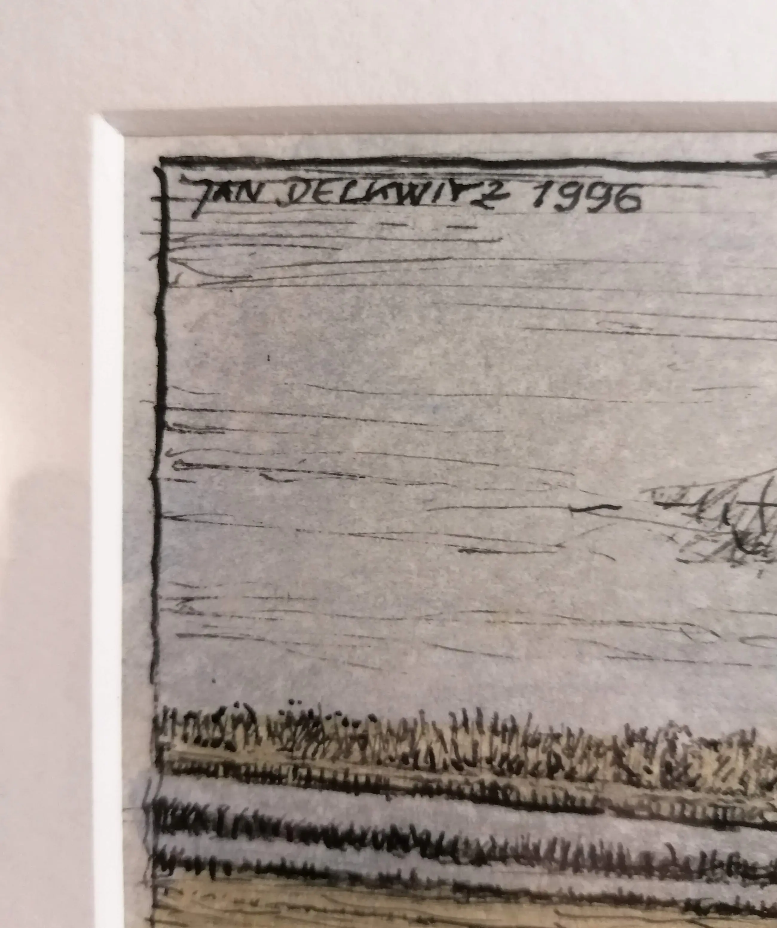 gemengde techniek : pen , O.I. inkt , penseel, waterverf. zeer licht : toevoeging van kleur. het grafische element van het landschap overheerst. verrassend en spannend ingelijst. Rond Krommenie.