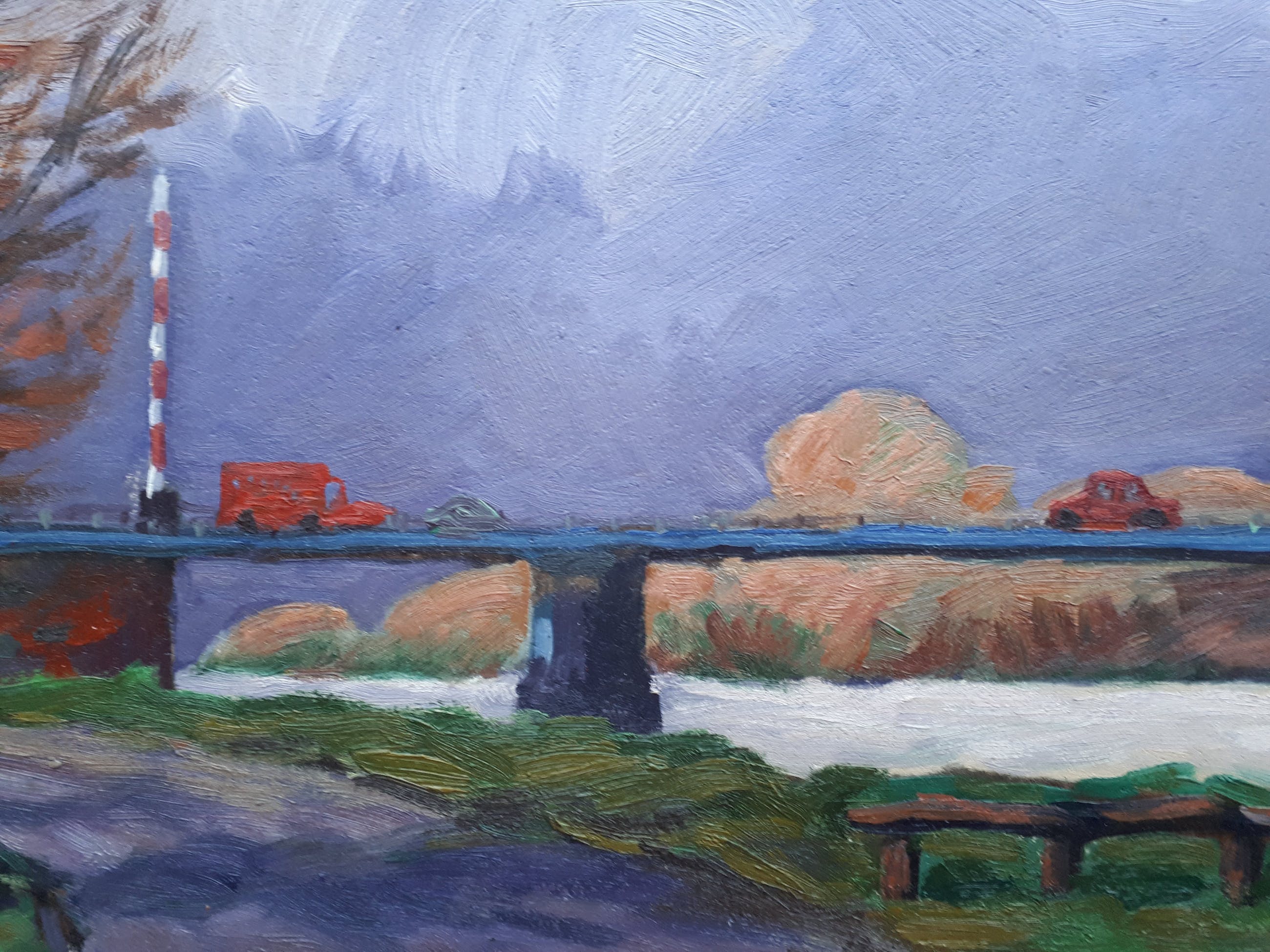 Het werk is in zeer goede staat. Schoongemaakt en de lijst is wit geschilderd. In de lucht zitten wat kleine donkere plekjes. Het is mijn indruk dat dit de bedoeling is geweest van de kunstenaar / geen schade of vochtplekken.