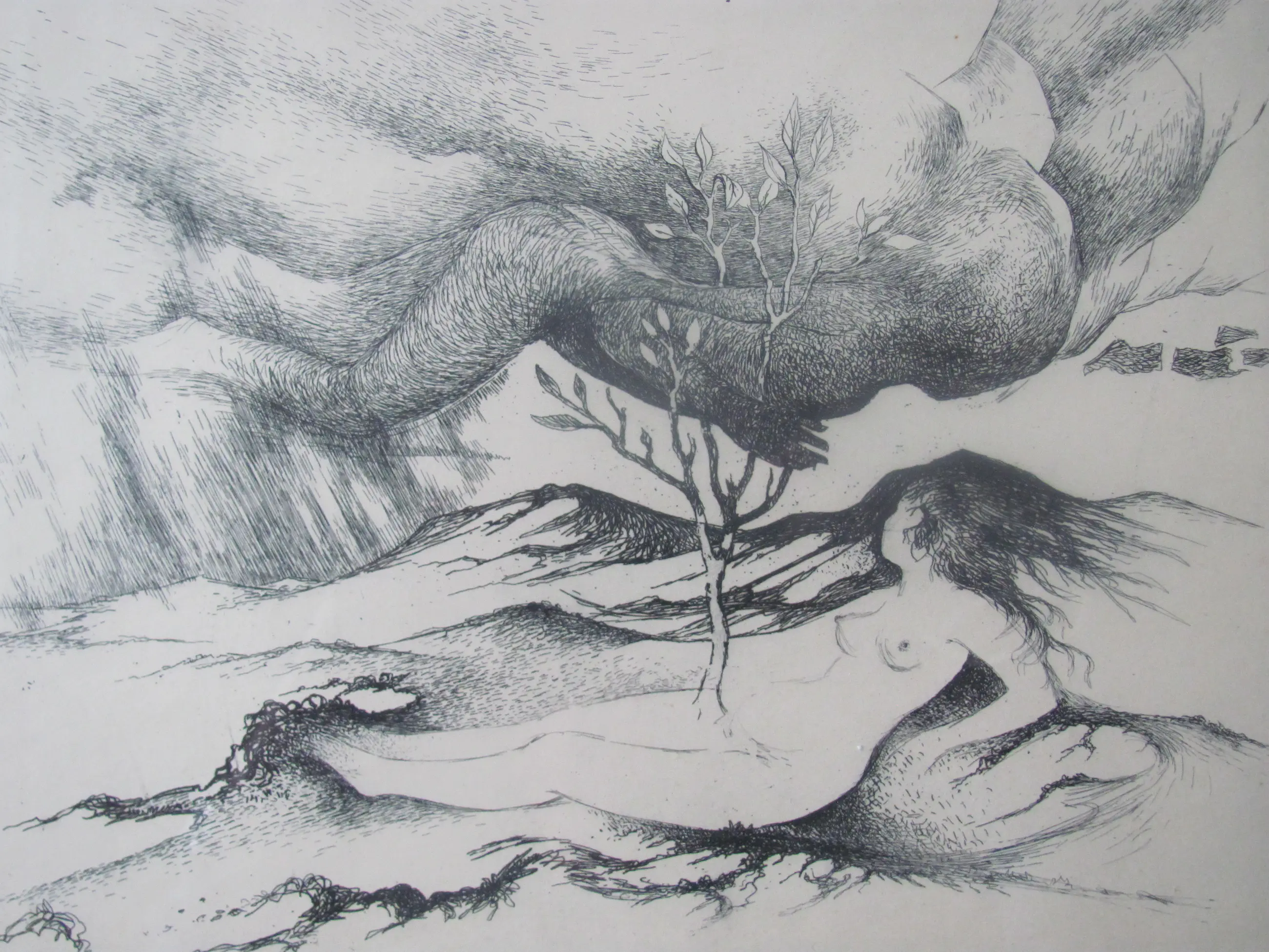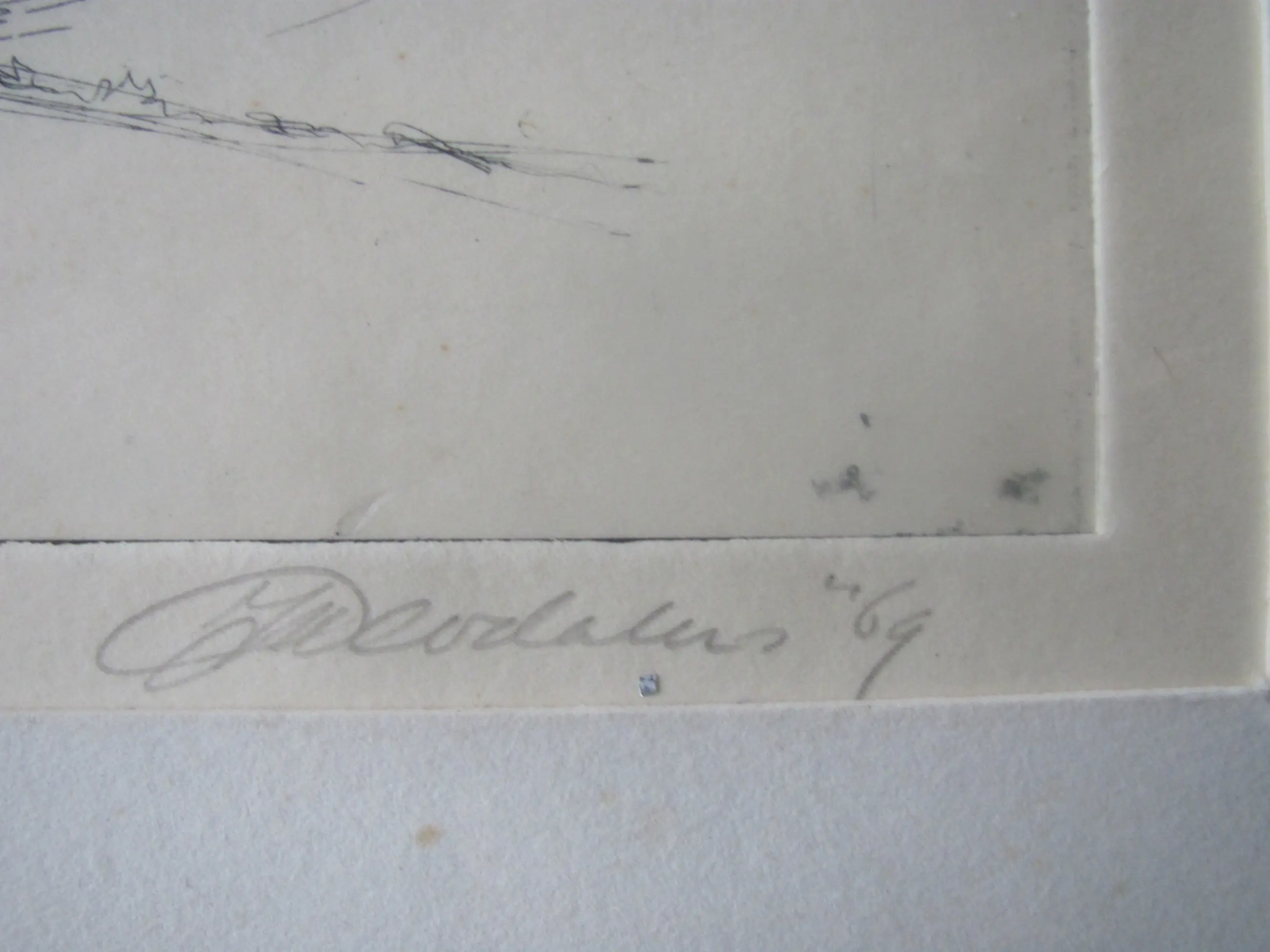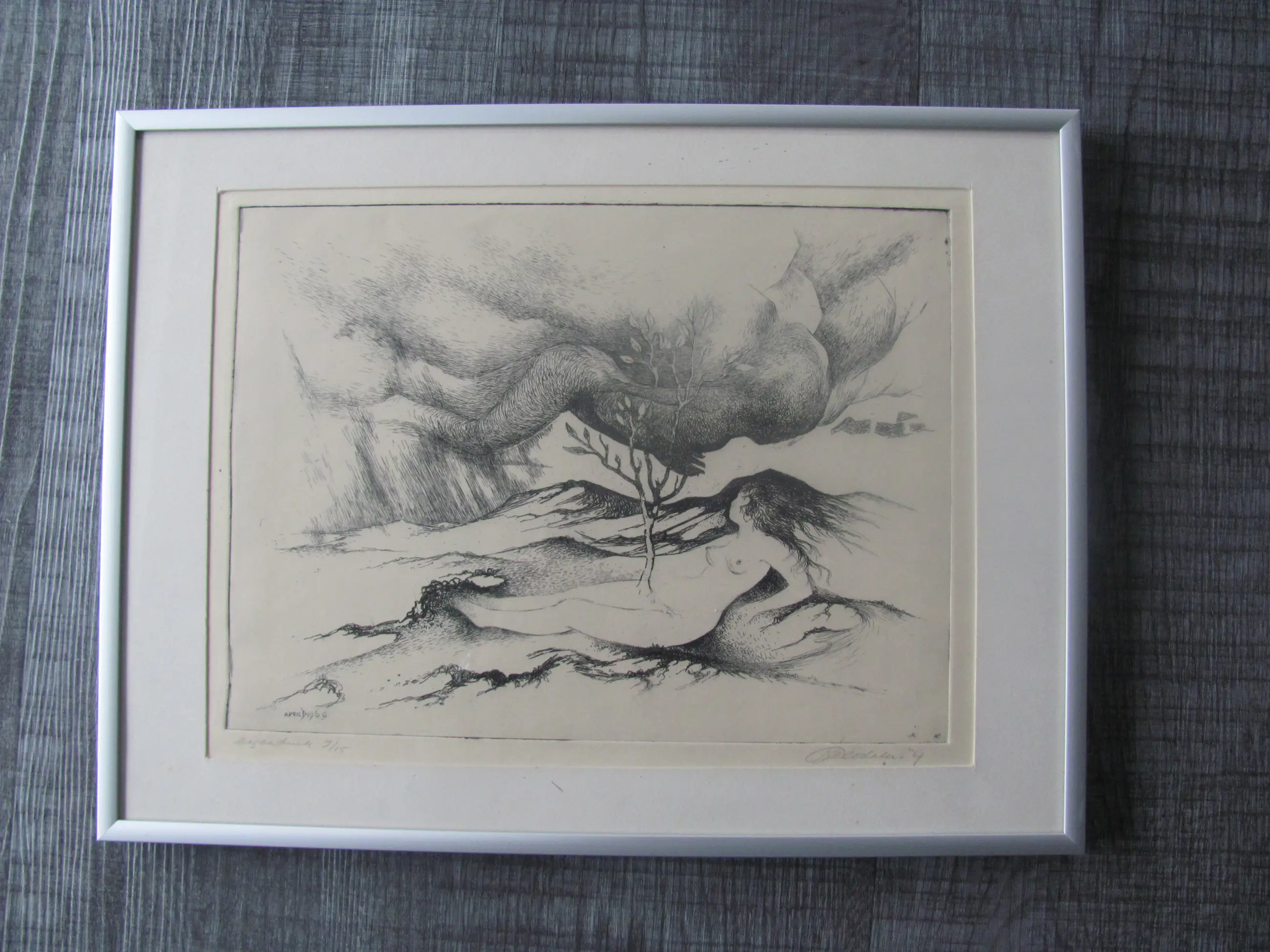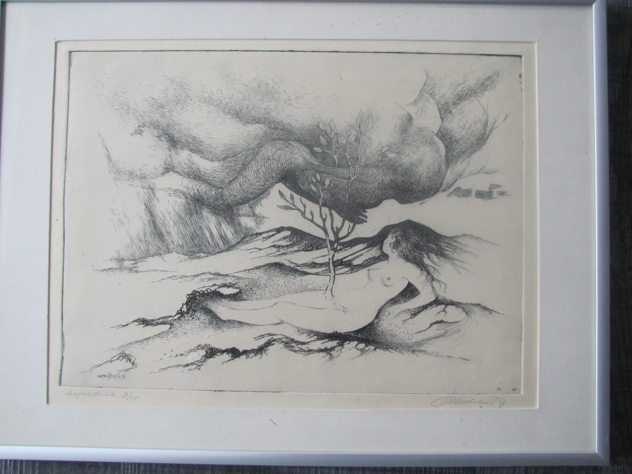 Ets van Jan Deodates. Linksonder in potlood: eigen druk, 9/15 Rechtsonder in potlood: Jan Deodates, '69. In de plaat gedateerd: april 1969.