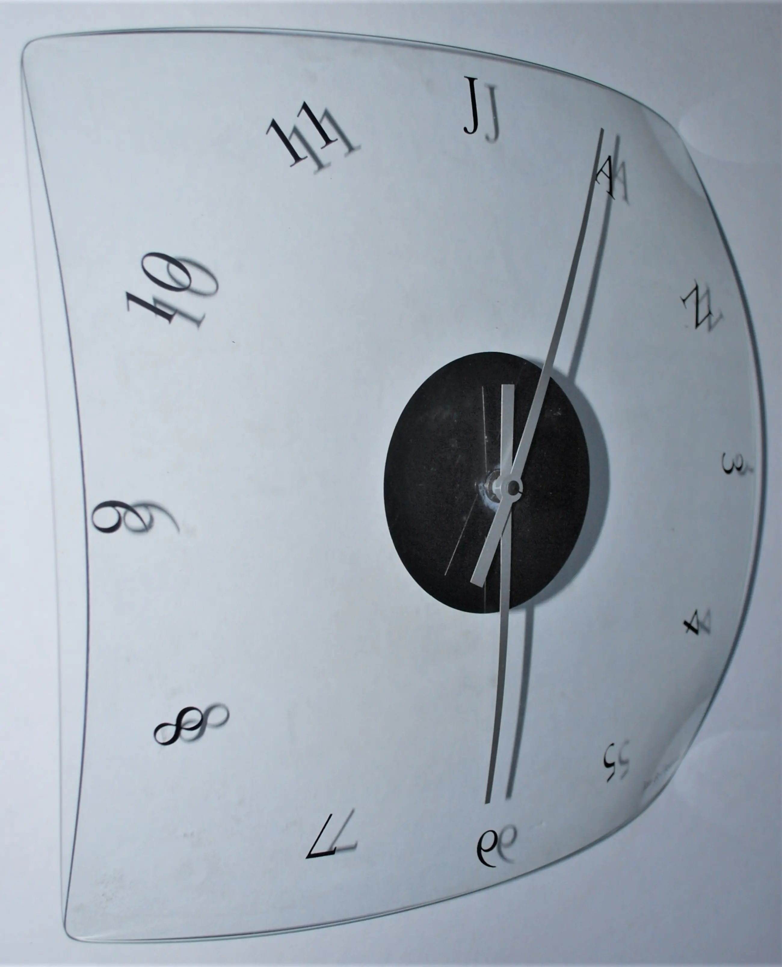 Glazen klok van gebogen glas, 3 mm dik en met een maximale buiging van liefst 4 cm.