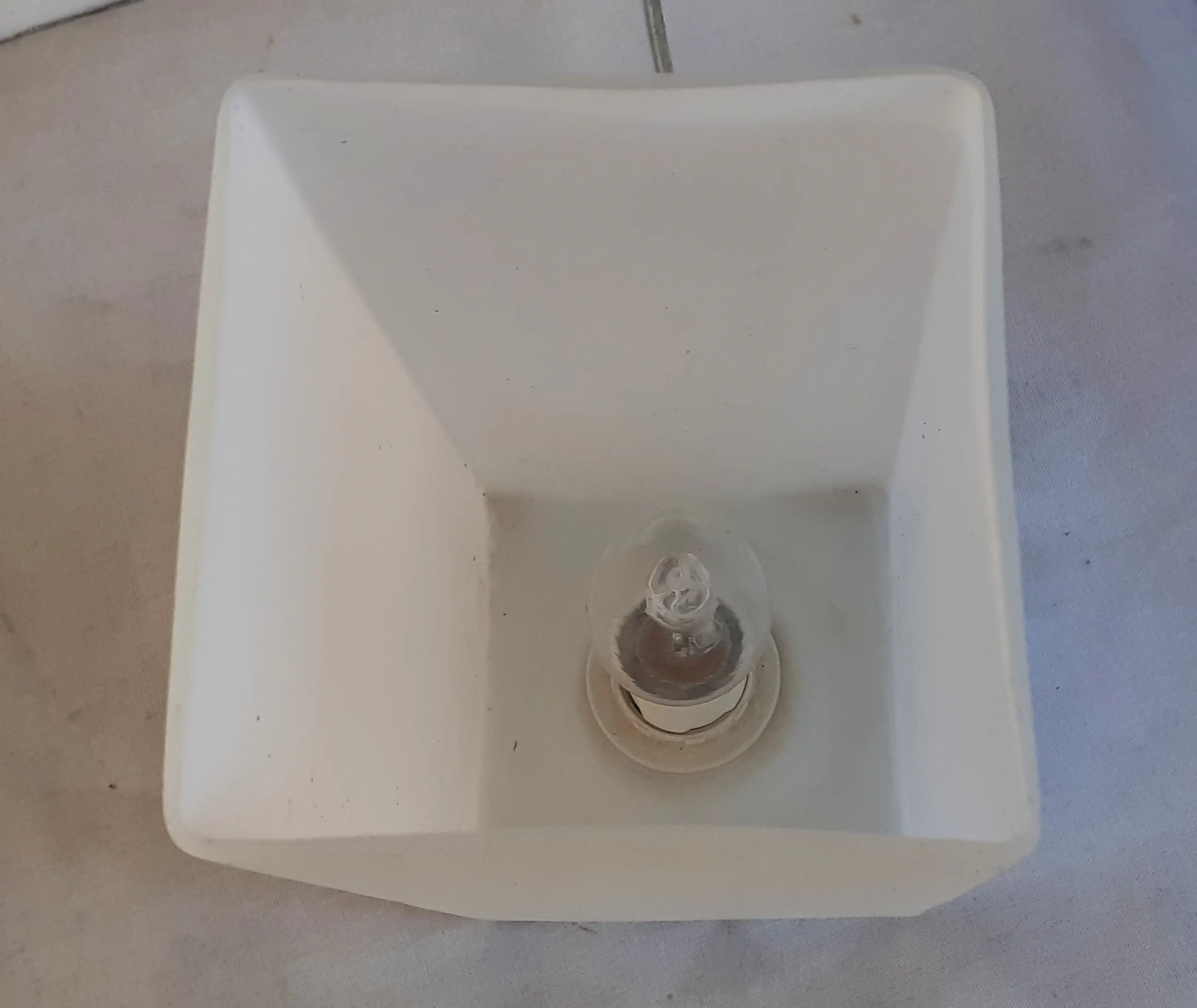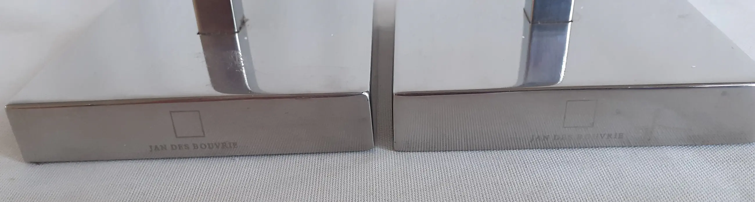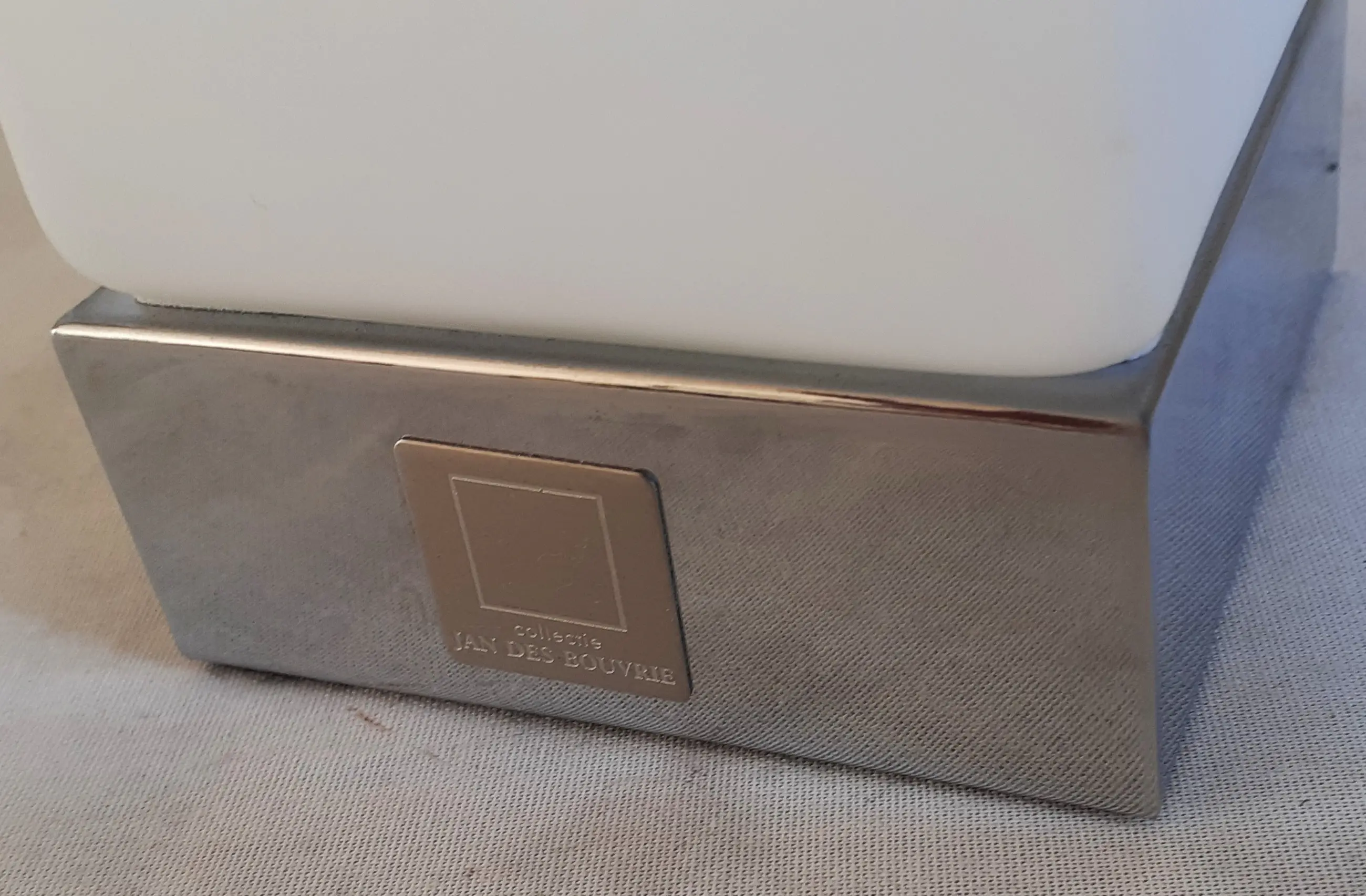 Details Model/naam: Touch Cubic Lamp en Cubic kandelaars Ontwerper: Jan des Bouvrie Periode: Eind 20e eeuw Lamphoogte: 25,2 cm Vierkante "kap": 10 x 10 cm Bediening: Touch bediening (drie lichtstanden en uit). Snoerlengte: 150 cm . Lichtbron/lamp: E14 max 60 watt. Handelaarhoogte: 31 cm (zonder kaars).