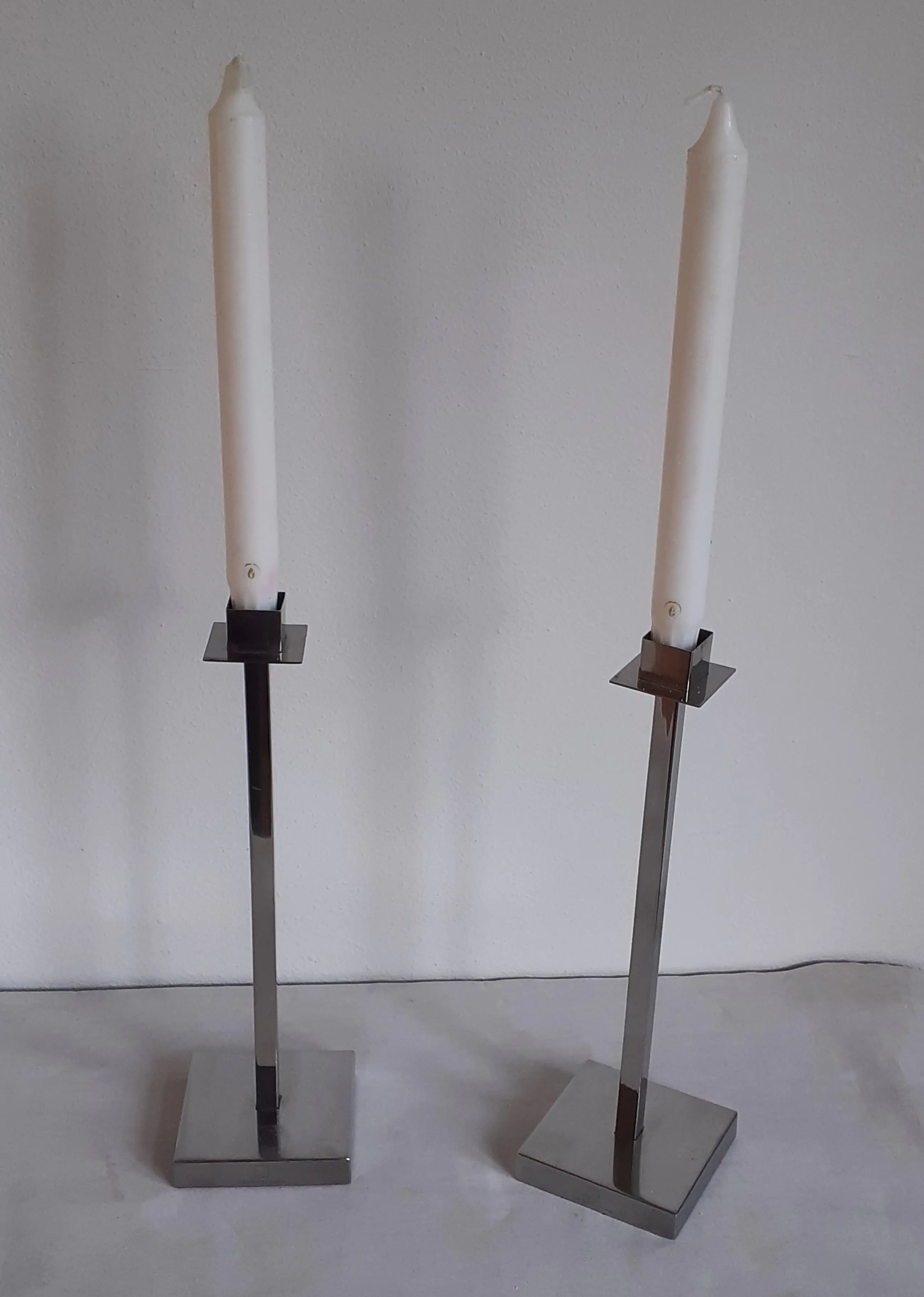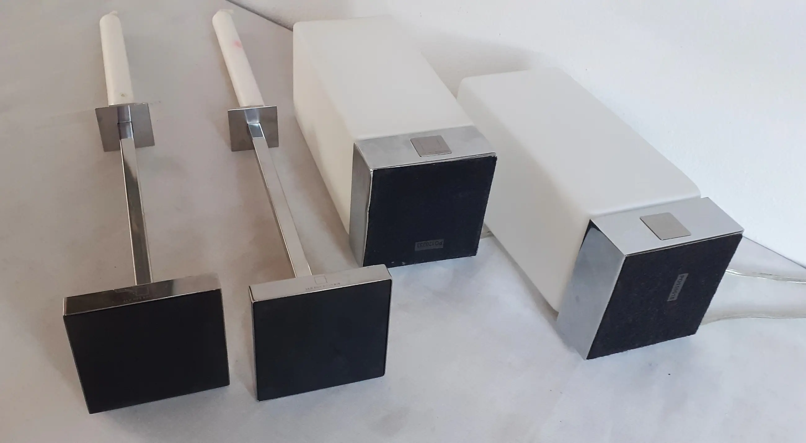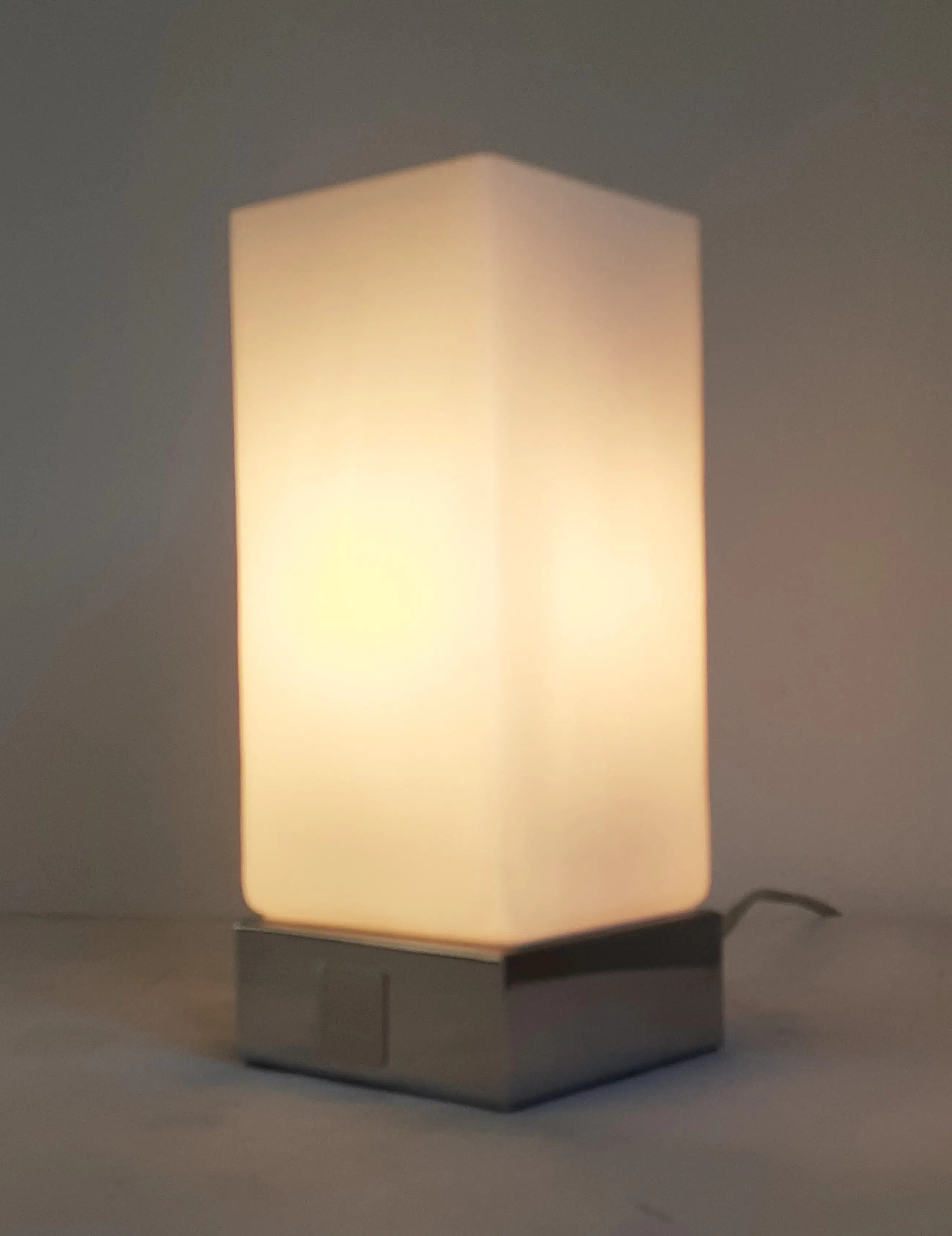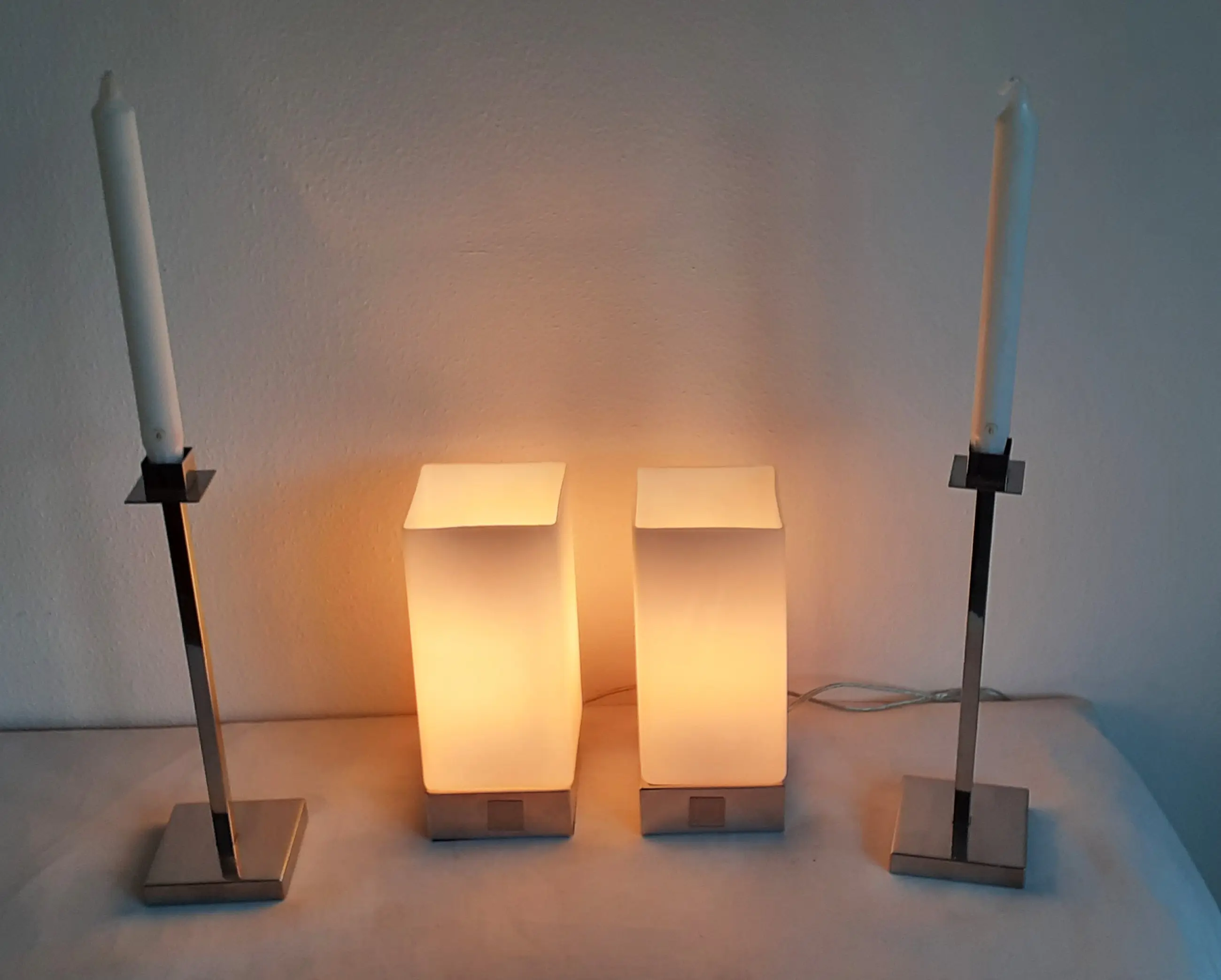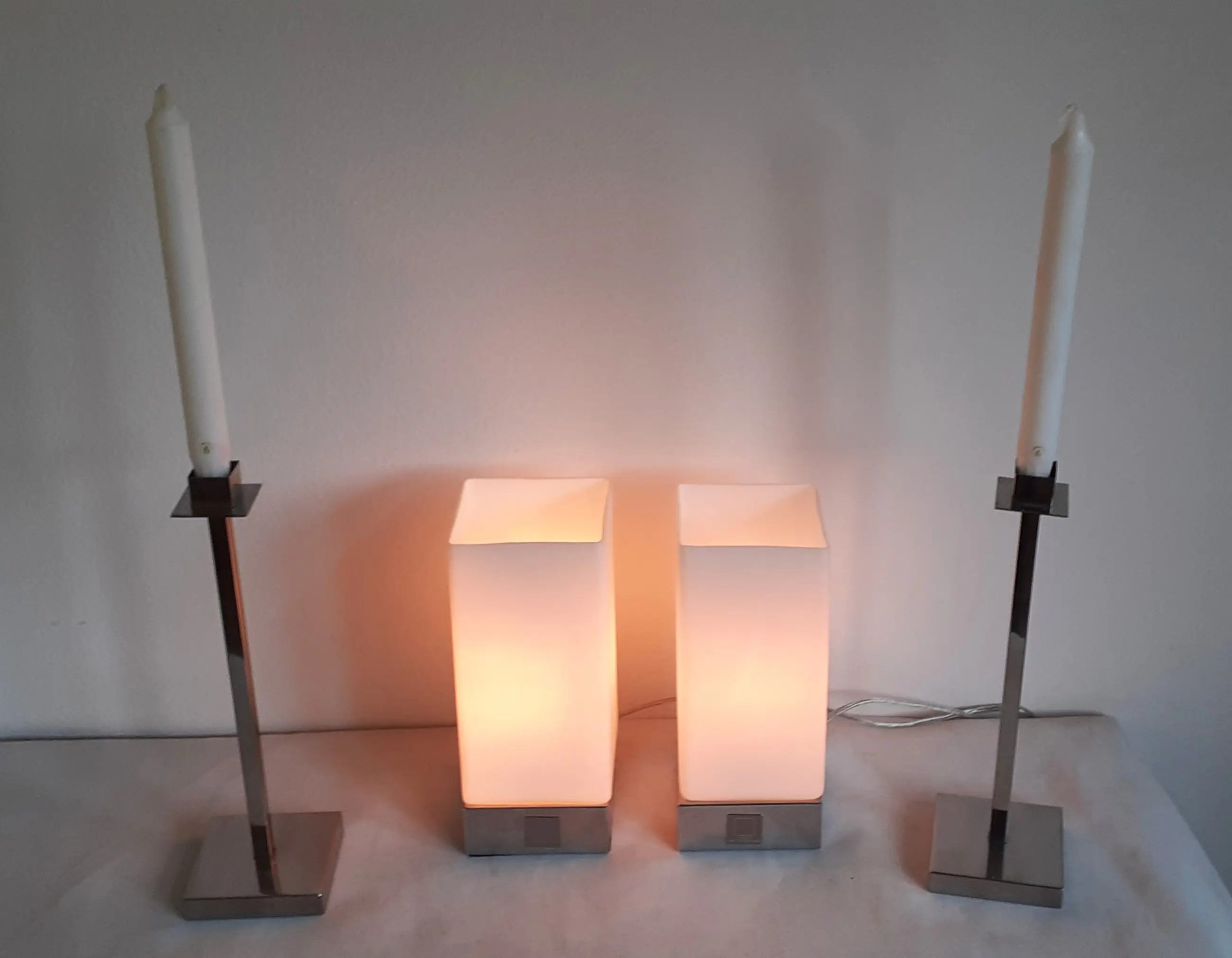 Twee touch Cubic Lampen met melkwitte glazen "kap" en twee bijpassende Cubic kandelaars Deze designset, lampen en kandelaars, zijn ontworpen door de Nederlandse top ontwerper Jan des Bouvrie.