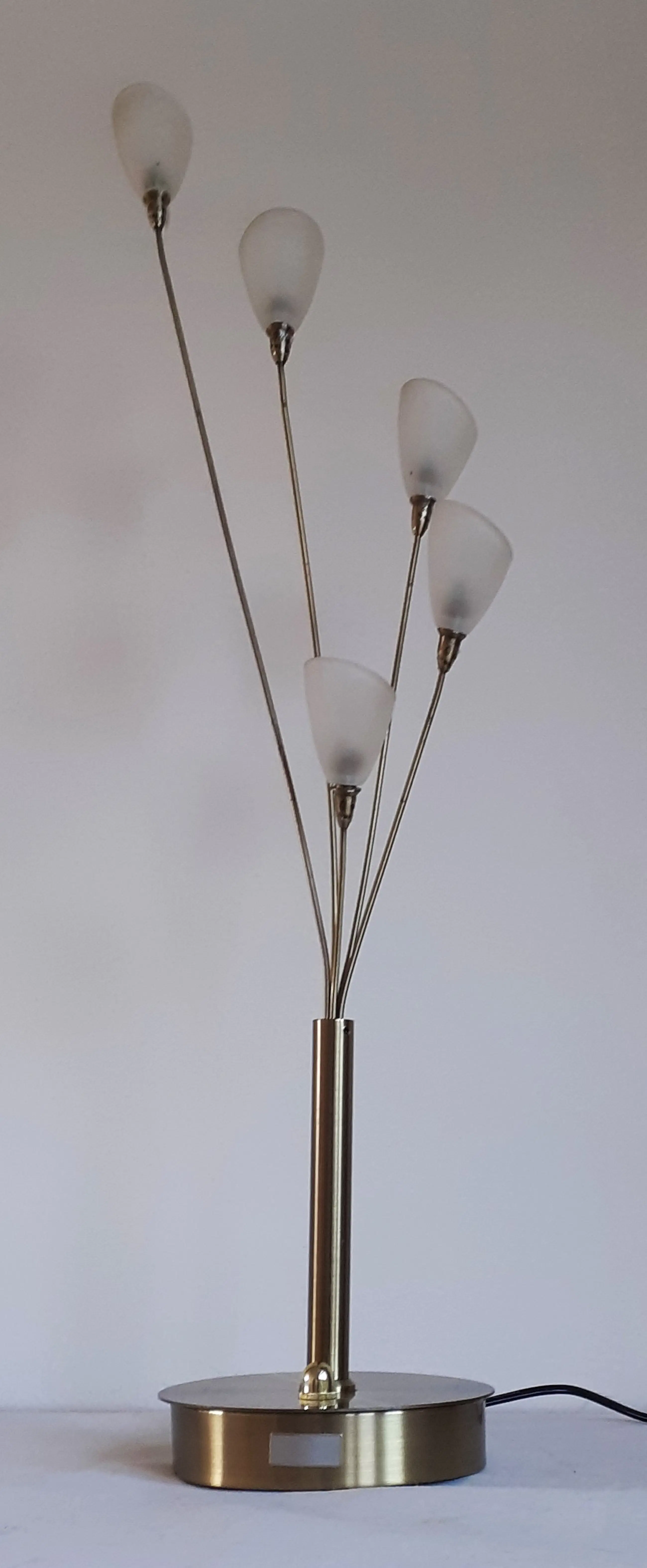 Schitterende lamp, mooi geborsteld metaal in kleur "gold" met melkwitte glazen kelkjes.