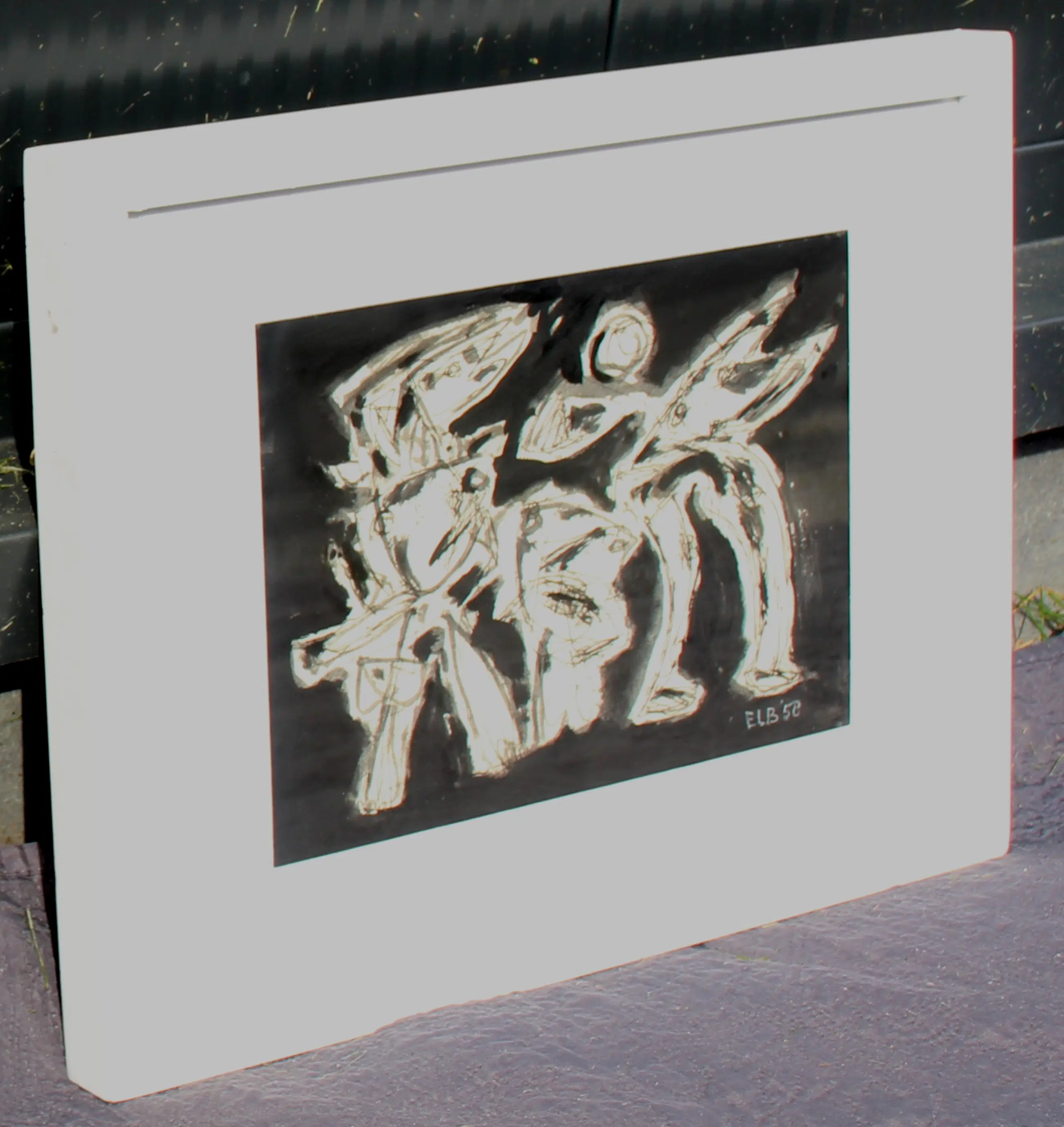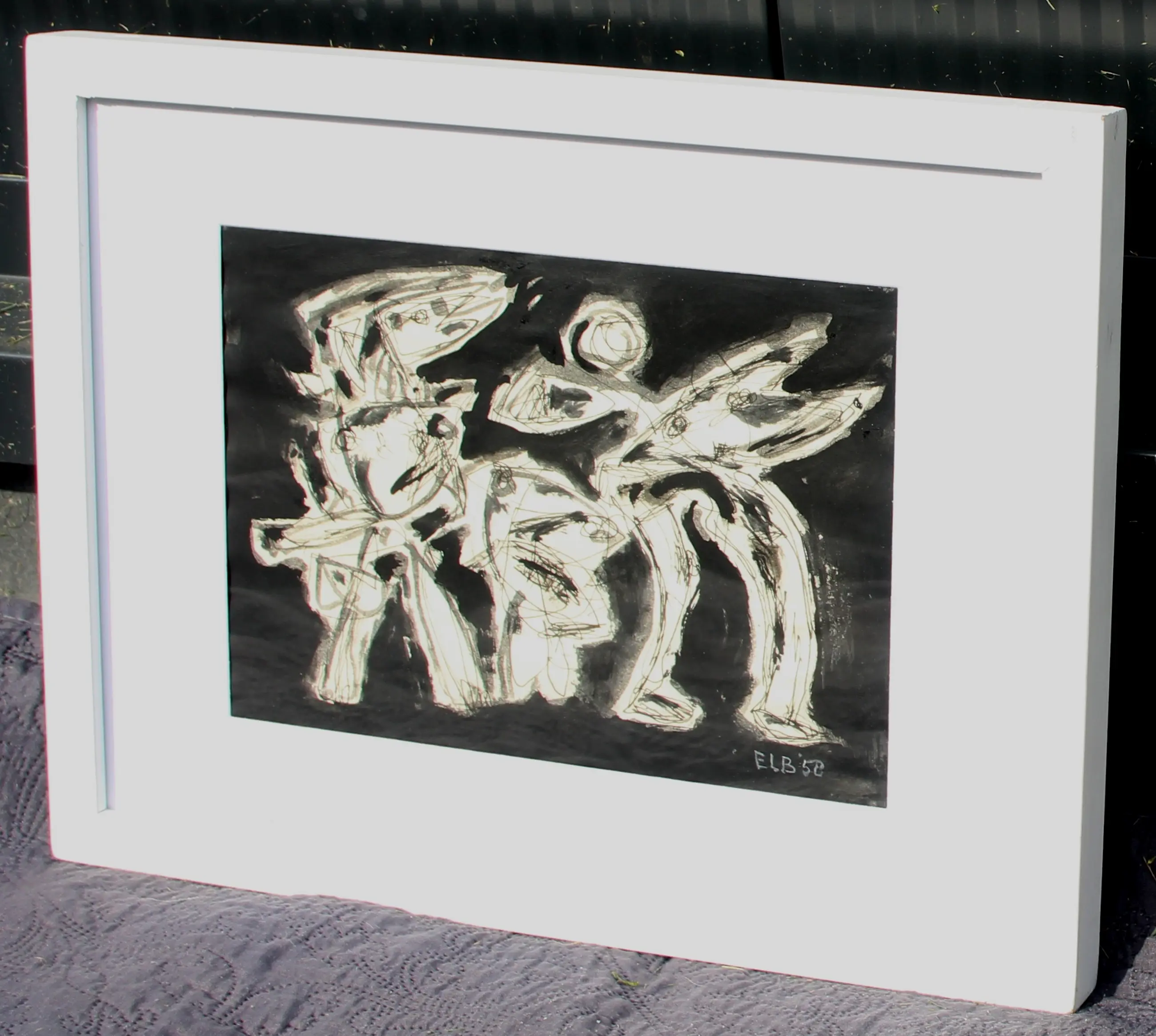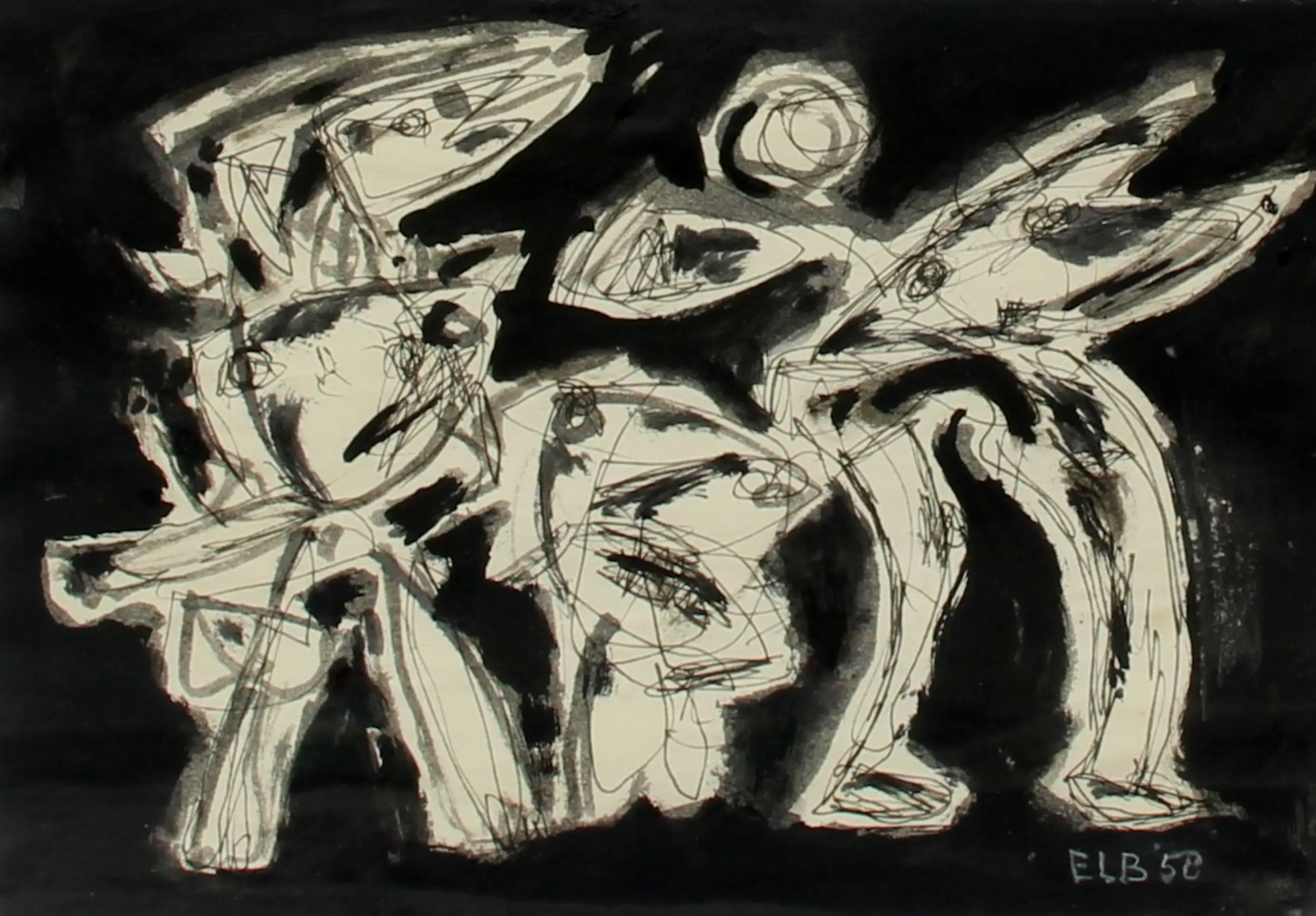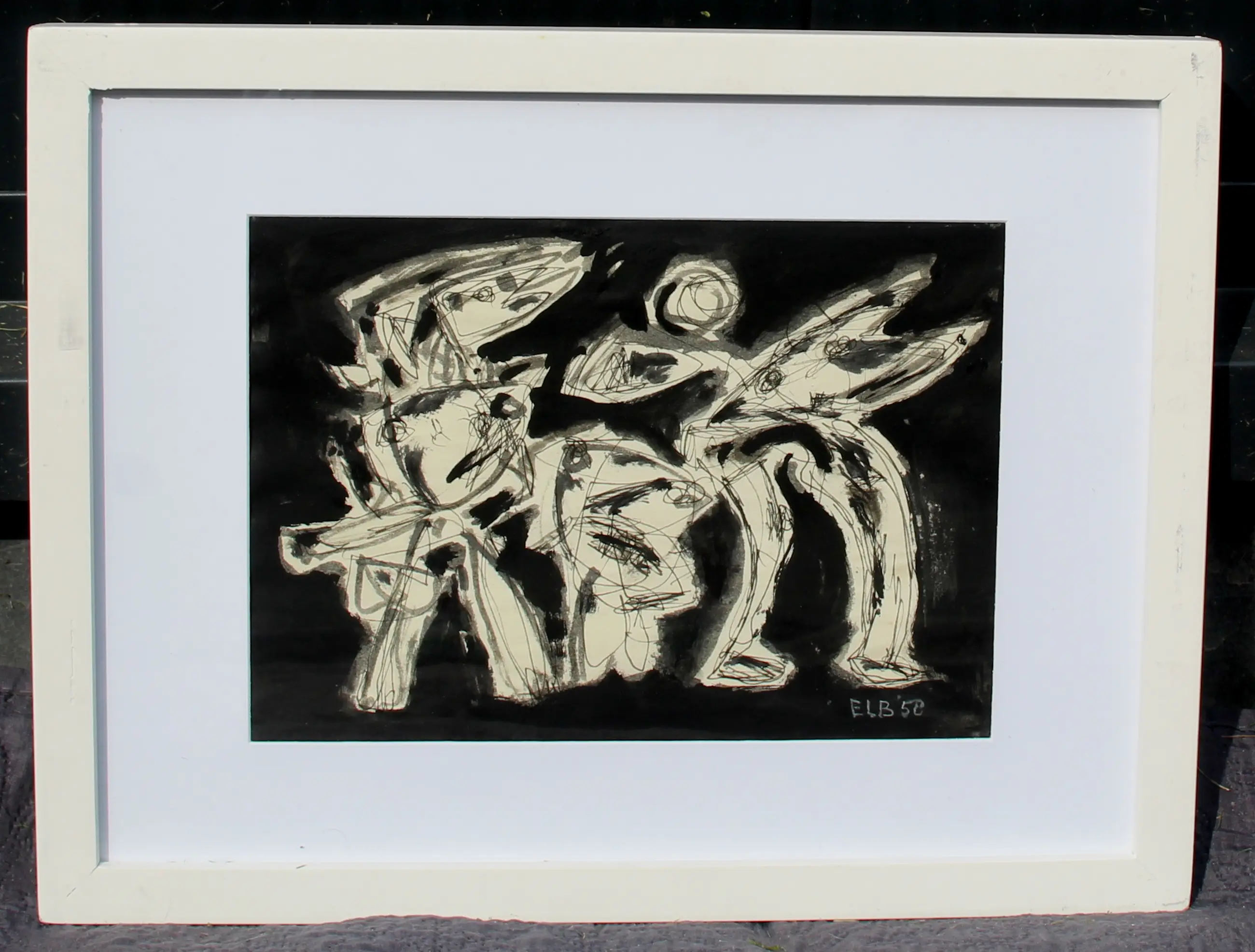 Ingelijste inkttekening op papier, van Jan Elburg. 'Figurengroep'. Het werk is rechtsonder gesigneerd en gedateerd '58, door de kunstenaar. De authenticiteit van het aangeboden werk wordt volledig gegarandeerd. Een certificaat van echtheid kan, op aanvraag, worden gemaild.