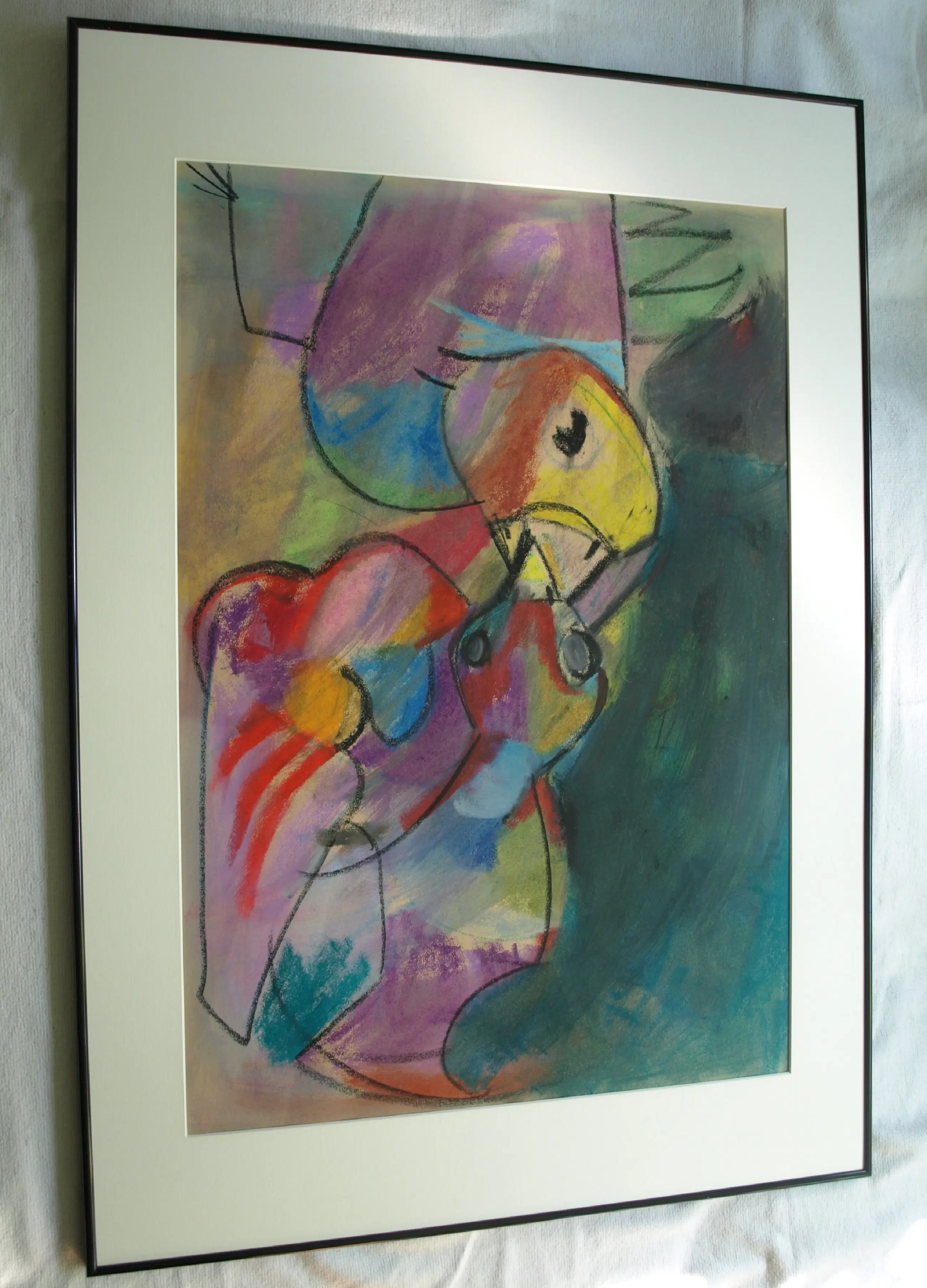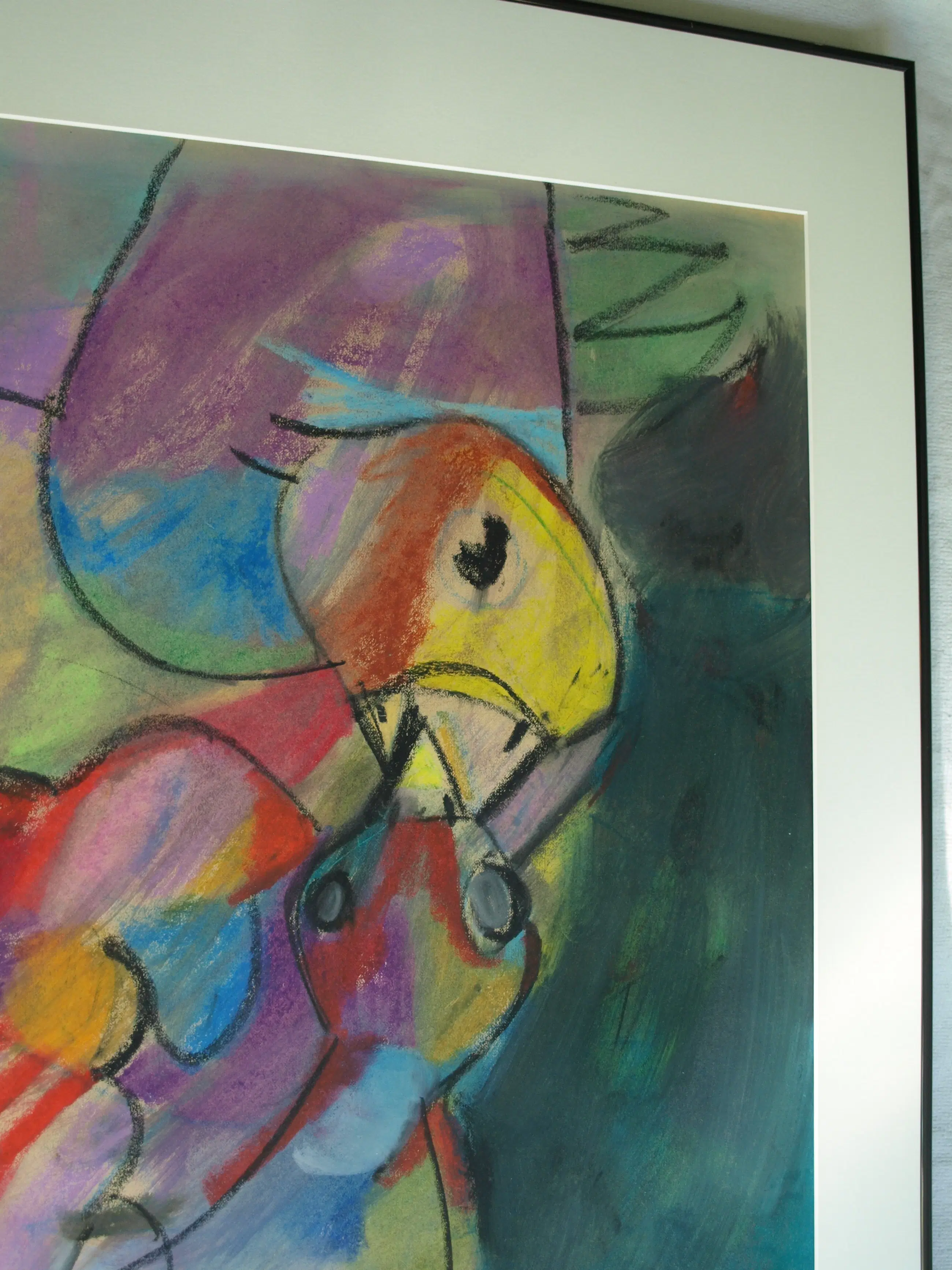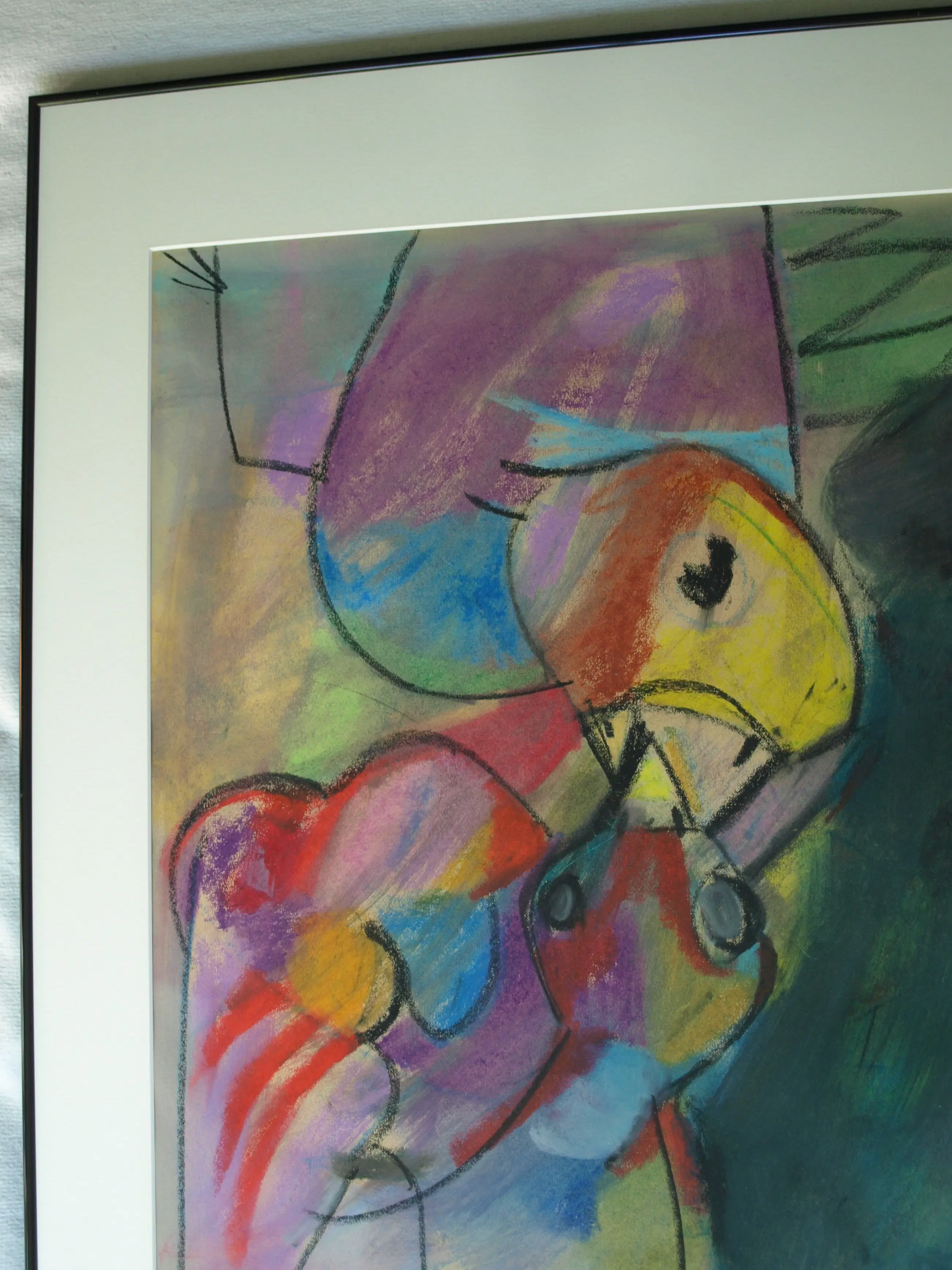 Een groot werk van de Nederlandse beeldhouwer en schilder Jan Engelchor (1920-1976), met een min of meer abstracte voorstelling van een moeder (of vader-)vogel die een jonge vogel voedt. -Gestempeld met de kunstenaarsstempel op de achterkant. -Ingelijst in een zwarte aluminium lijst met passe-partout en glasplaat. -Afmetingen: Lijst, 101 x 71 x 2 cm. Blad, 80 x 55 cm. Beeld, 79 x 54 cm. -Conditie: In zeer goede staat. De lijst heeft slijtplekjes. Zie ook de foto’s voor een eigen indruk. Kan zo aan de muur.