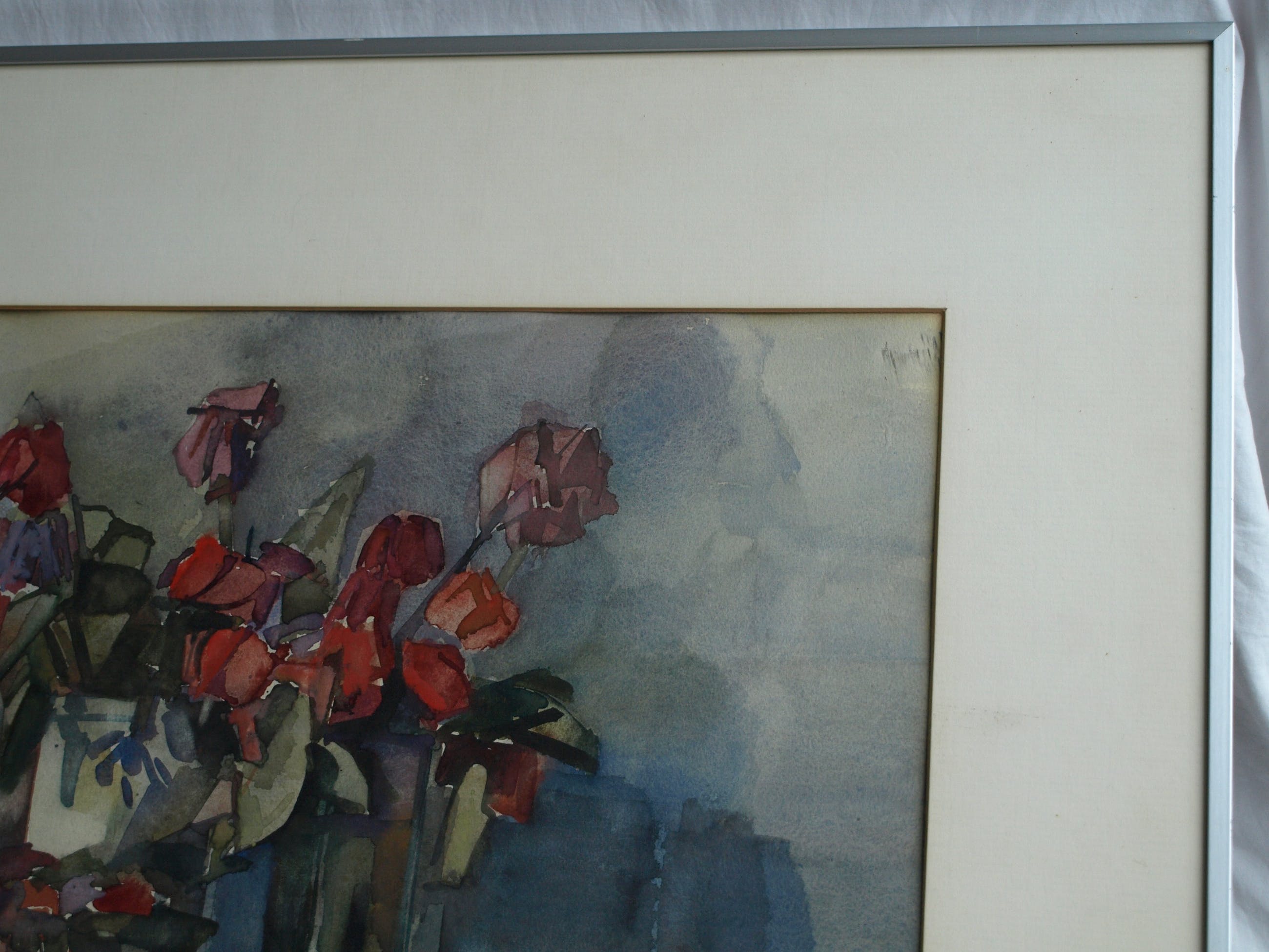 Conditie: De aquarel is in zeer goede staat. Het passe-partout heeft kleine vlekjes. De kartonnen achterplaat heeft vlekjes.