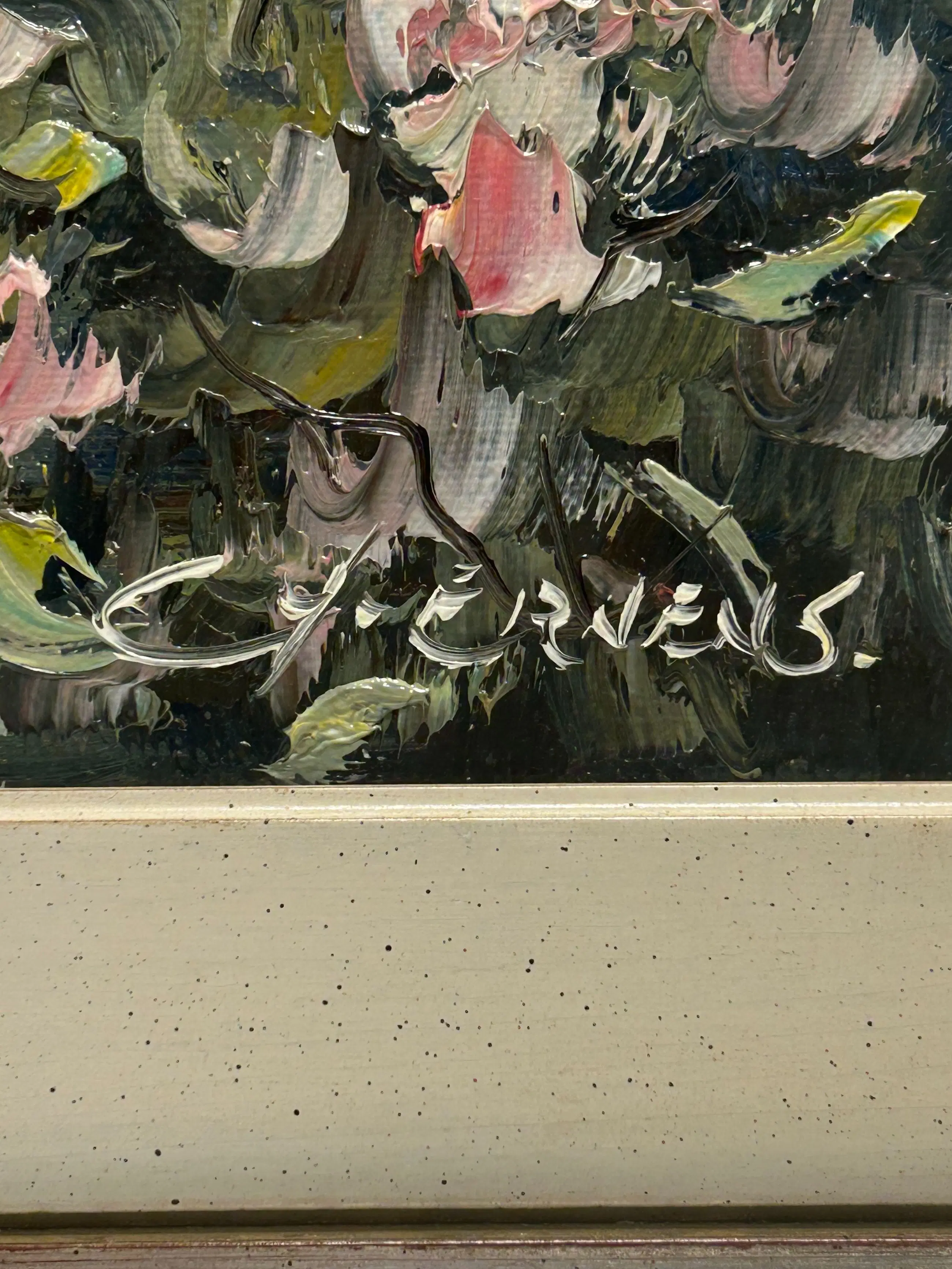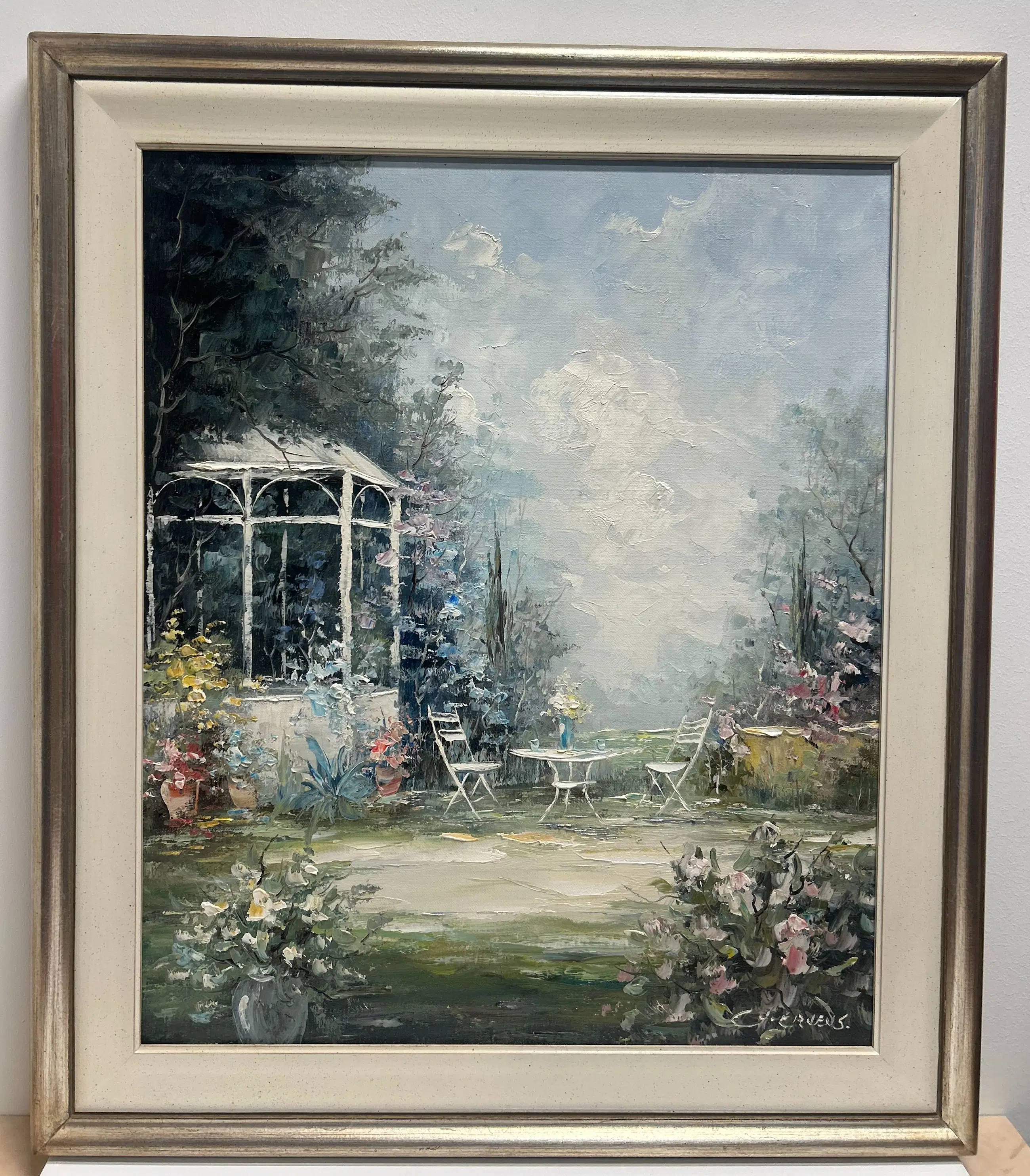 Een fraai schilderij van Jan Ernens, voorstellende een tuin. Het werk is ingelijst in een houten lijst met licht goudkleurige buitenranden. De lijst vertoont lichte gebruikssporen, passend bij de leeftijd. Het schilderij is uitgevoerd in de kenmerkende stijl van Jan Ernens.