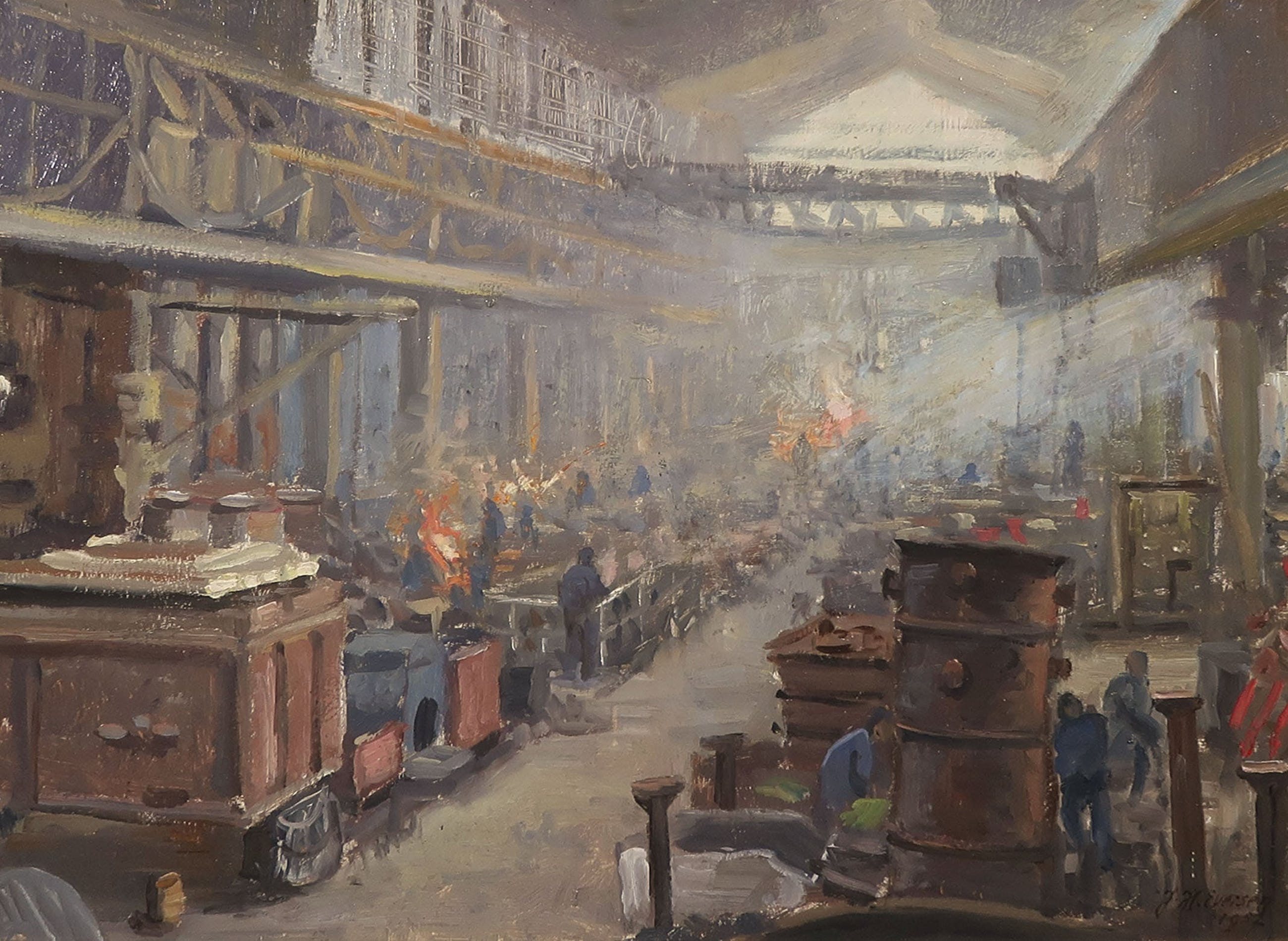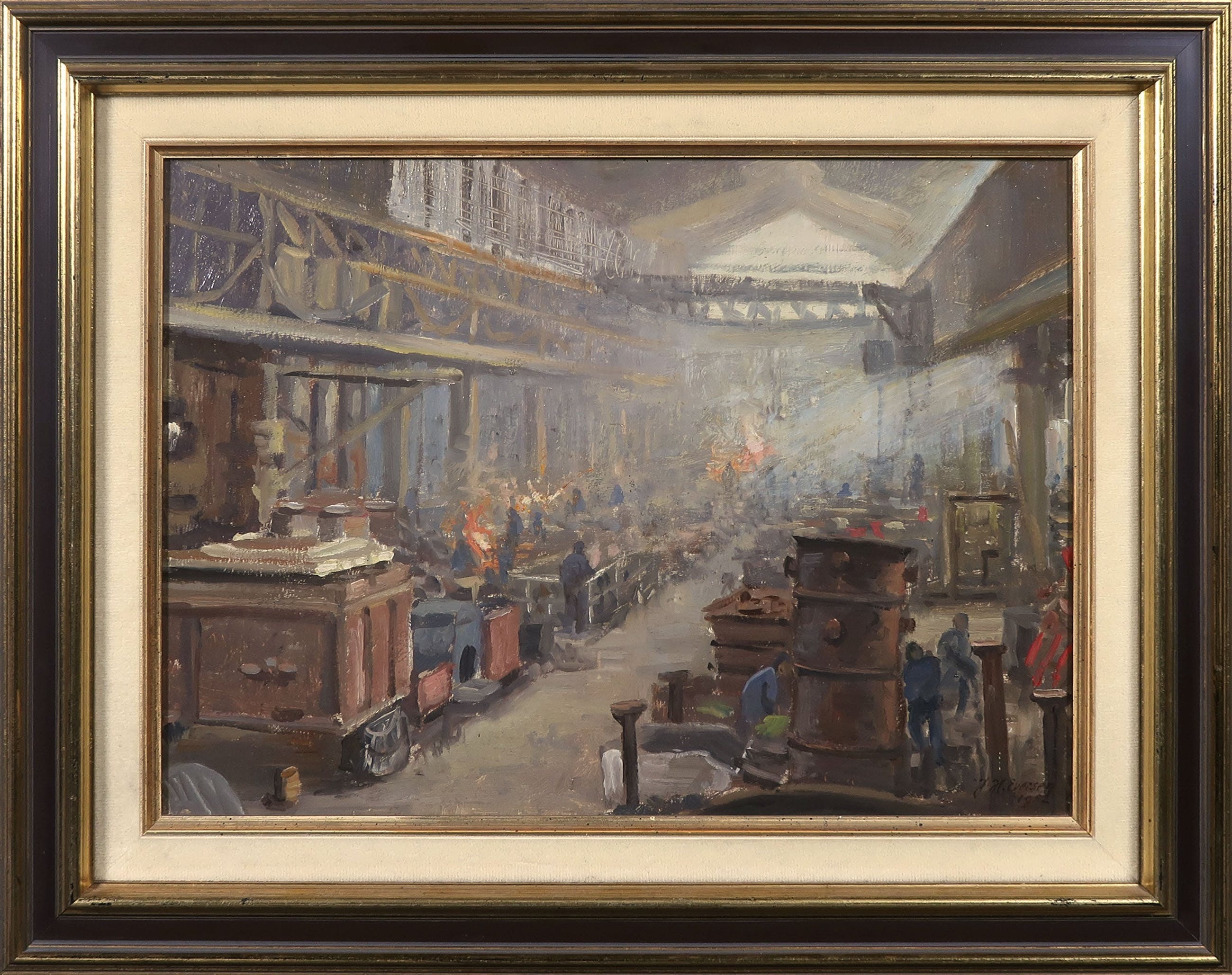 Olieverf op paneel, getiteld ''Studie Gieterij Stork te Hengelo'' door Jan Eversen. Dit werk heeft als studie gediend voor het schilderij olieverf op doek ''Gieterij Stork Hengelo - Ingelijst (Groot)'' welke ook momenteel in de veiling staat. Het werk is gesigneerd aan de voor- en achterzijde.