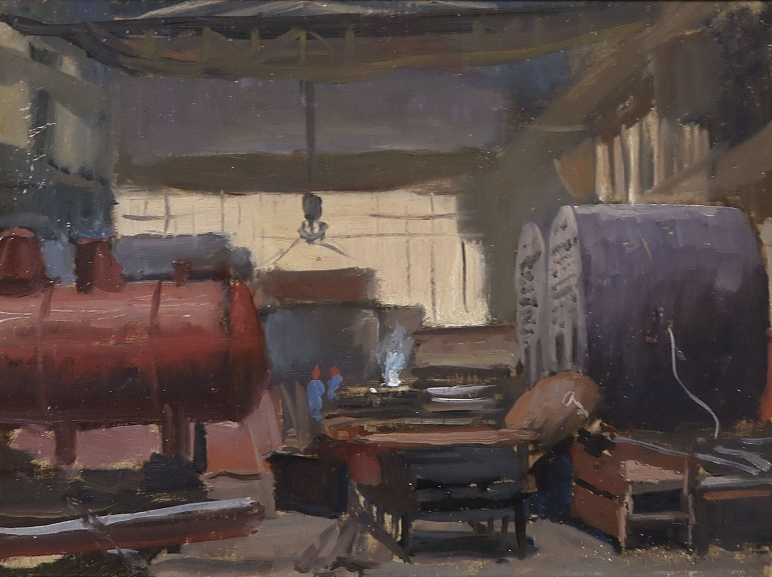 Olieverf op paneel, getiteld ''Studie Gieterij Stork te Hengelo'' door Jan Eversen. Dit werk heeft als studie gediend voor het schilderij olieverf op doek ''Gieterij Stork Hengelo - Ingelijst (Groot)'' welke ook momenteel in de veiling staat. Het werk is gesigneerd aan de achterzijde.
