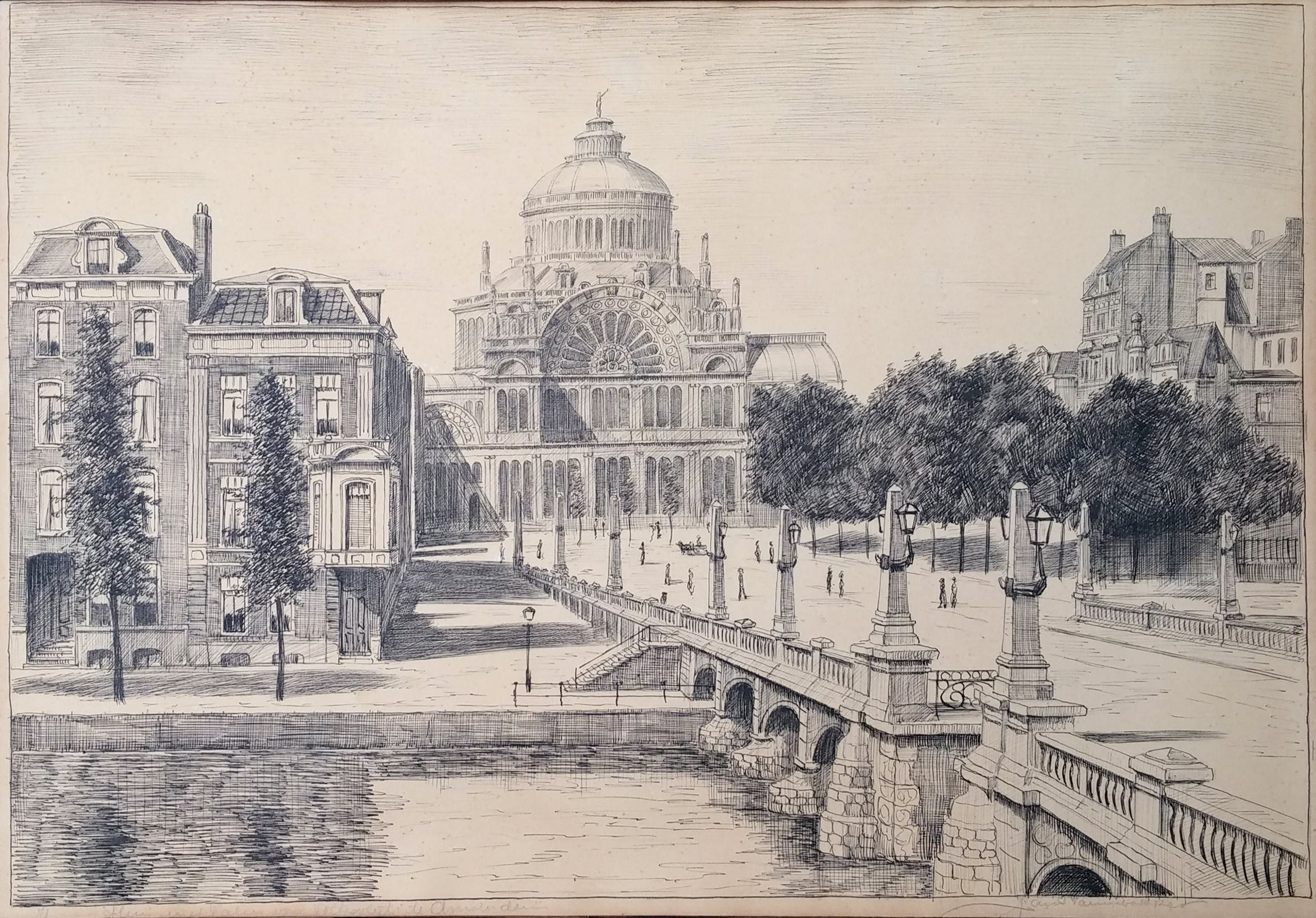 Prachtige tekening van de Hooge Sluis met Paleis voor Volksvlijt te Amsterdam. Het paleis werd ontworpen door architect Cornelis Outshoorn en was geïnspireerd op het Crystal Palace in Londen. Het Paleis voor Volksvlijt werd in de nacht van 17 op 18 april 1929 door brand verwoest. De galerij bleef grotendeels gespaard, maar het paleis zelf is nooit herbouwd.