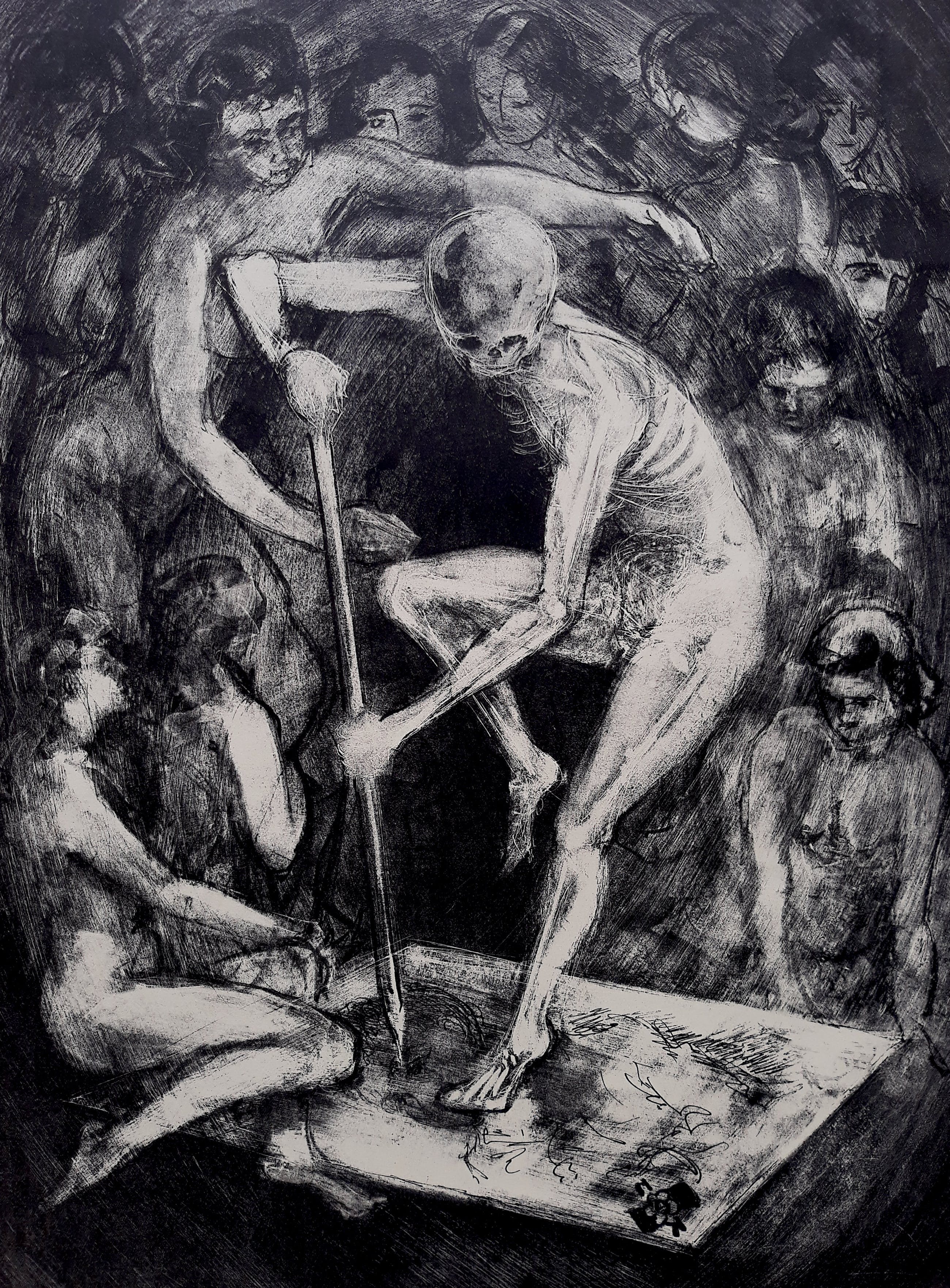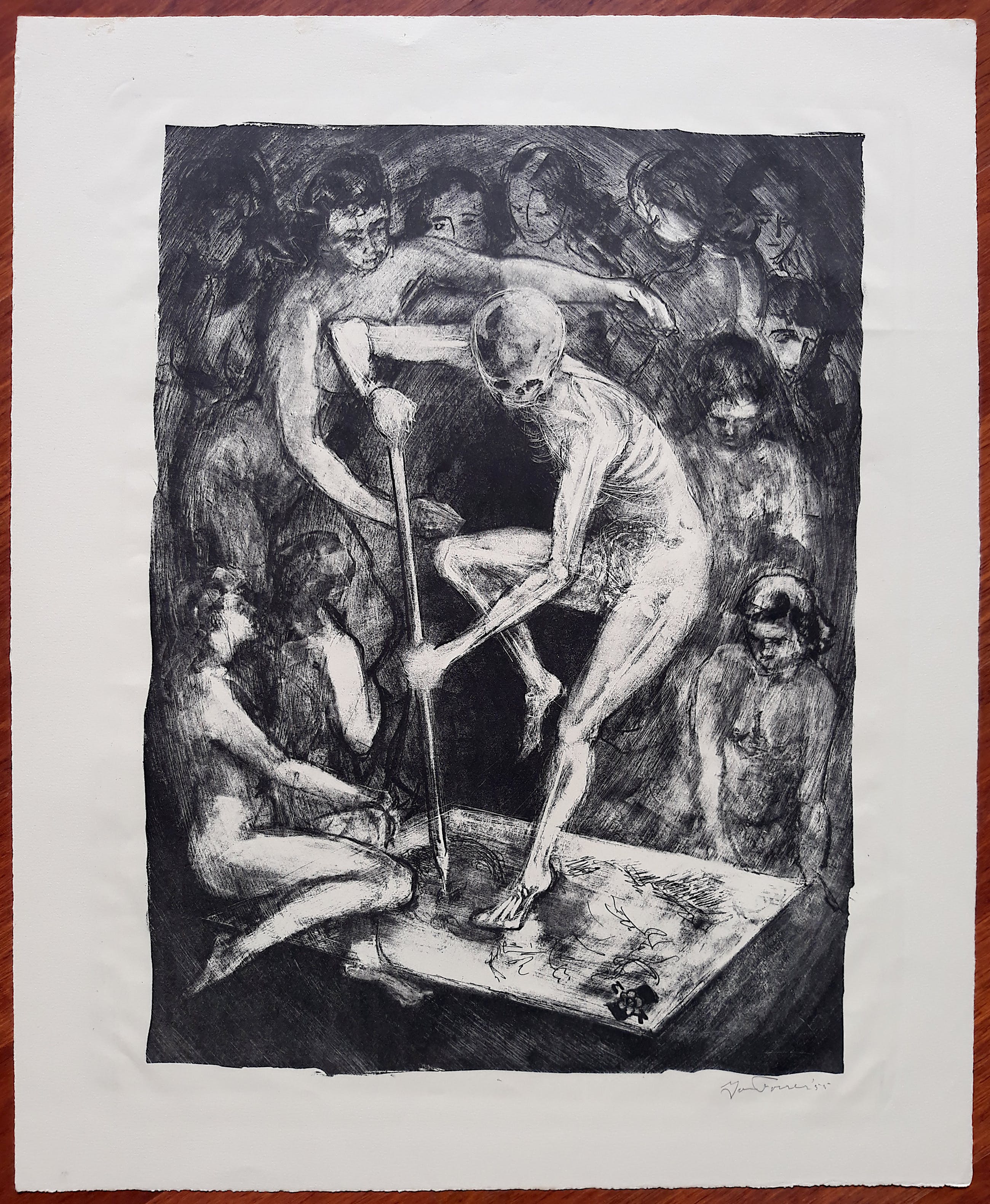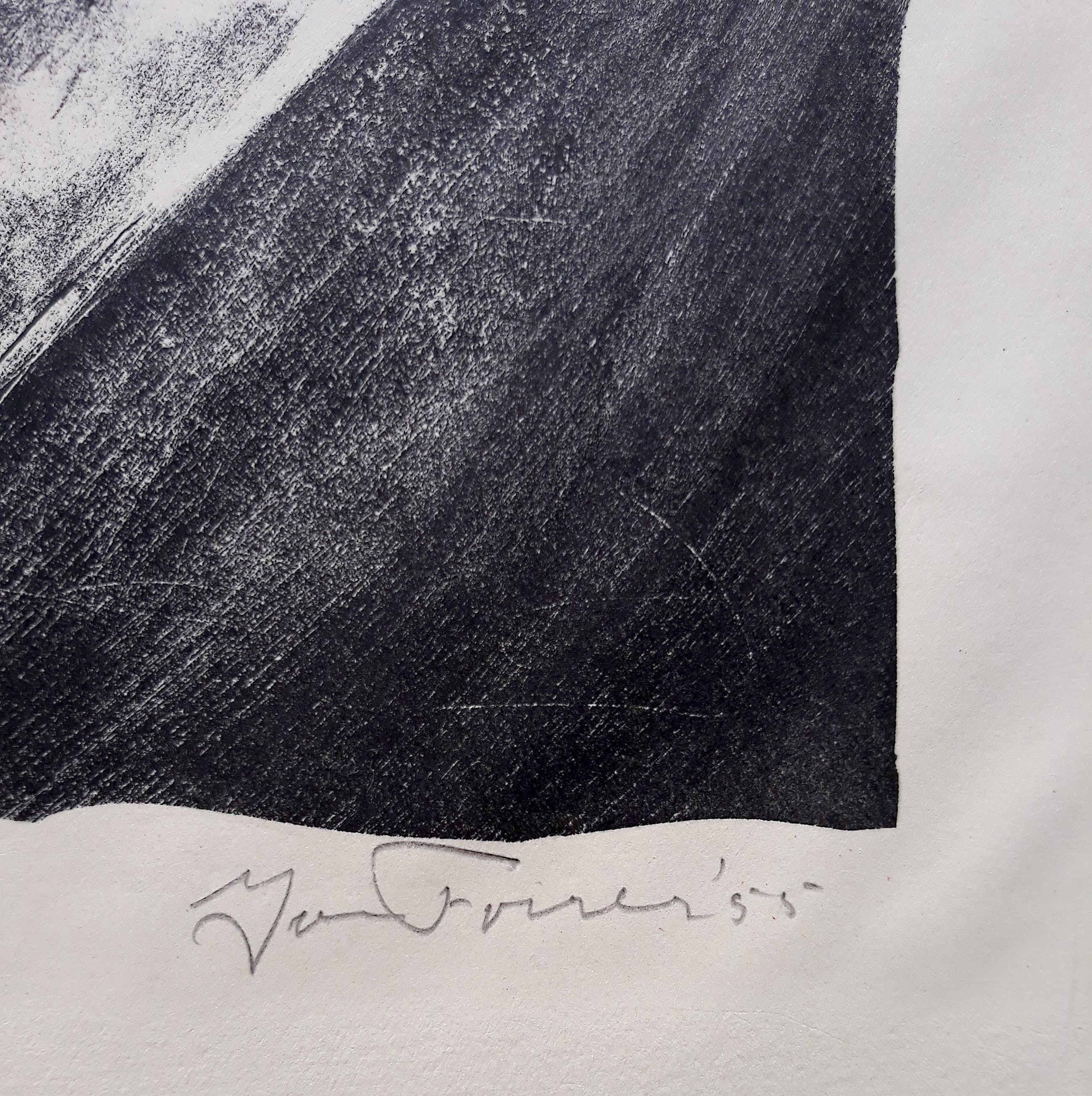 Contemplatieve voorstelling van Jan Forrer. Litho op geschept papier, met potlood gesigneerd en gedateerd (’55). In zeer goede conditie.
