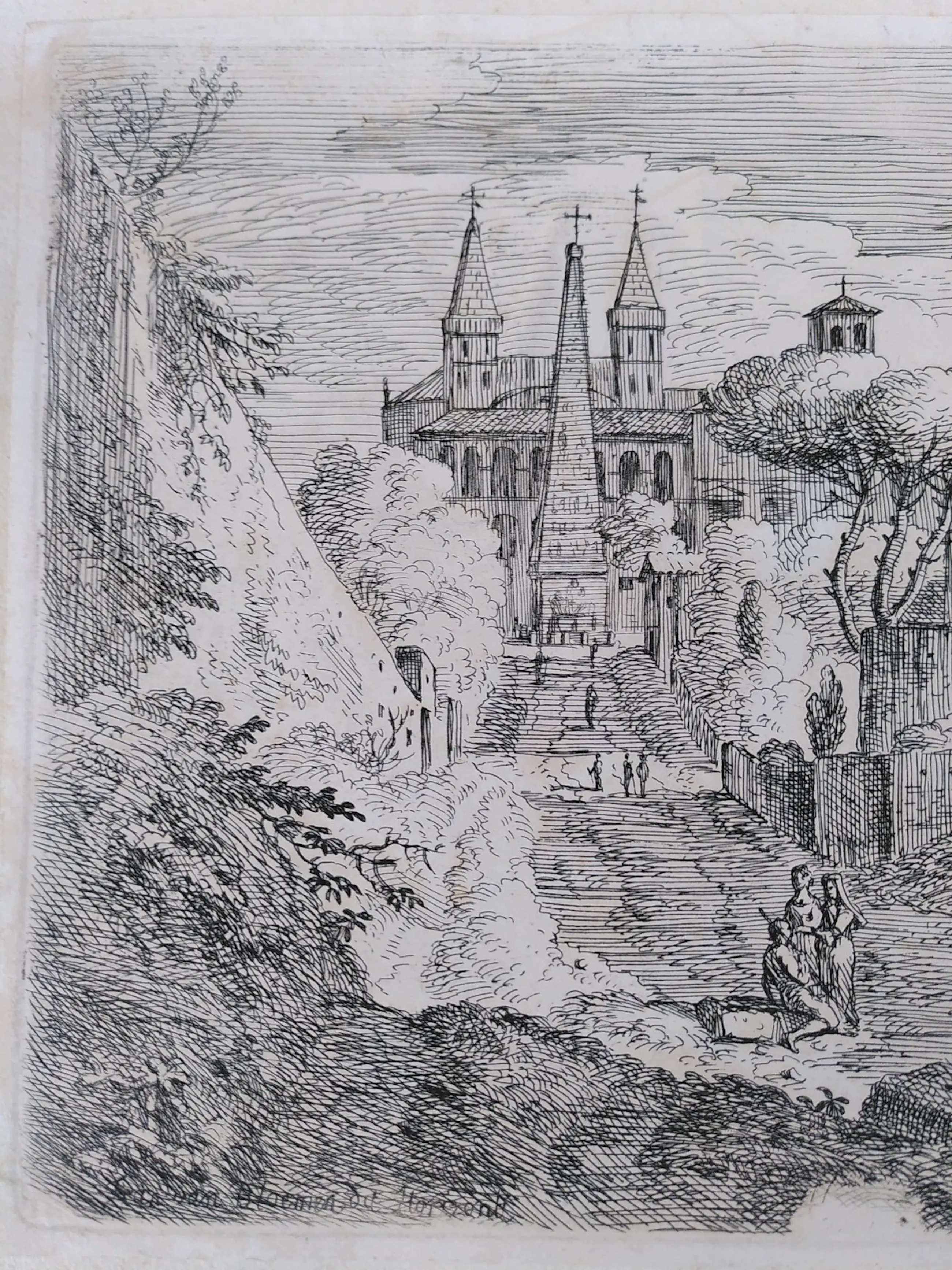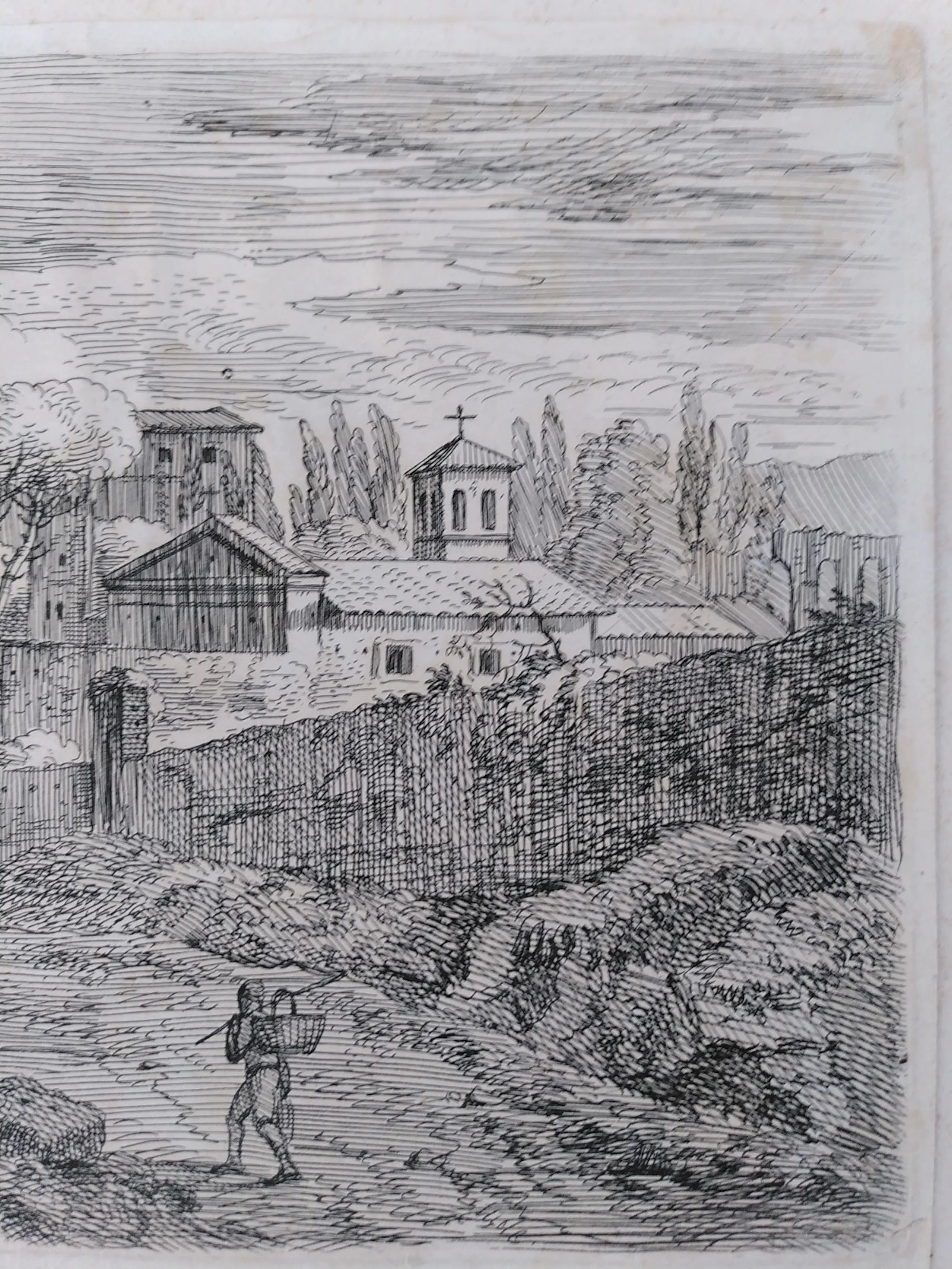 Het betreft een Italiaans landschap met op de voorgrond enkele figuren en op de achtergrond een klooster met monument.