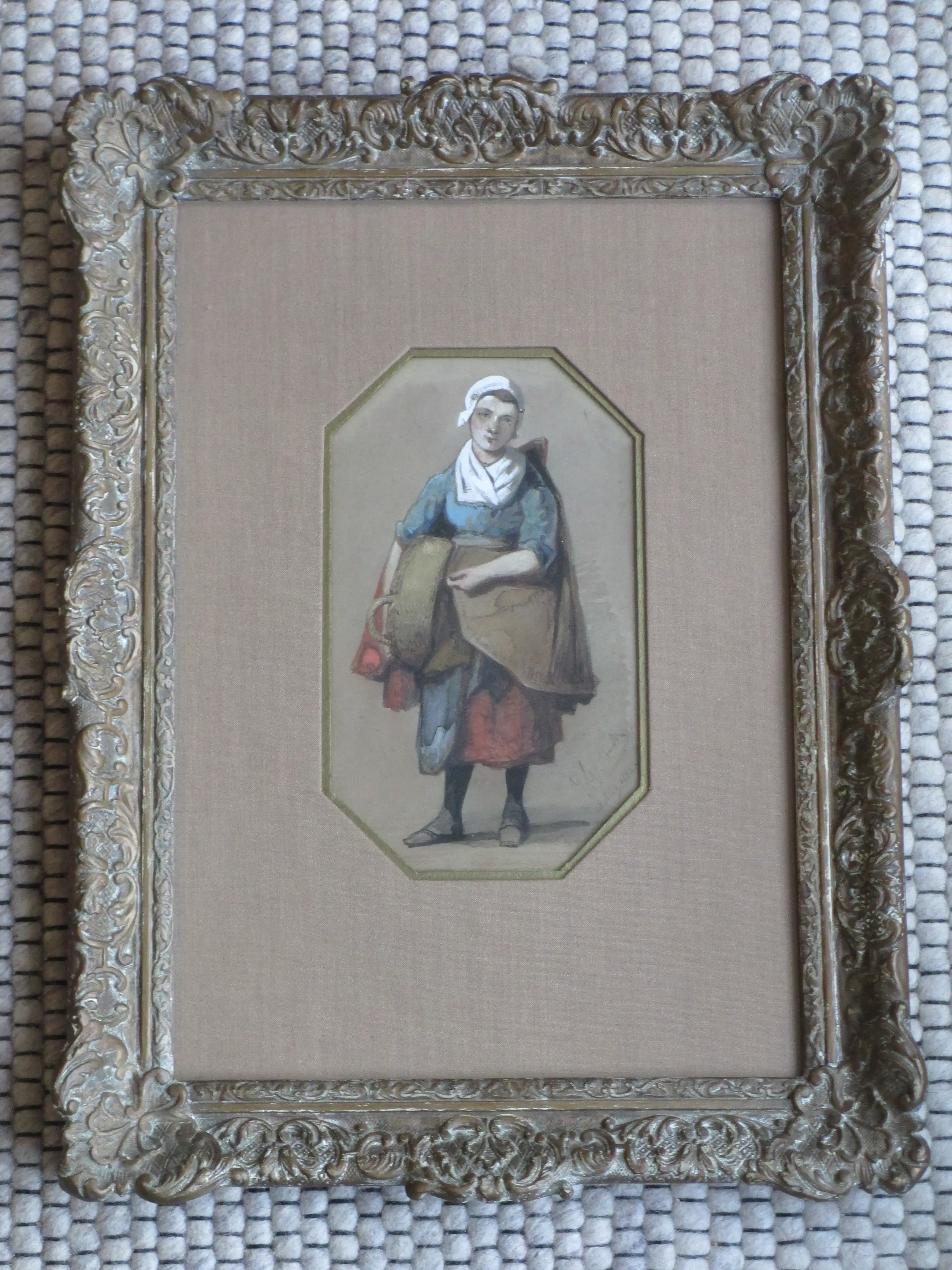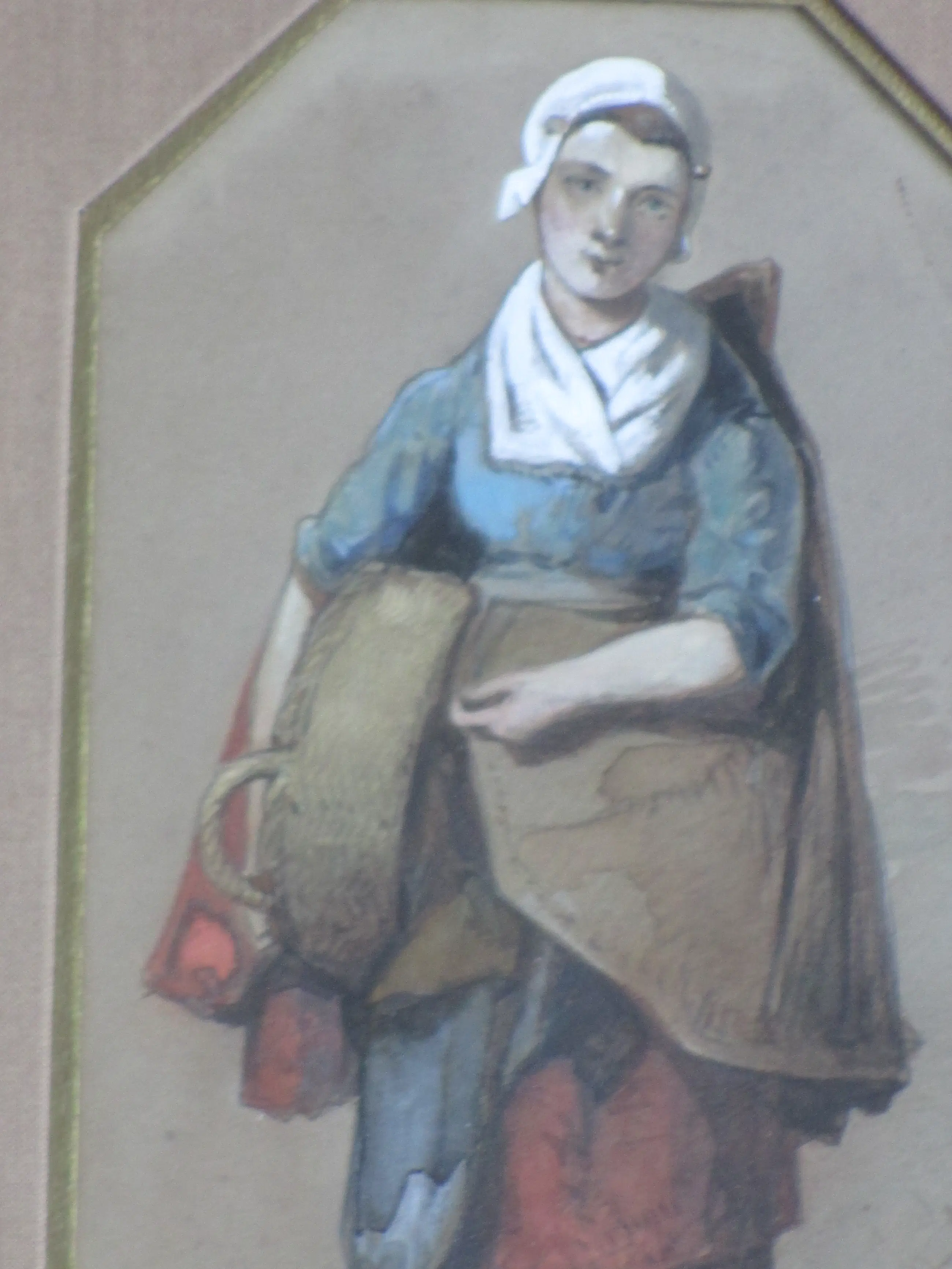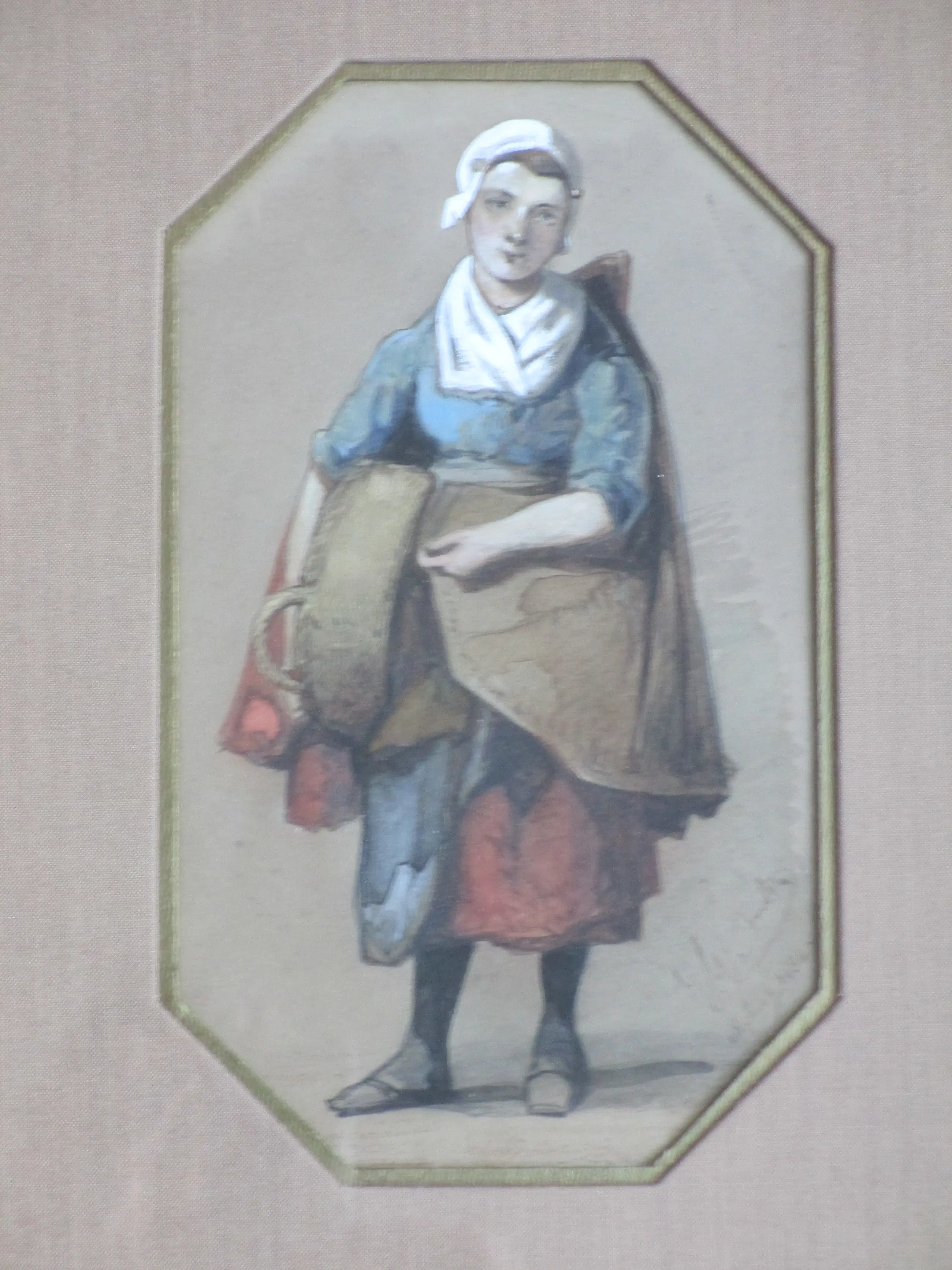 Gemengde techniek door Jan Gerard Smits Voorstelling van een vissersvrouw Gelijst, beeldmaat 20x11, lijstmaat 42x31 Gesoigneerd en gedateerd r.o. in pen: 'J G Smits 18 aug. 1884'