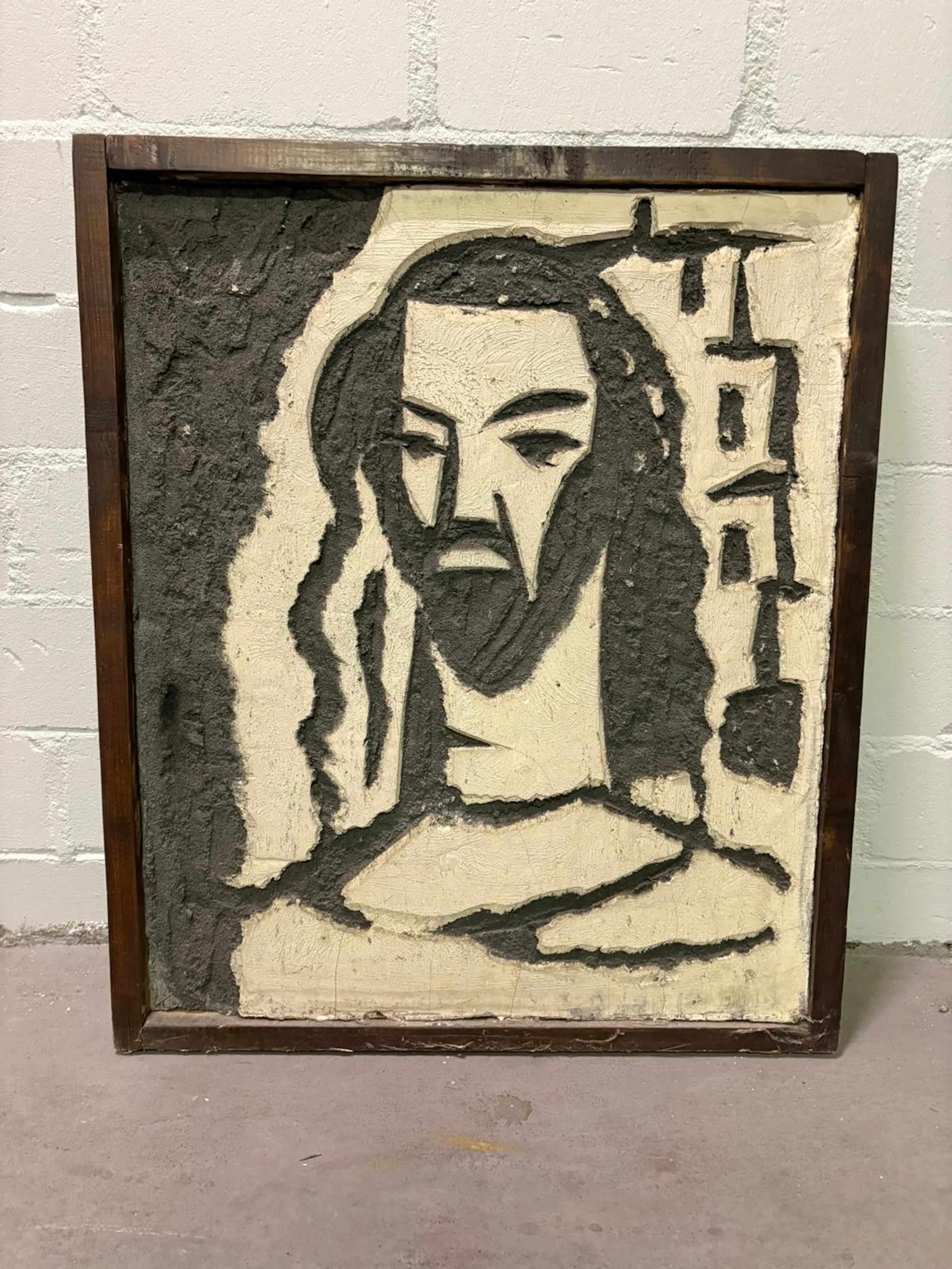 Afbeelding van Jezus Christus. Reliëf in beton en gips. Zeer knap gemaakt. Met minieme lijnen weet de kunstenaar een herkenbaar beeld van een Christusfiguur neer te zetten.