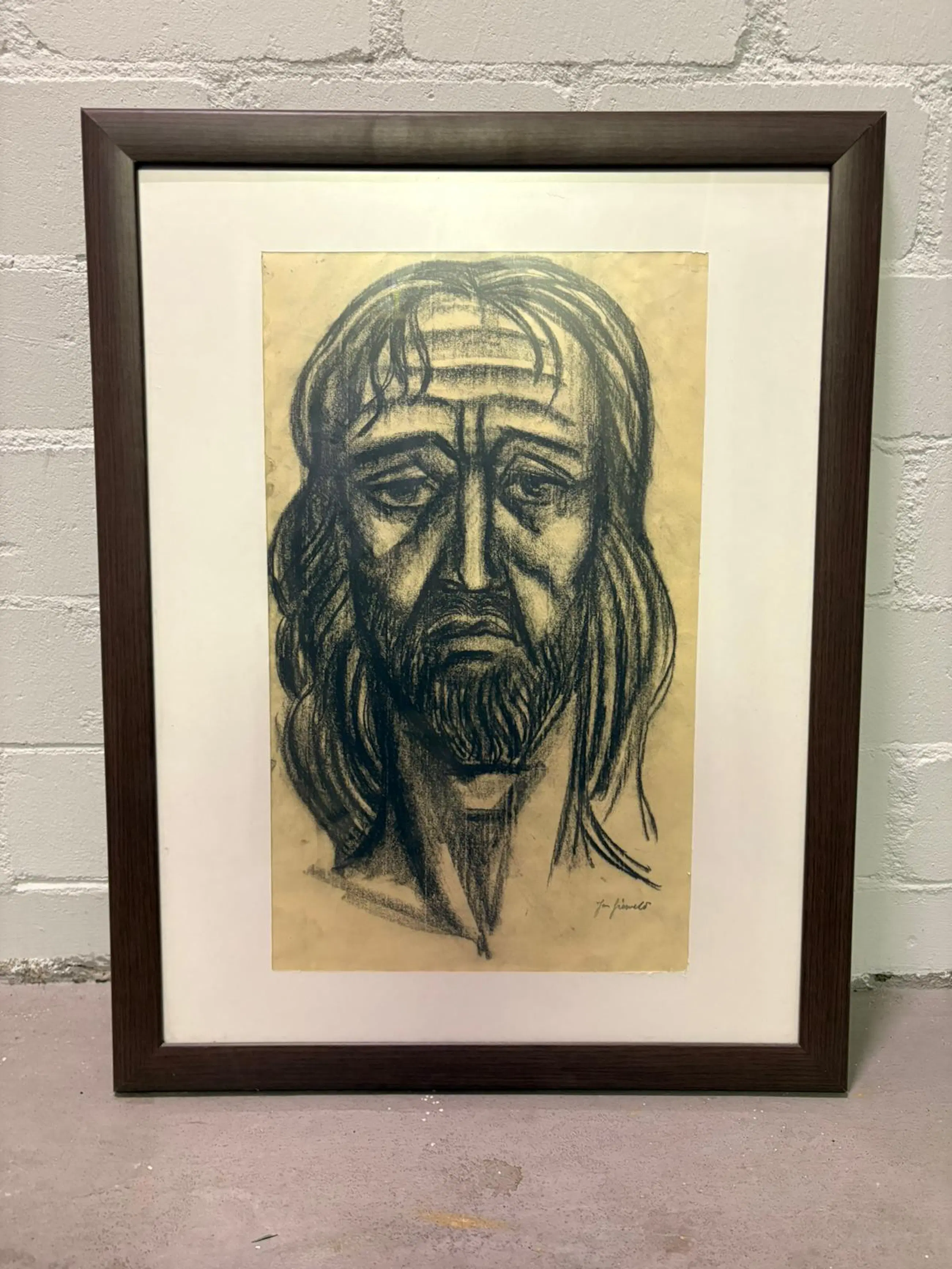 Houtskool of krijttekening van Jezus Christus. In de jaren 70 in familiebezit gekomen als geschenk van de kunstenaar, Jan Gierveld, zelf aan een bevriend familielid.