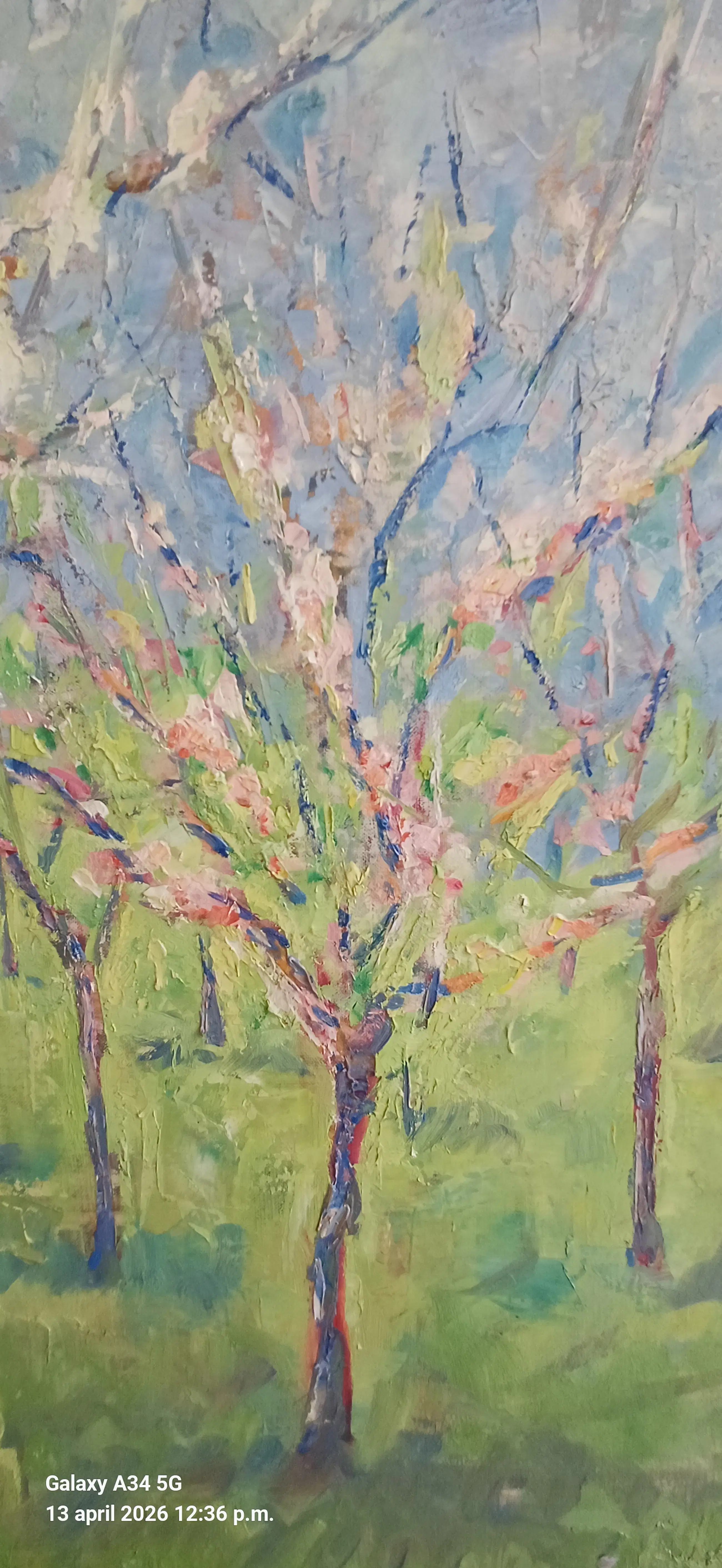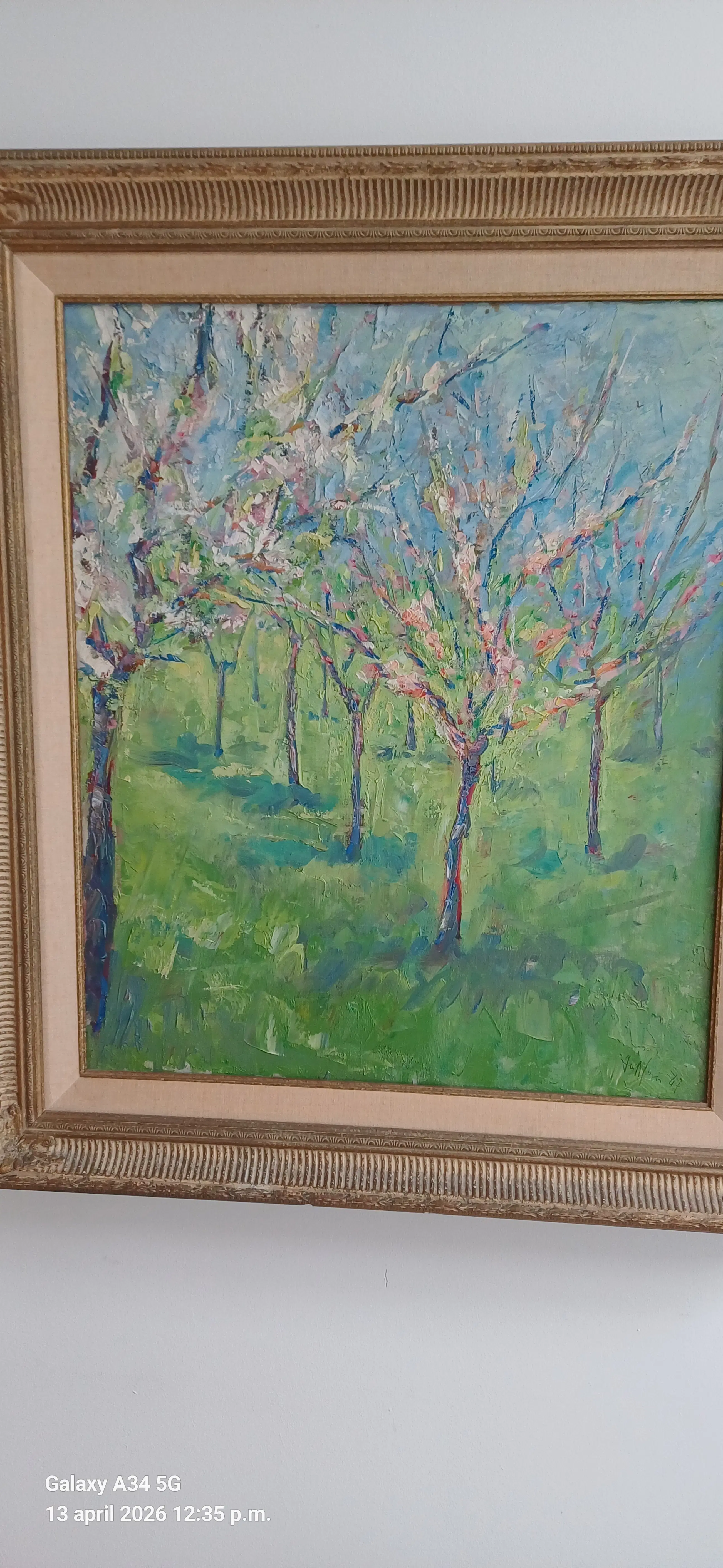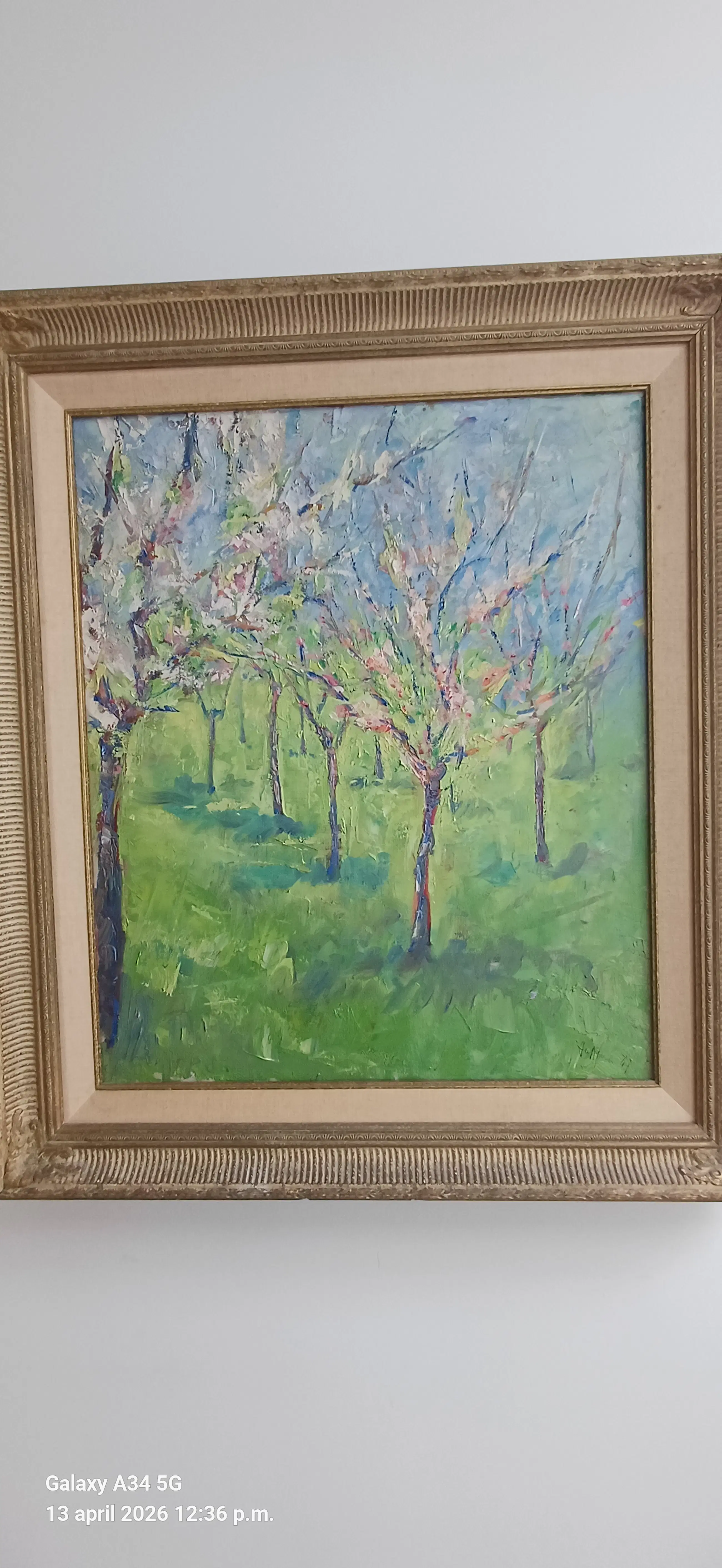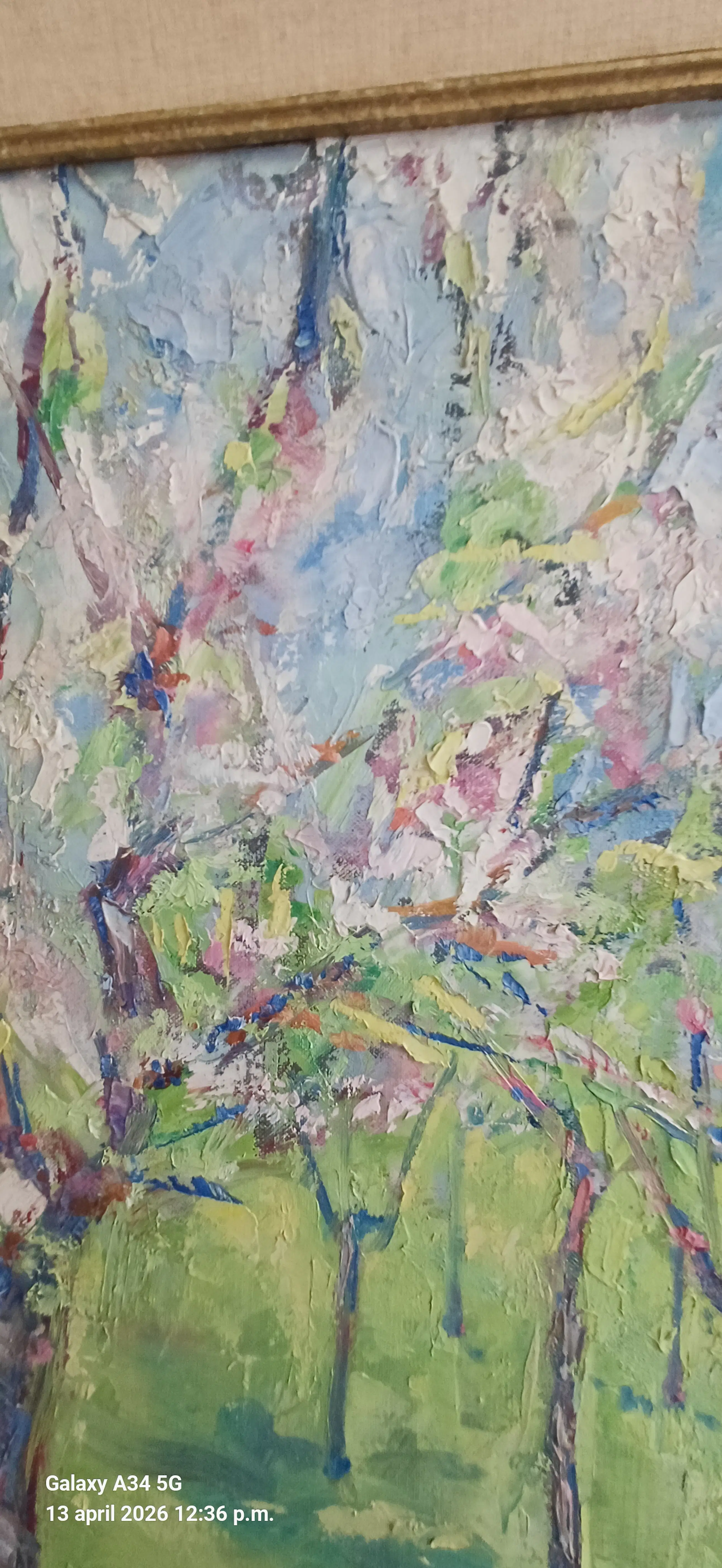 Fris en vlot geschilderd impressionistisch werk van Jan Giesen, voorstellende bloeiende fruitbomen mogelijk in de Betuwe. Heldere uitgesproken kleuren in uitstekende staat uit rookvrij huishouden. Voorzien van origineel aankoopbewijs gedateerd 1991 afkomstig van kunsthandel J.van den Elshout, Den Haag.