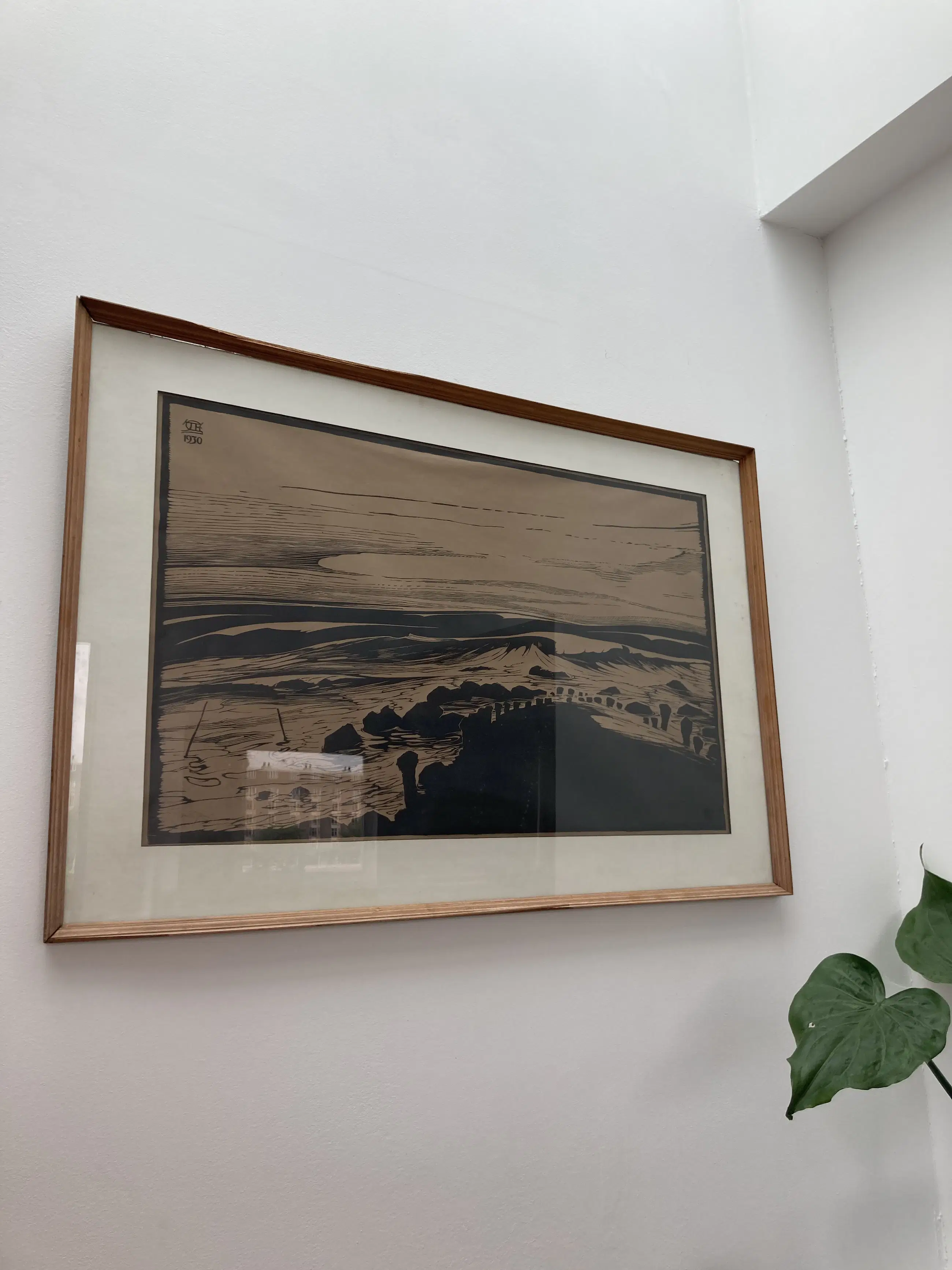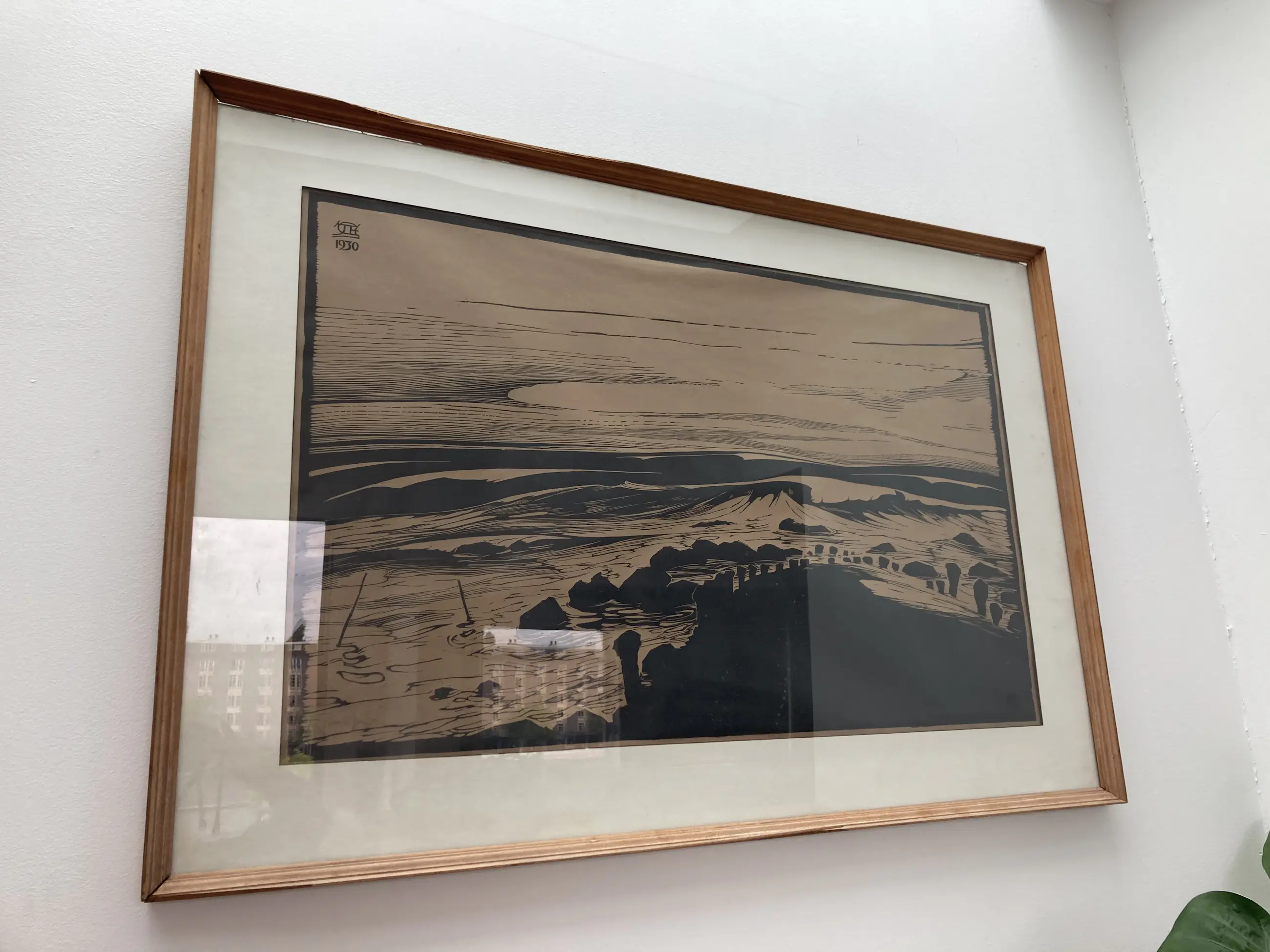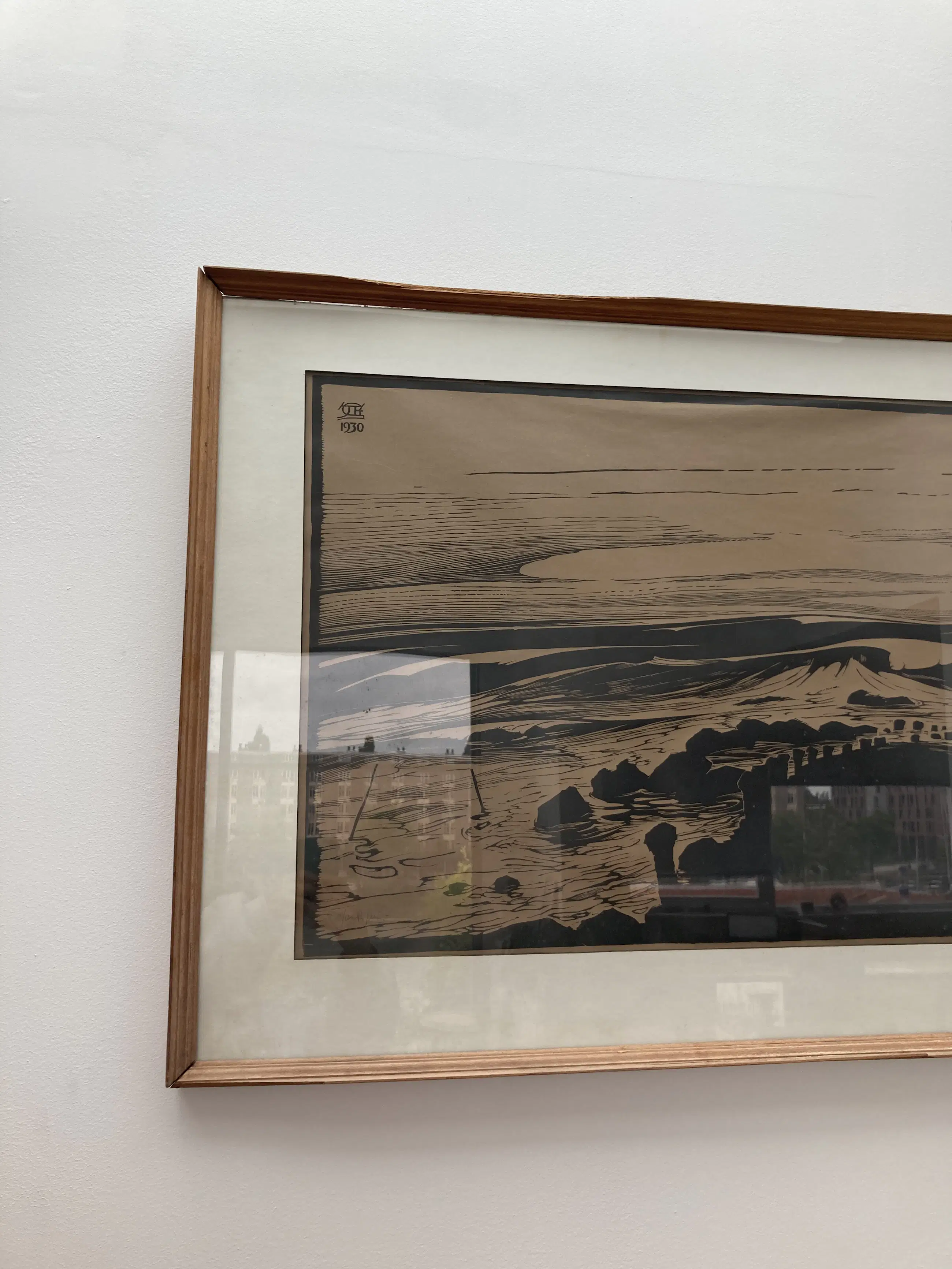 Kustgezicht Houtsnede 1930 53 x 84 cm 73 x 107 cm Lijst heeft beschadigingen.
